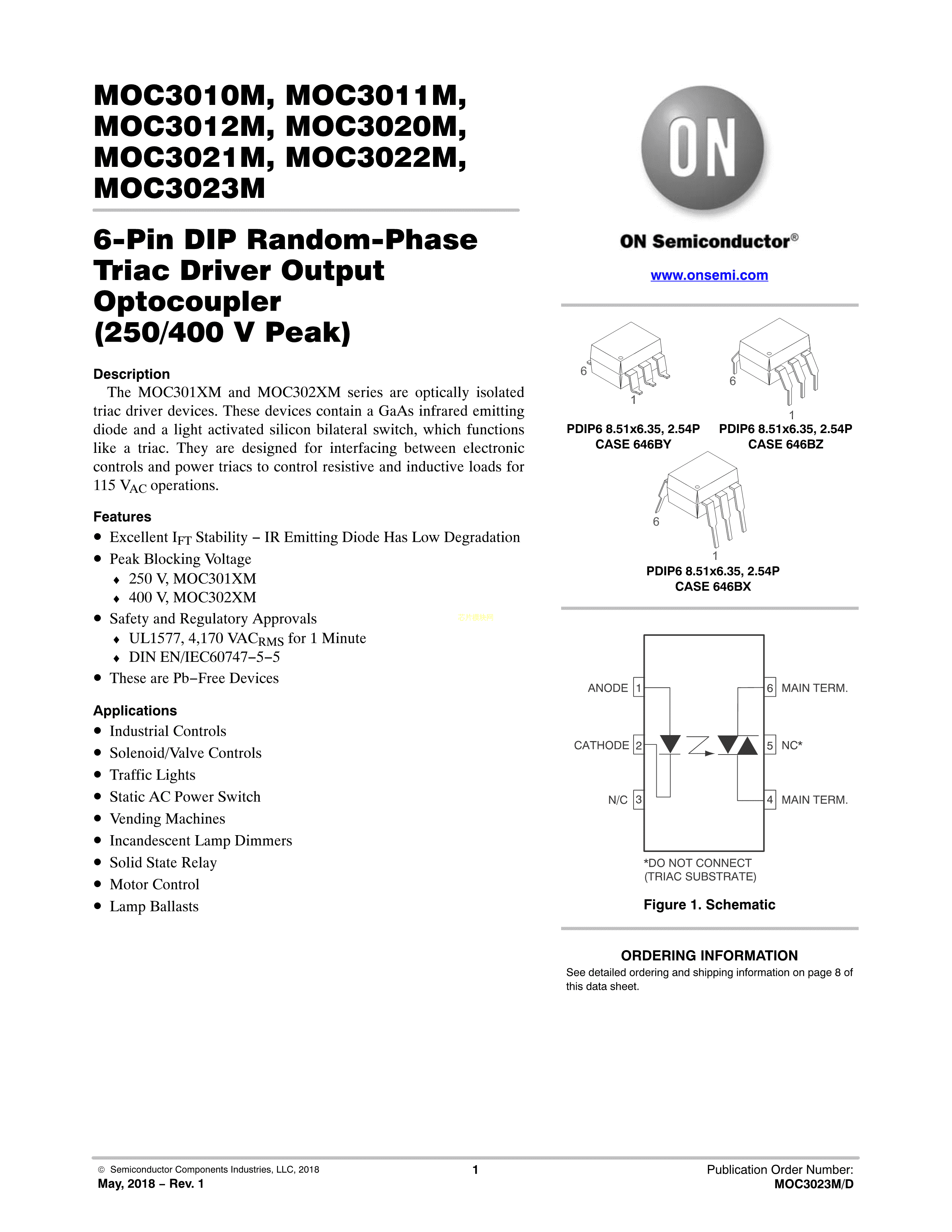 MOC3020SM数据手册SMT-6封装onsemi(安森美)PDF规格书,中英文下载