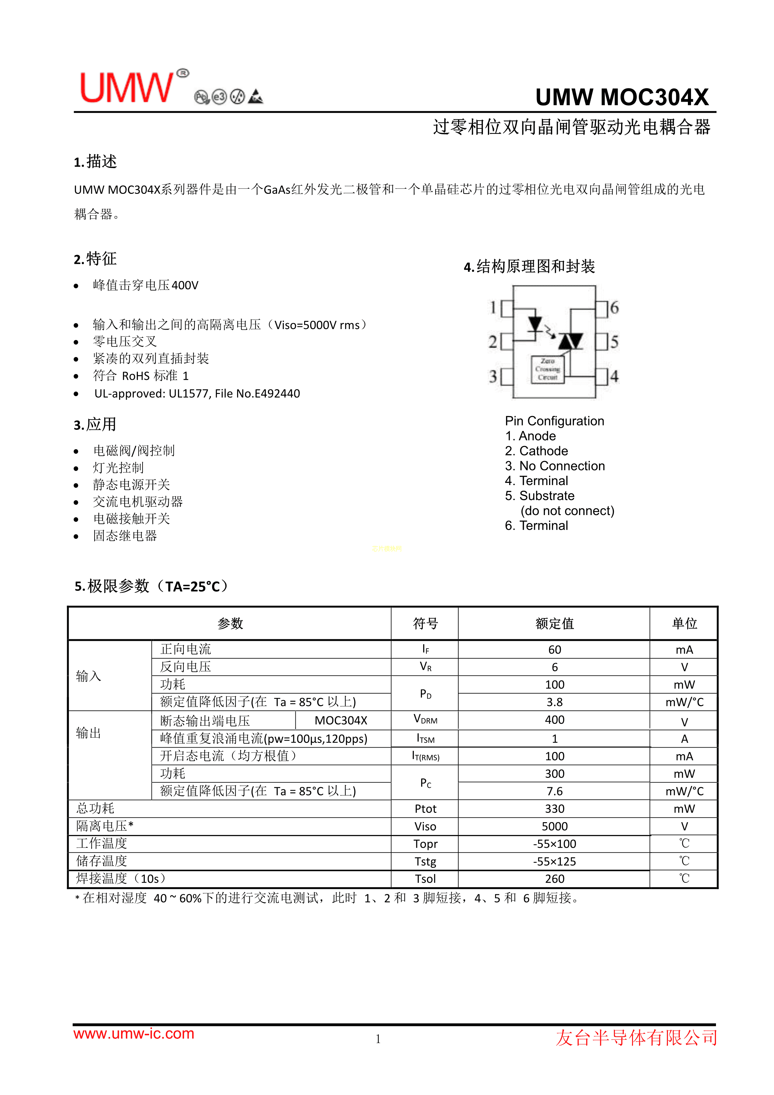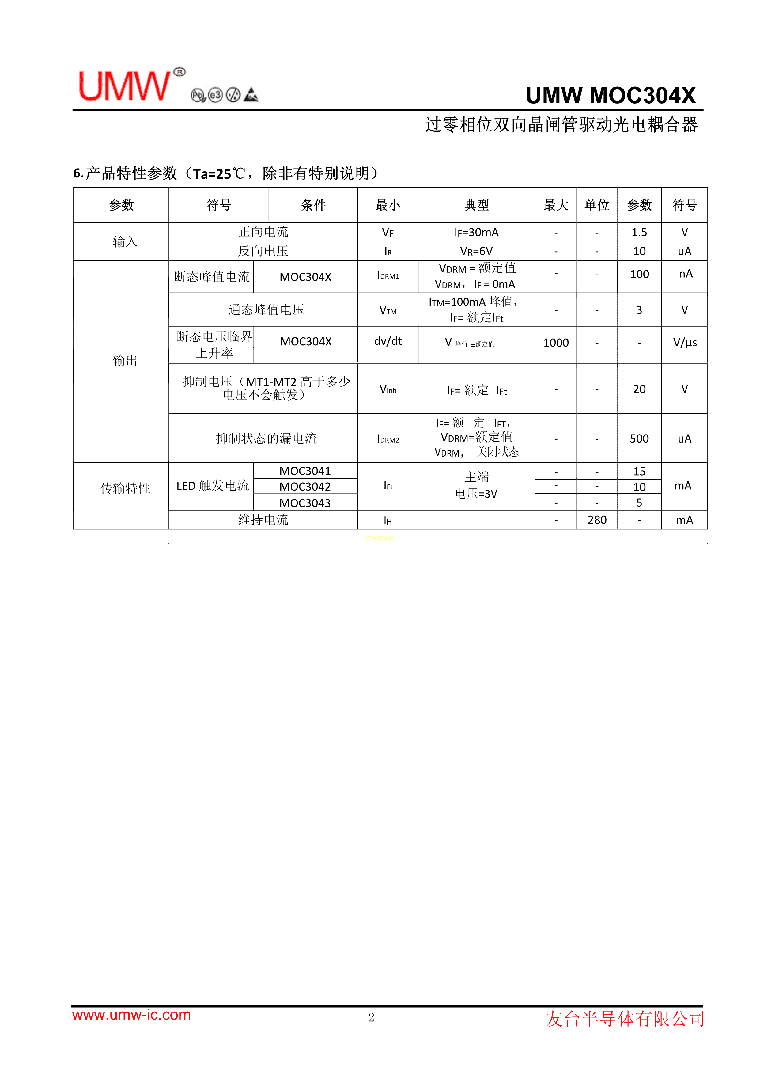 MOC3041M数据手册DIP-6封装UMW(友台半导体)PDF规格书,中英文下载