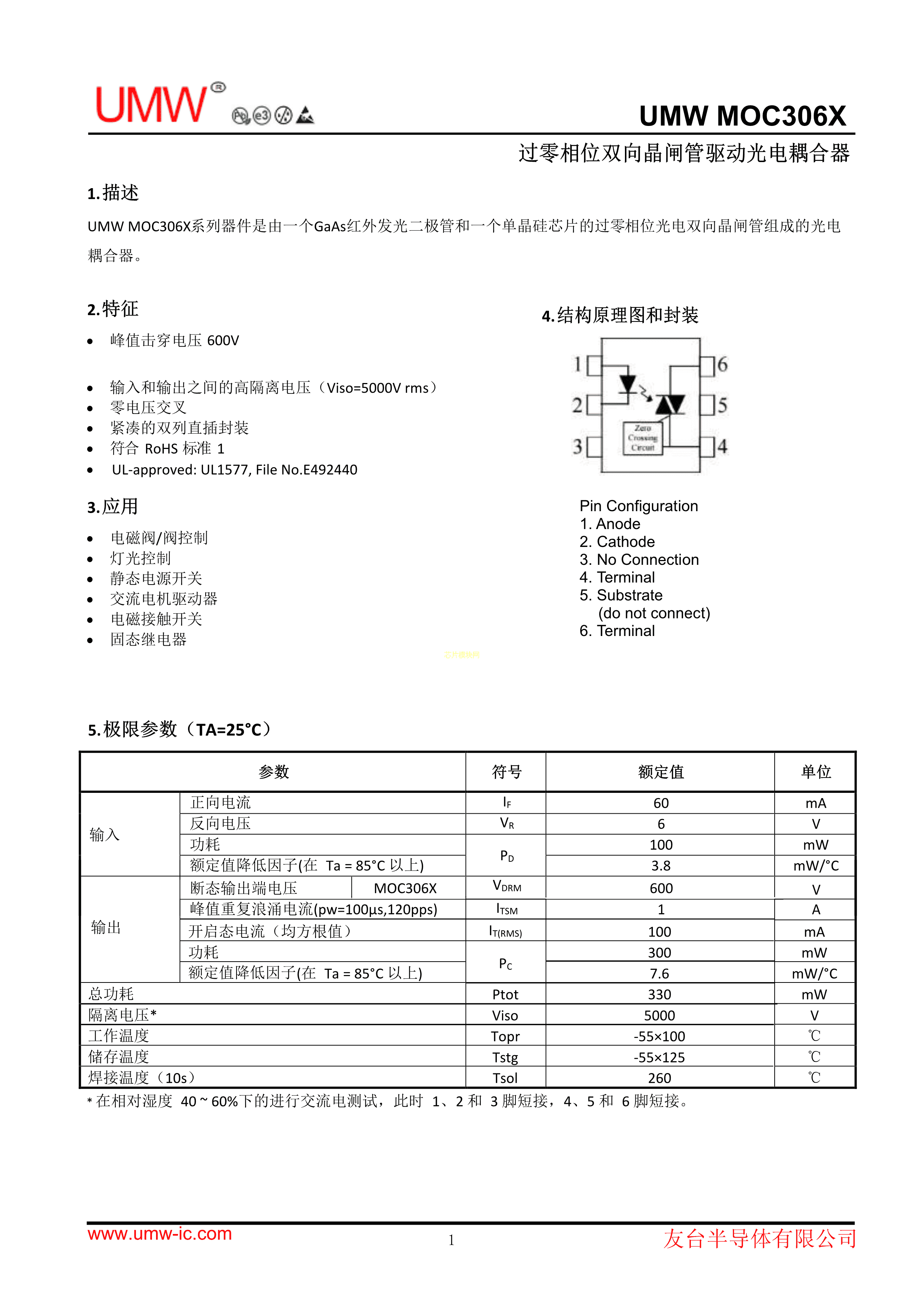 MOC3063M数据手册DIP-6封装UMW(友台半导体)PDF规格书,中英文下载
