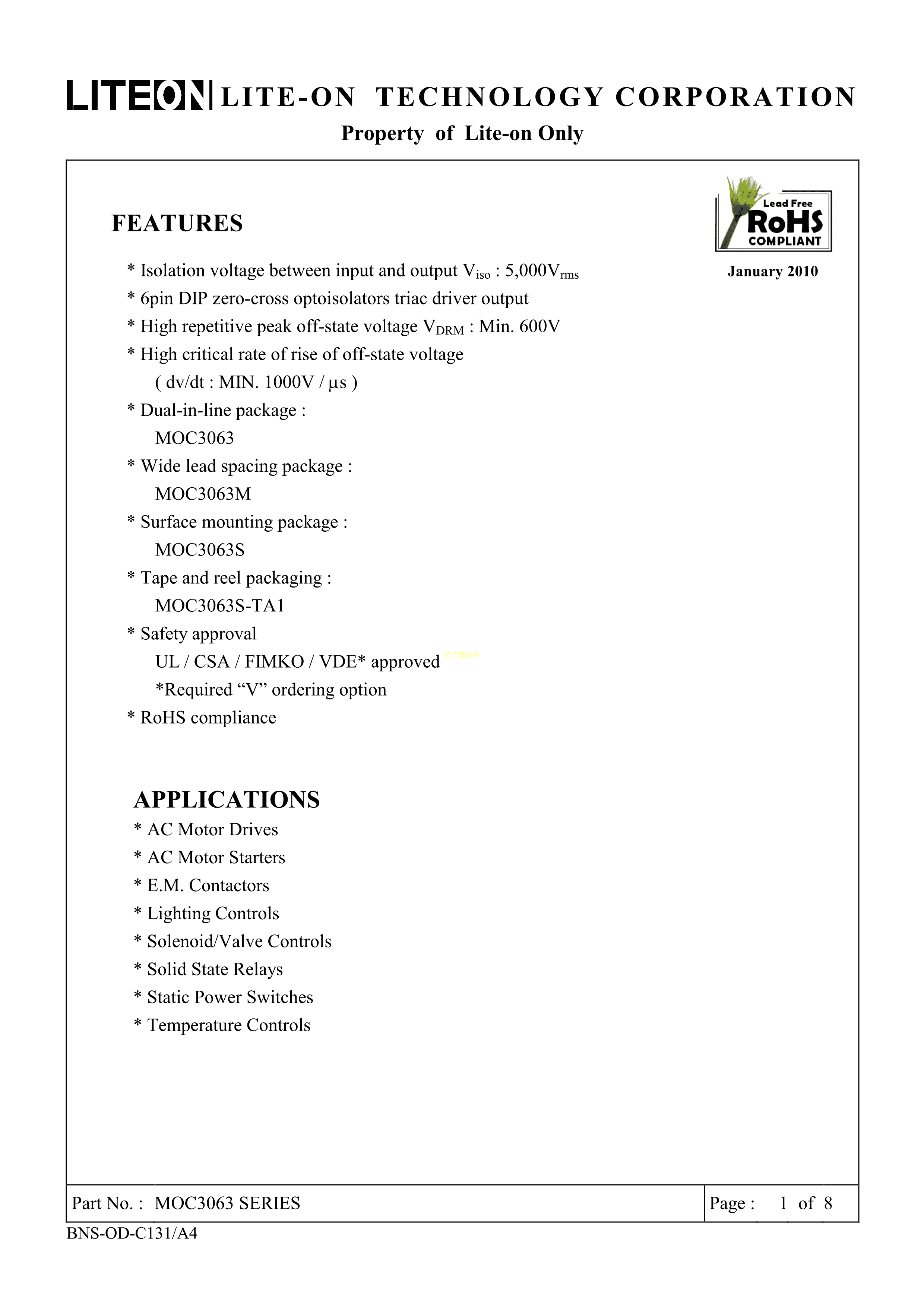 MOC3063S-TA1数据手册SMD-6封装LITEON(台湾光宝)PDF规格书,中英文下载