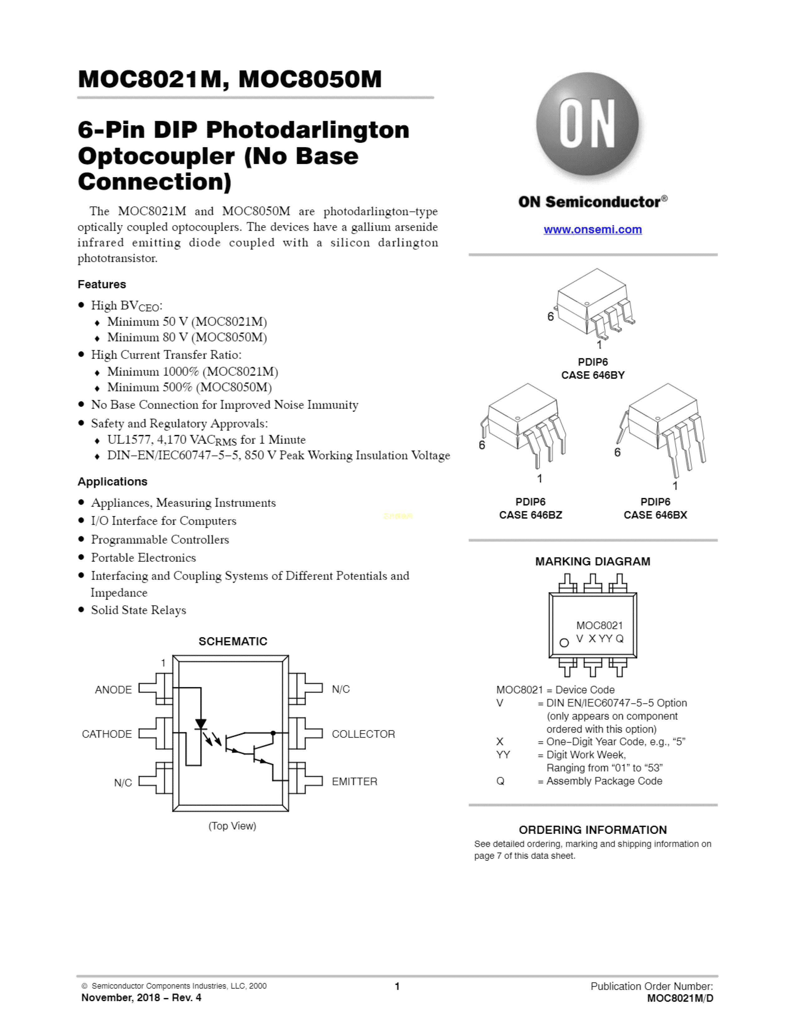 MOC8021M数据手册DIP-6封装onsemi(安森美)PDF规格书,中英文下载