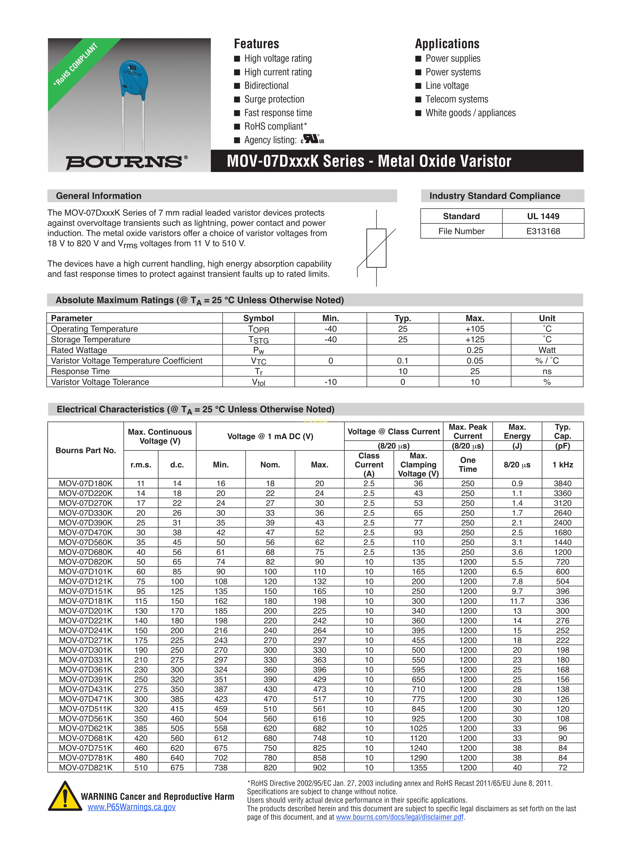 MOV-07D681K数据手册径向引线封装BOURNSPDF规格书,中英文下载
