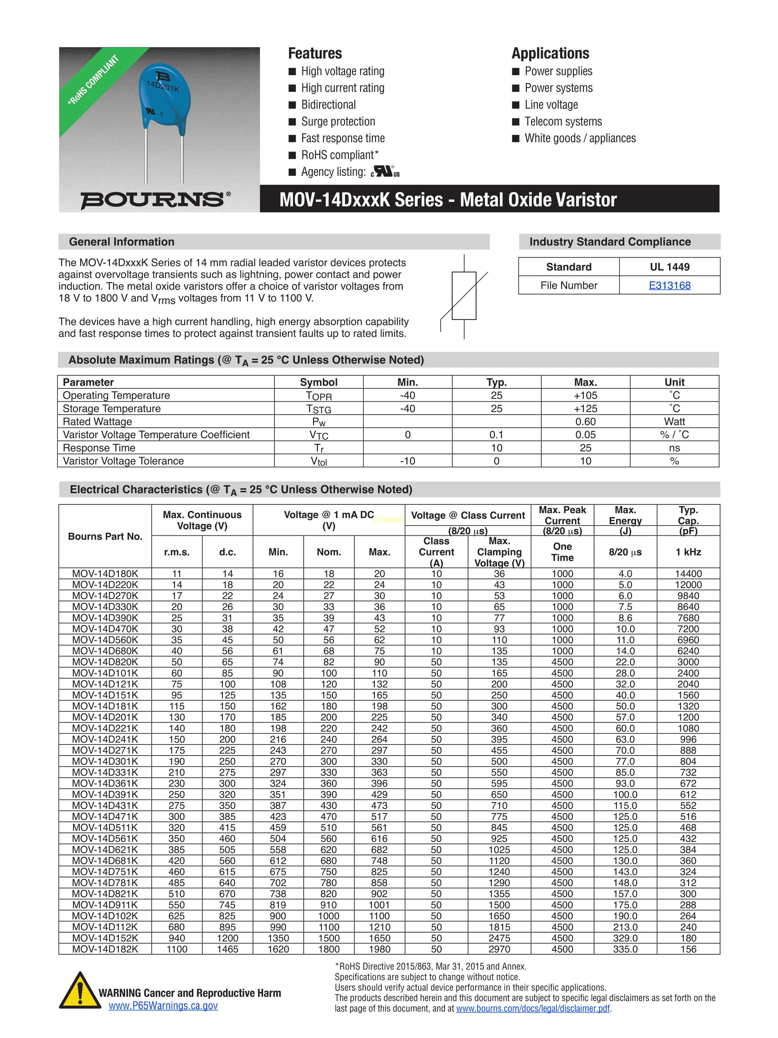 MOV-14D181KTR数据手册径向引线封装BOURNSPDF规格书,中英文下载