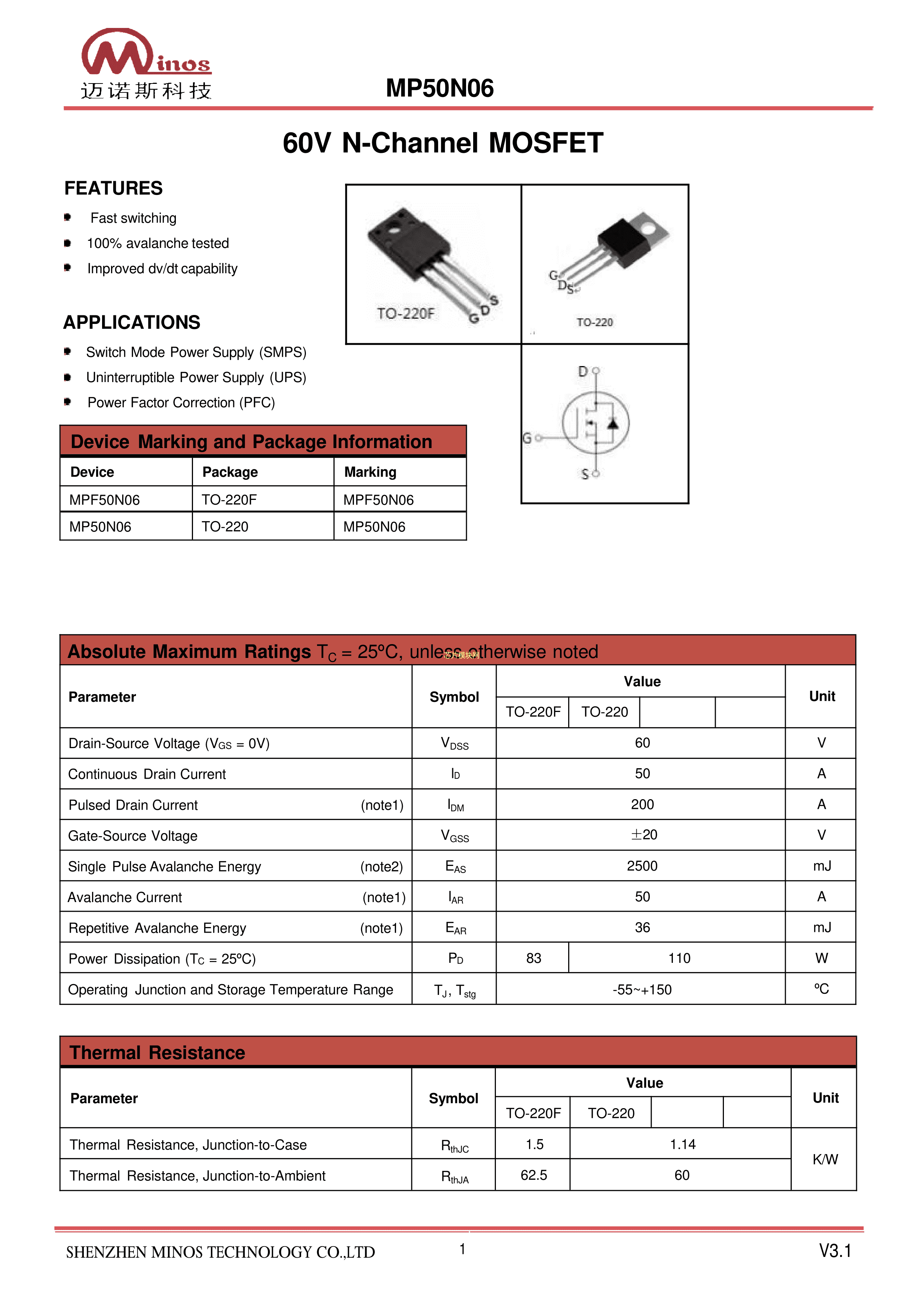 MP50N06数据手册TO-220封装minos(迈诺斯)PDF规格书,中英文下载