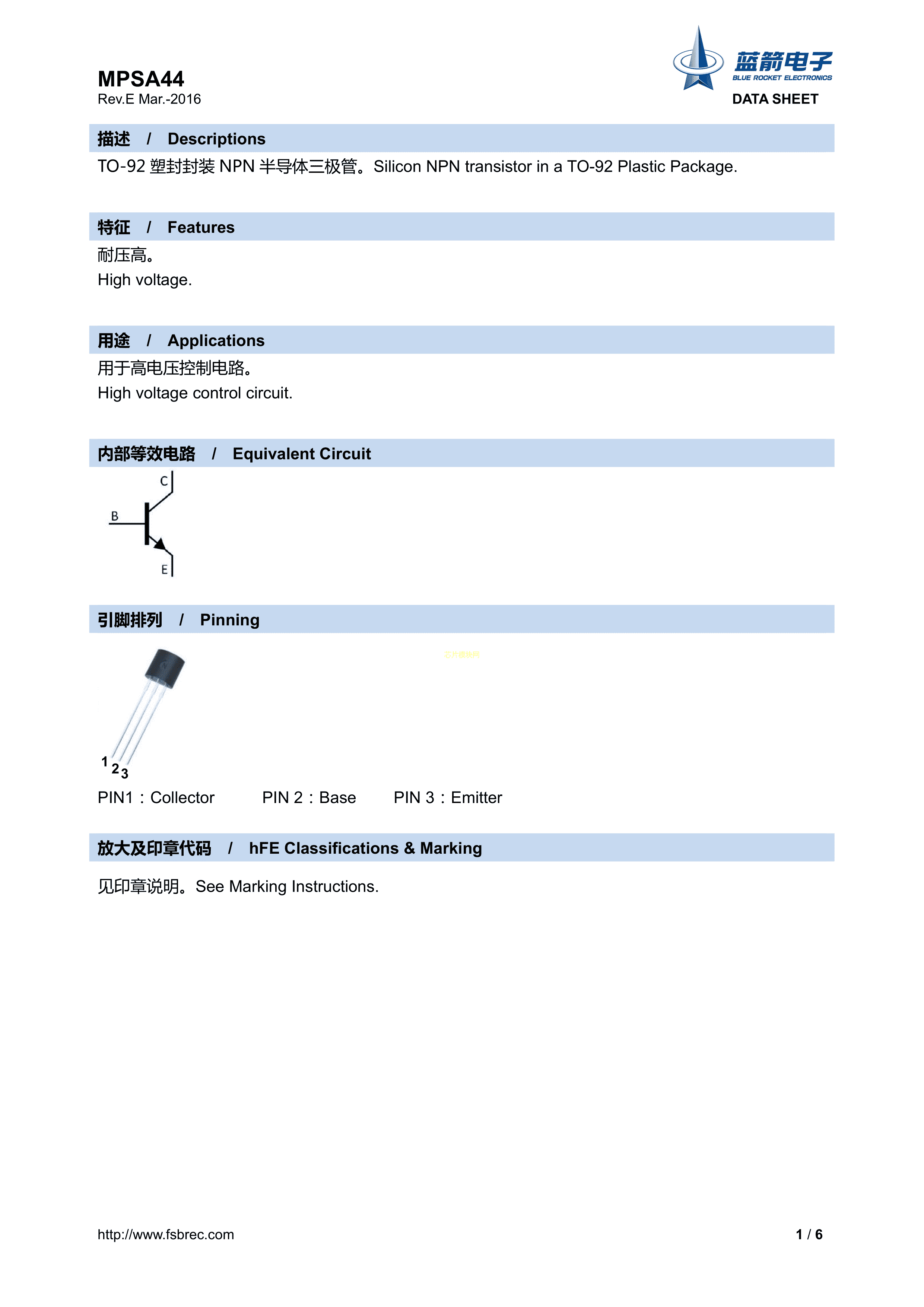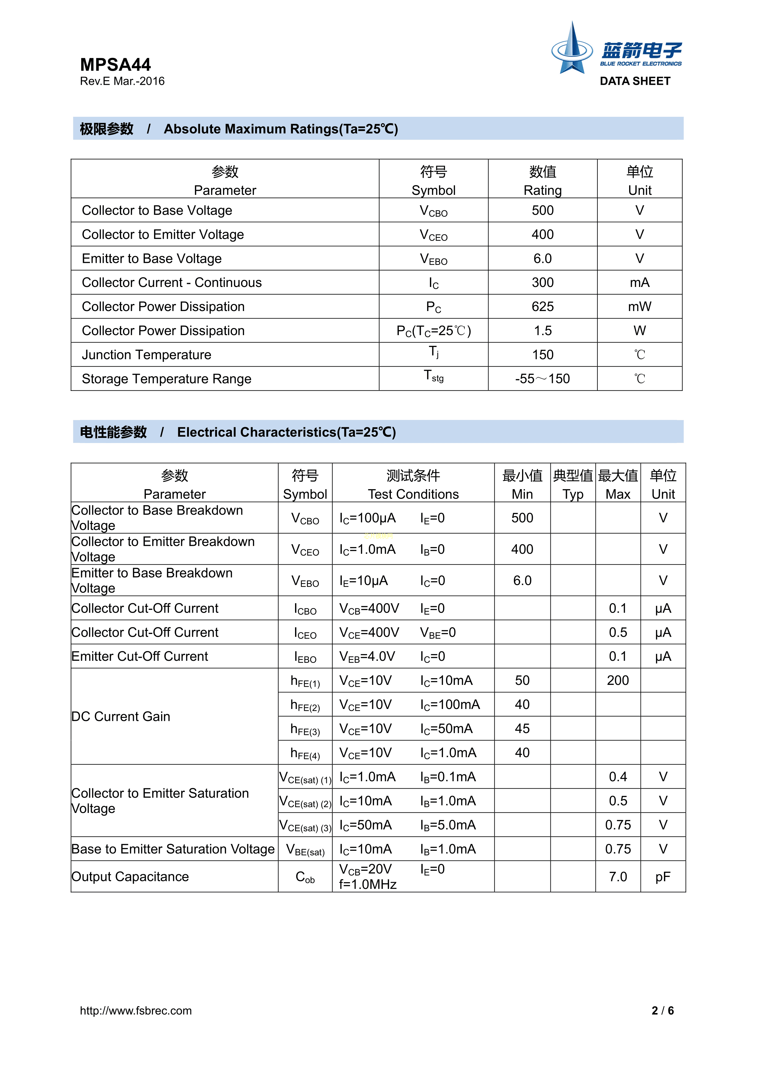 MPSA44数据手册TO-92封装BLUE ROCKET(蓝箭)PDF规格书,中英文下载