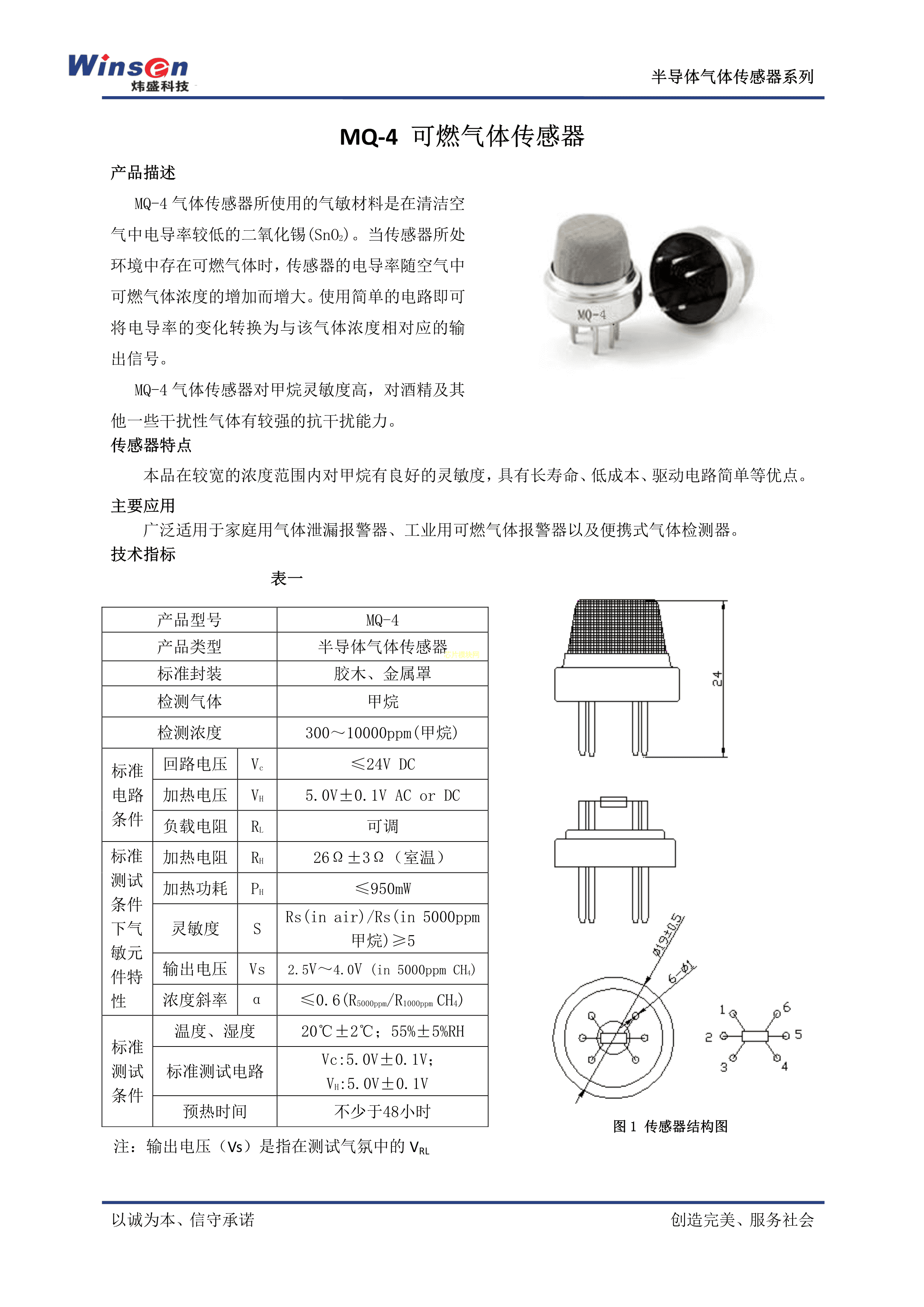 MQ-4数据手册ThroughHole封装Winsen(炜盛)PDF规格书,中英文下载