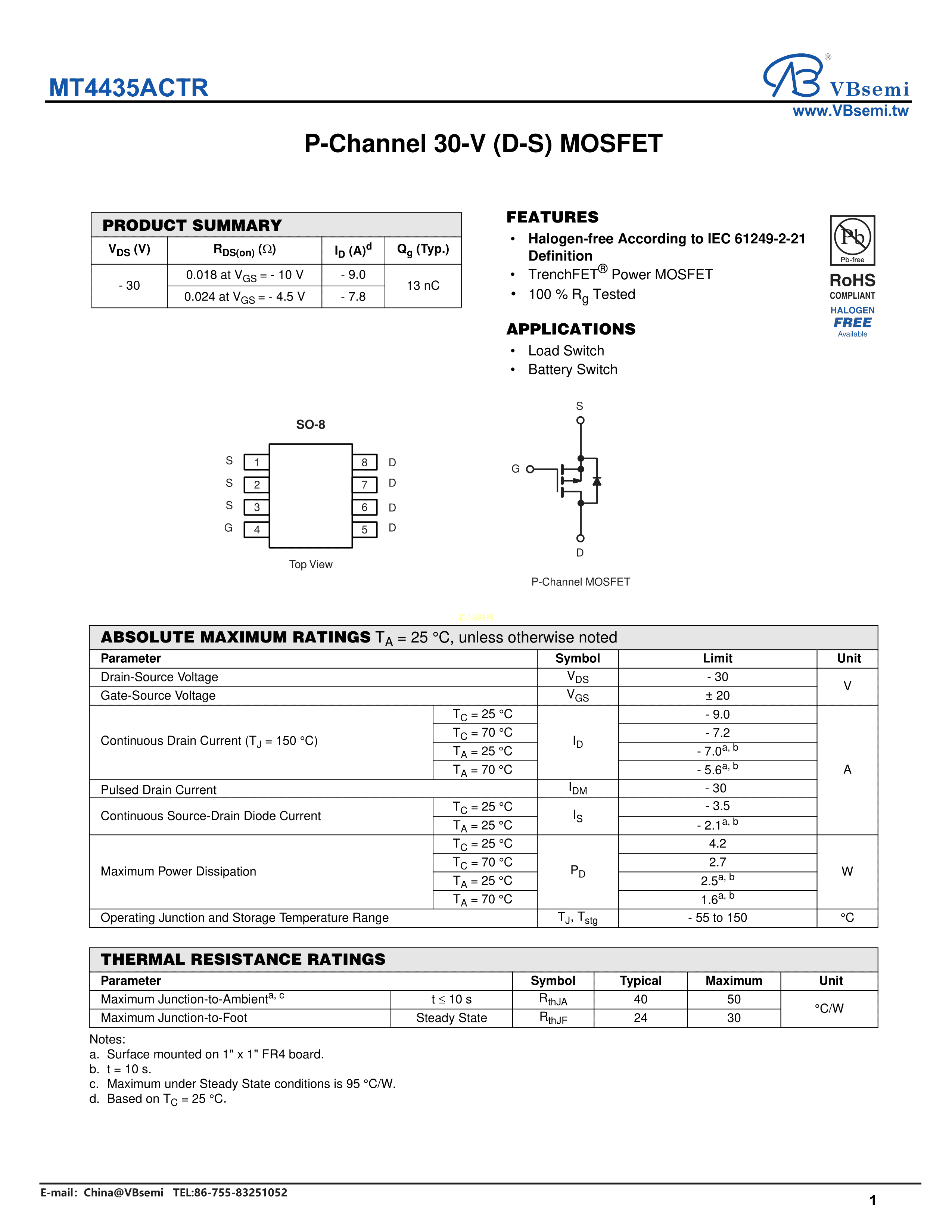 MT4435ACTR数据手册SOP-8封装VBsemi(台湾微碧)PDF规格书,中英文下载