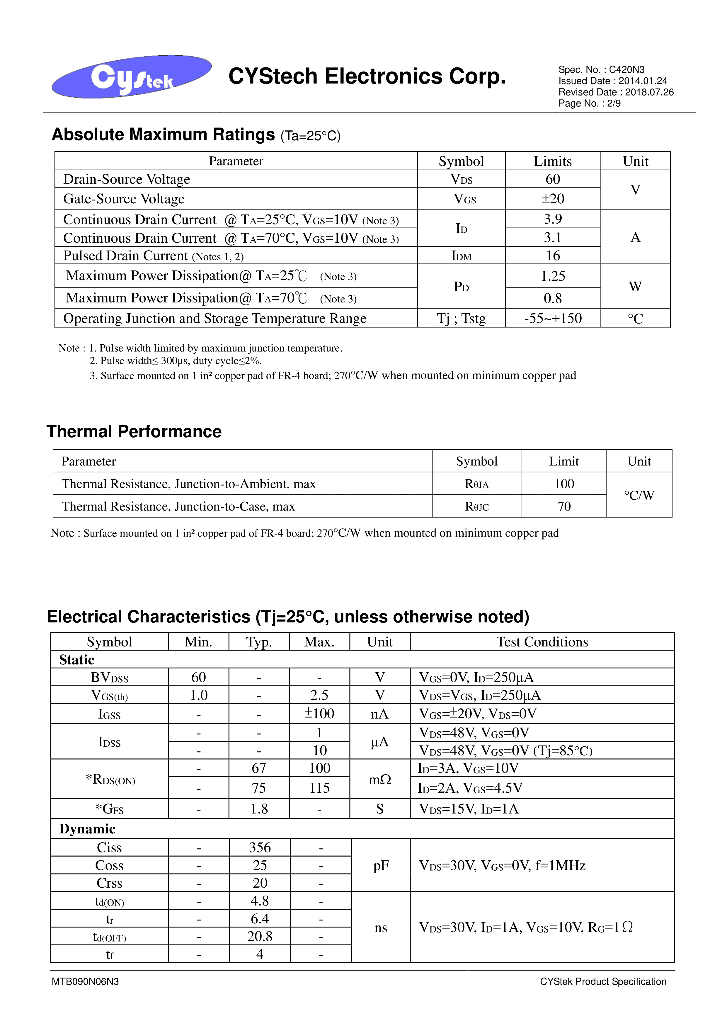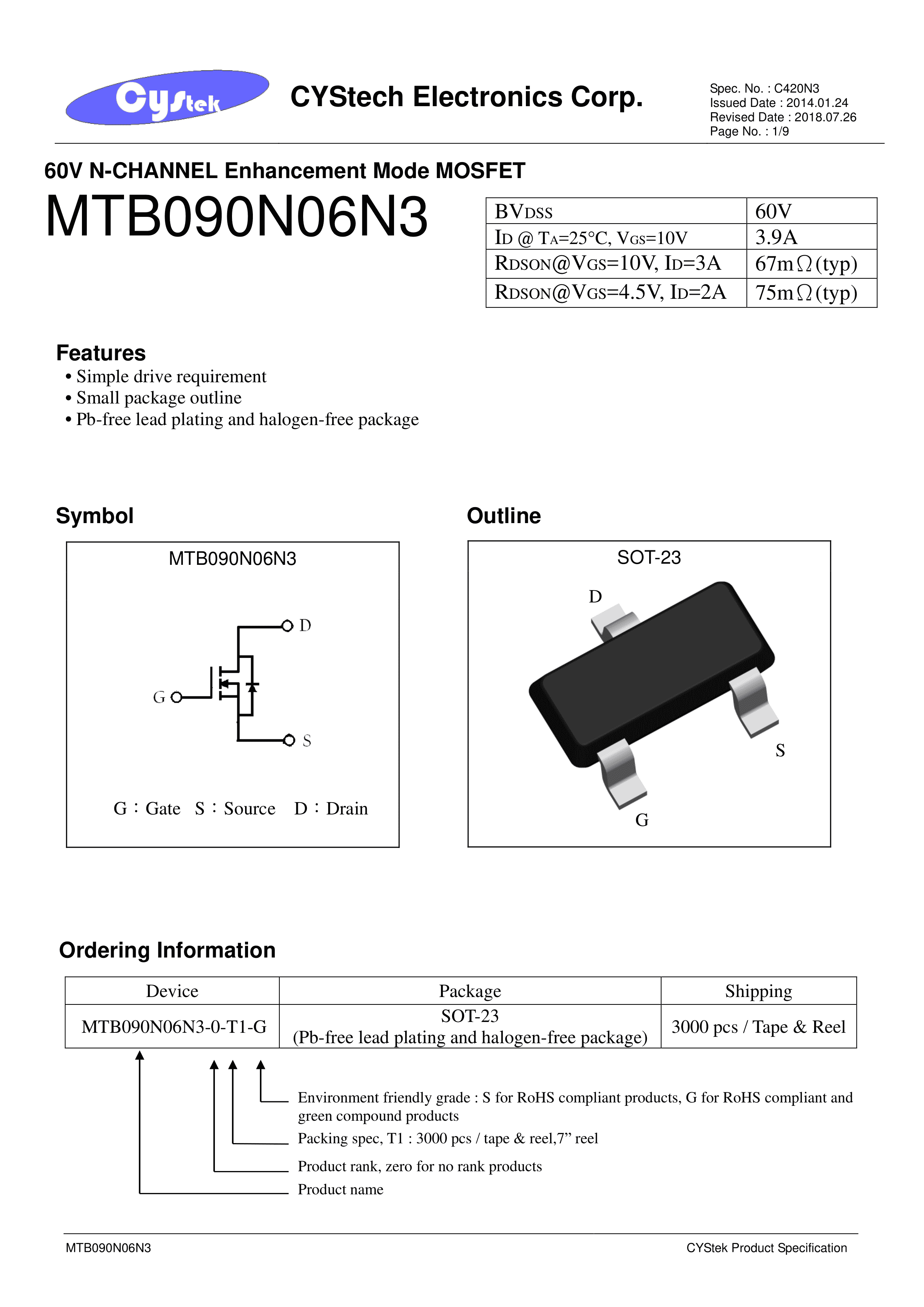MTB090N06N3数据手册SOT-23封装CYSTECH(全宇昕)PDF规格书,中英文下载