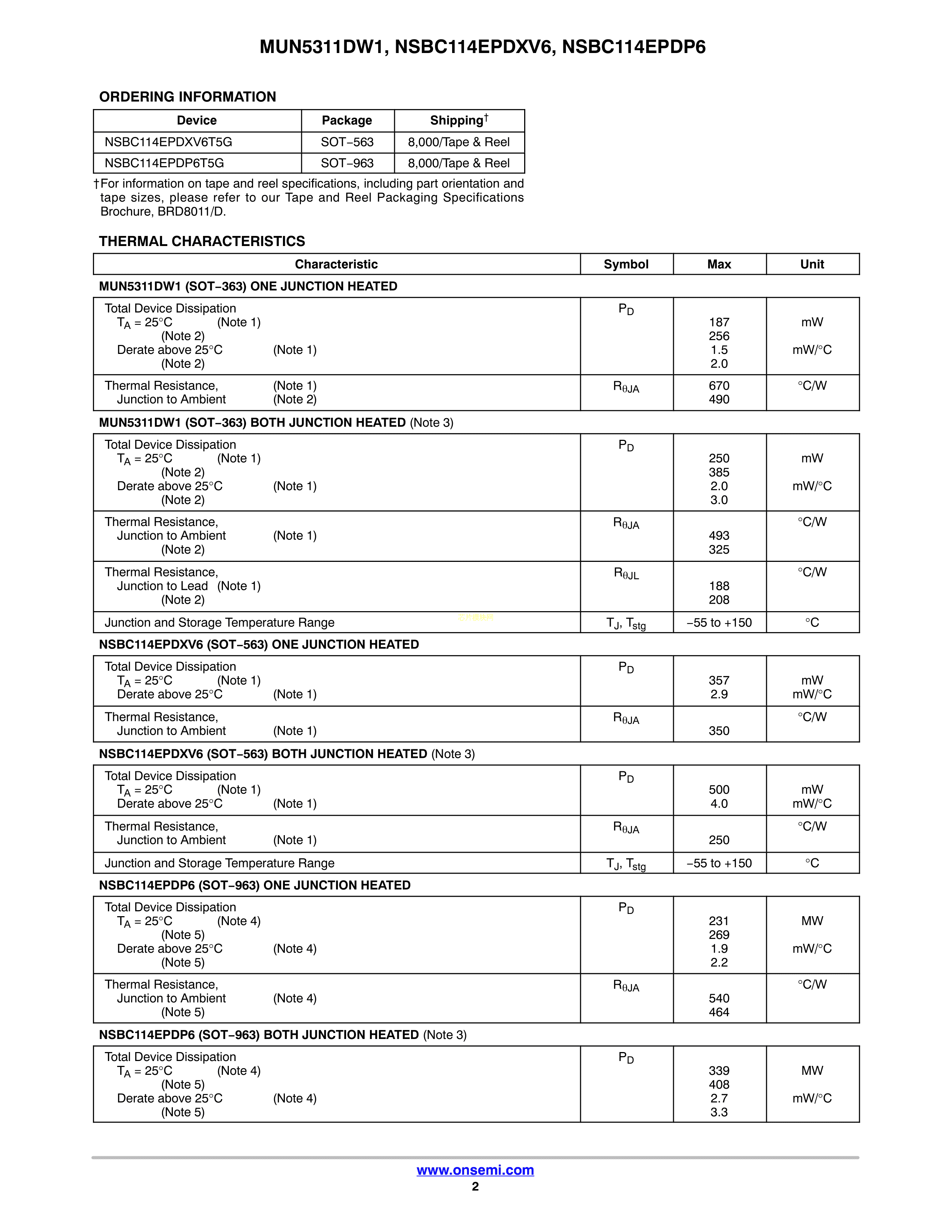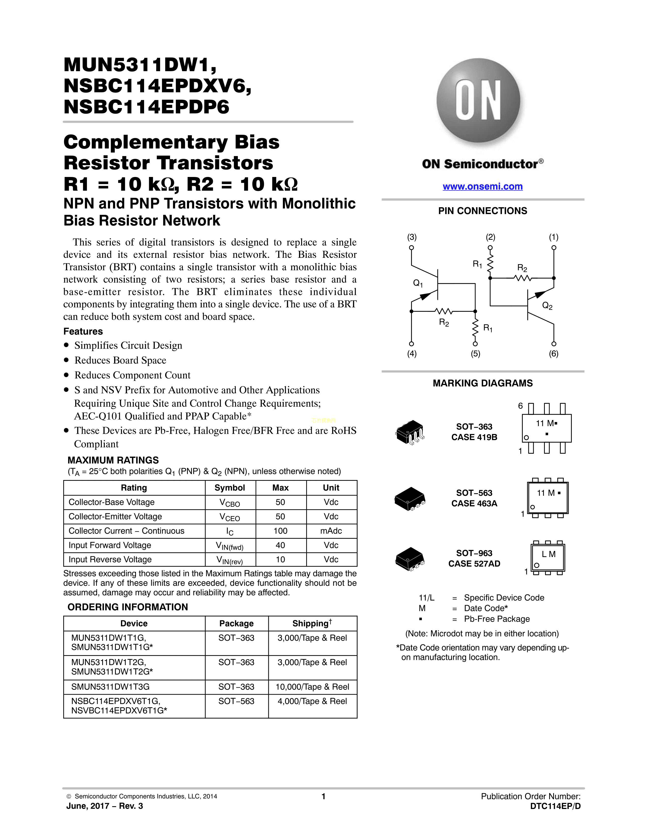 MUN5311DW1T1G数据手册SC-70-6(SOT-363)封装onsemi(安森美)PDF规
