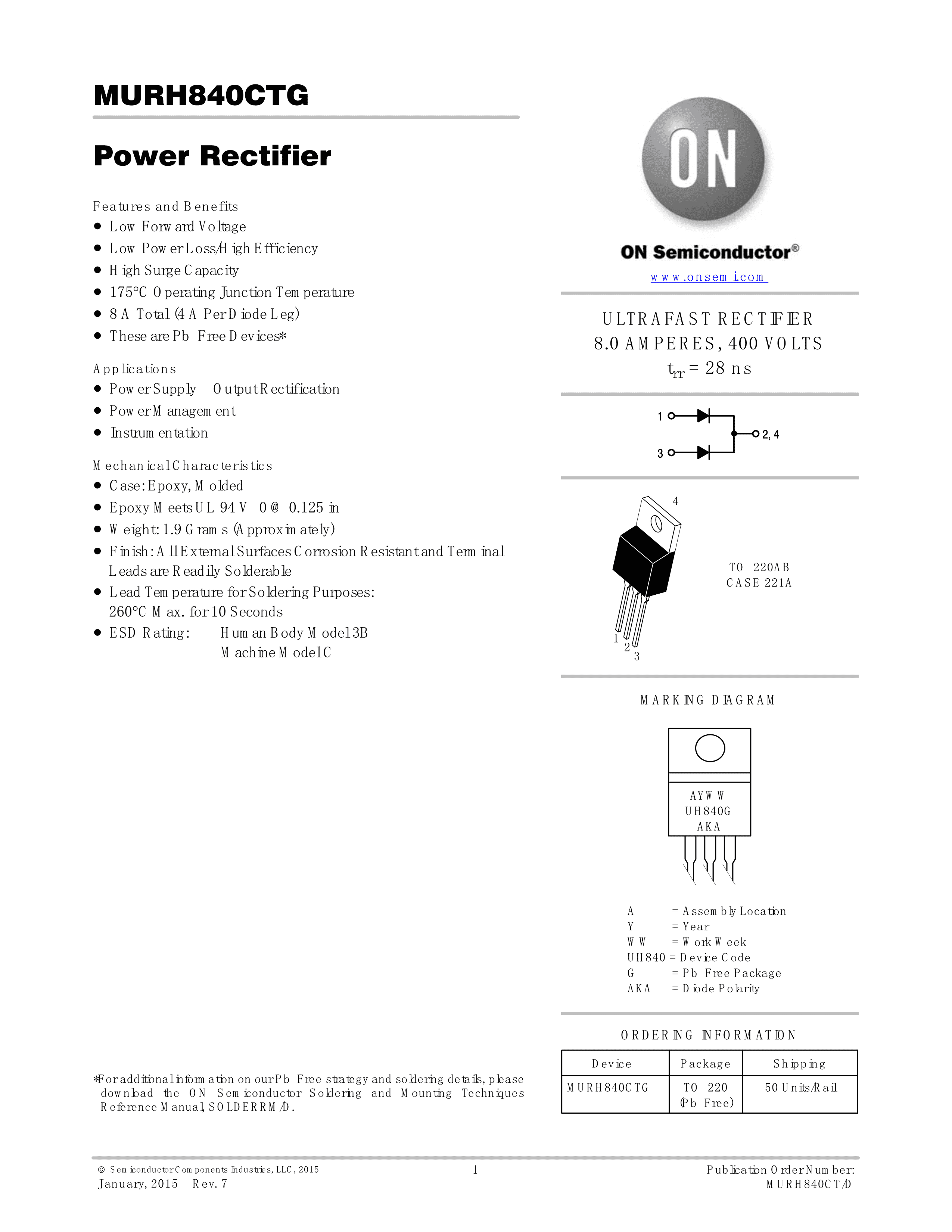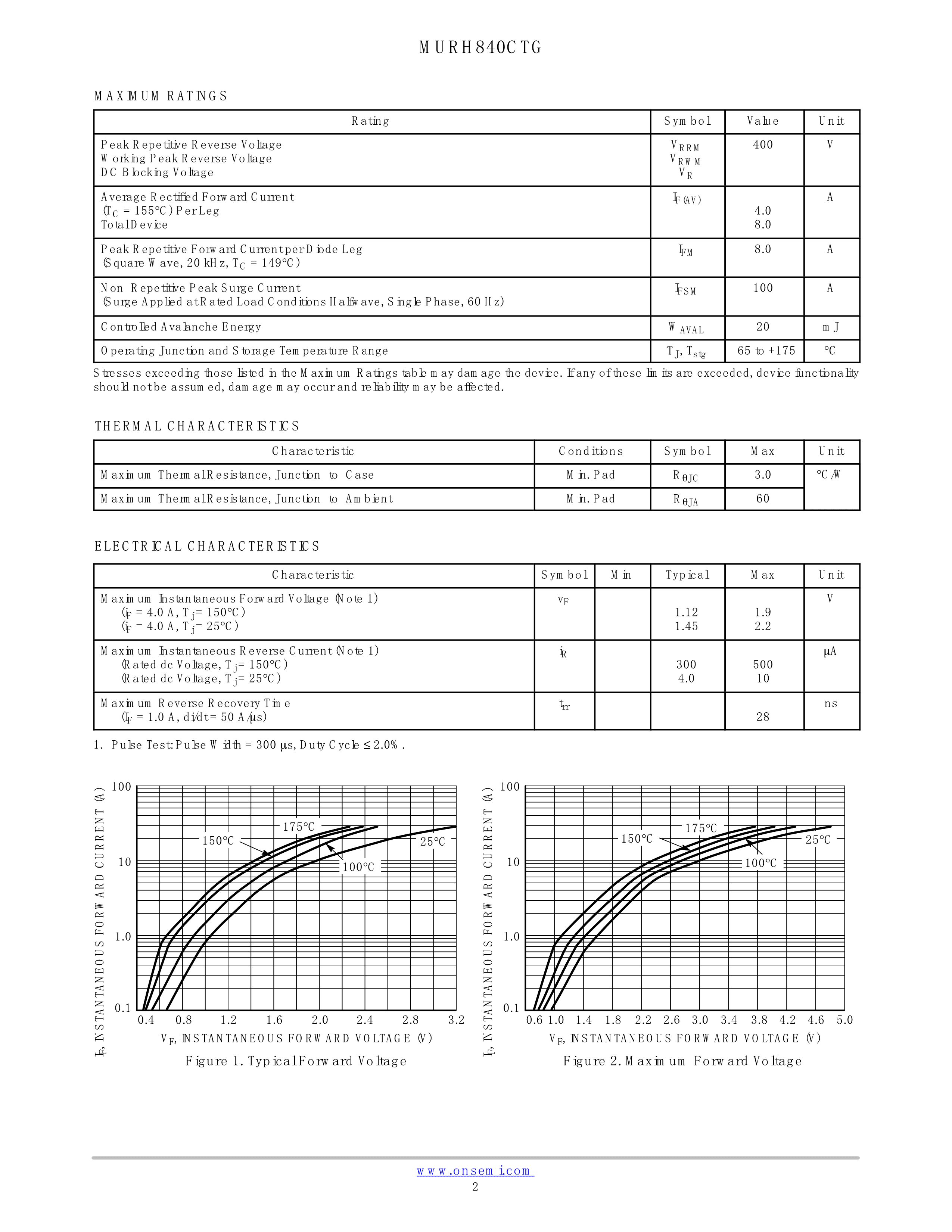 MURH840CTG数据手册TO-220封装onsemi(安森美)PDF规格书,中英文下载