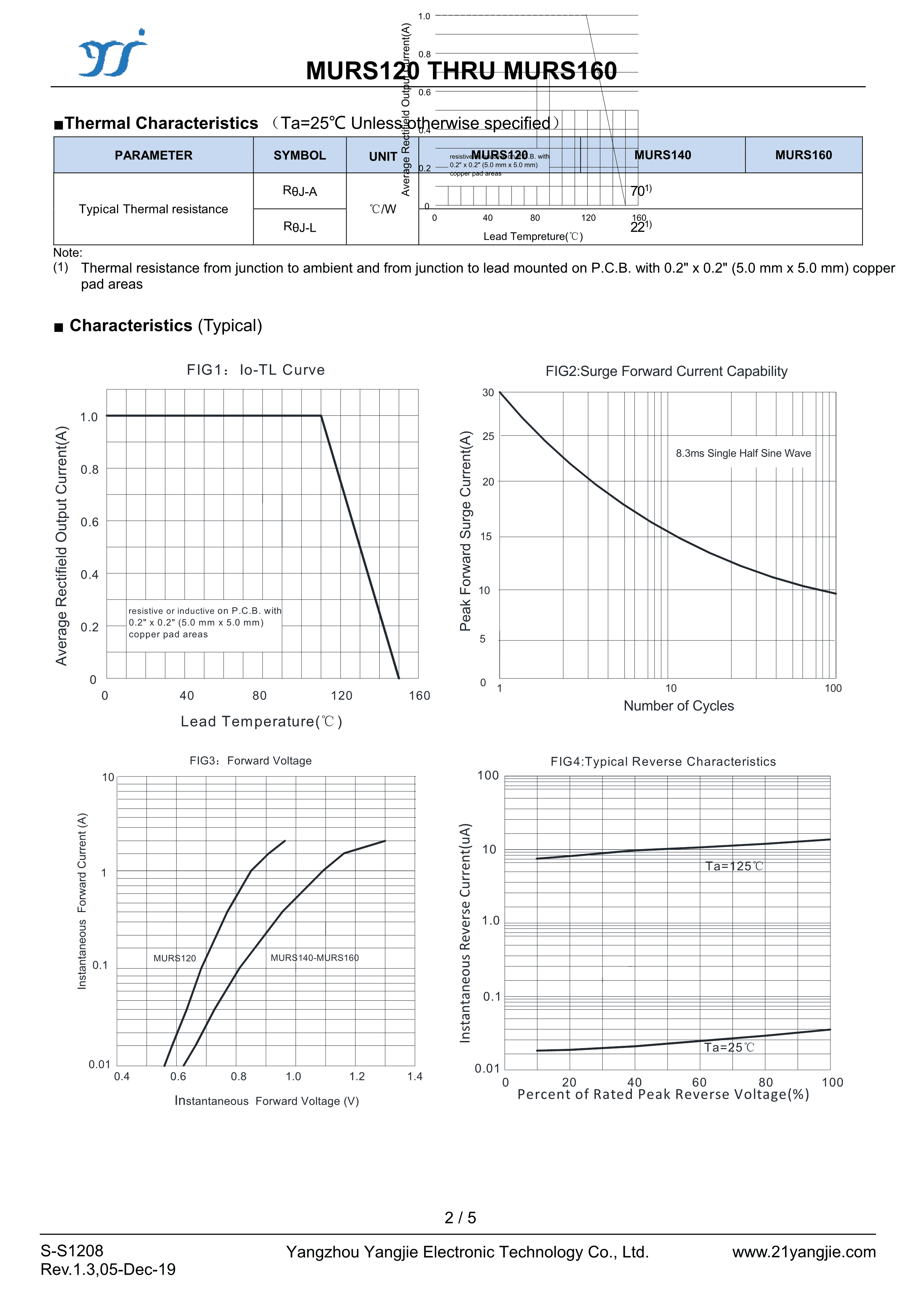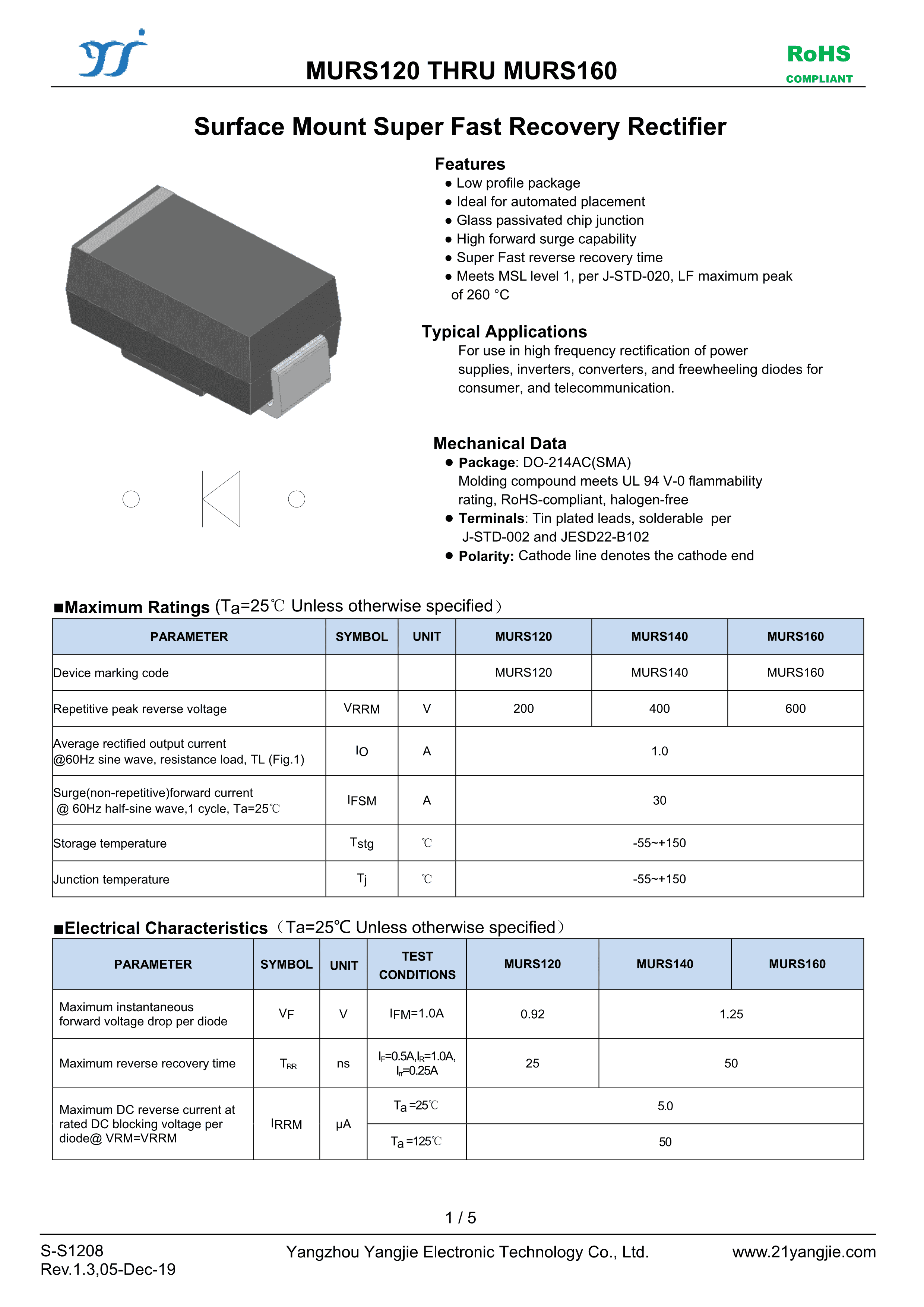 MURS160数据手册SMA封装YANGJIE(扬杰)PDF规格书,中英文下载