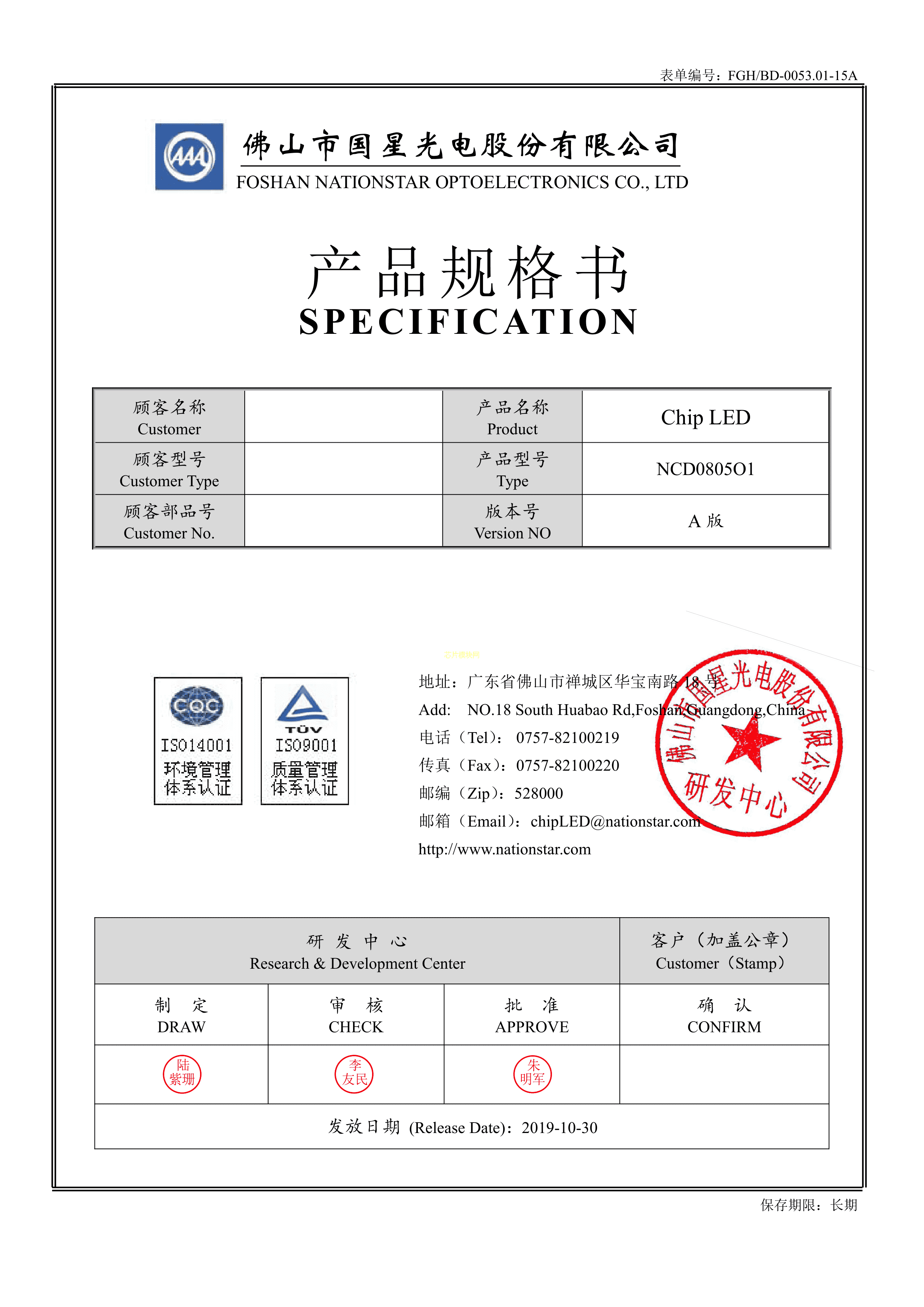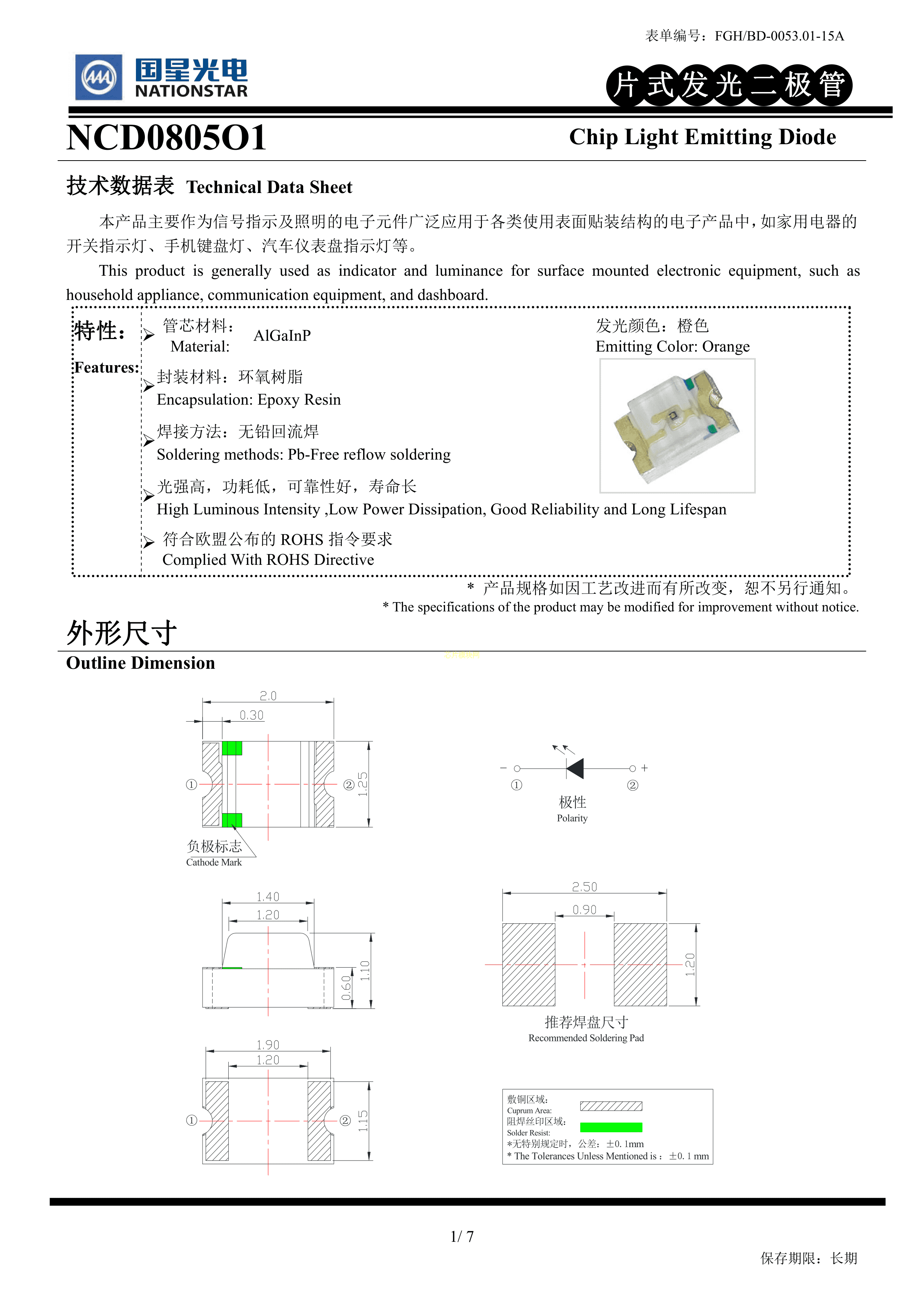 NCD0805O1数据手册0805封装国星光电PDF规格书,中英文下载