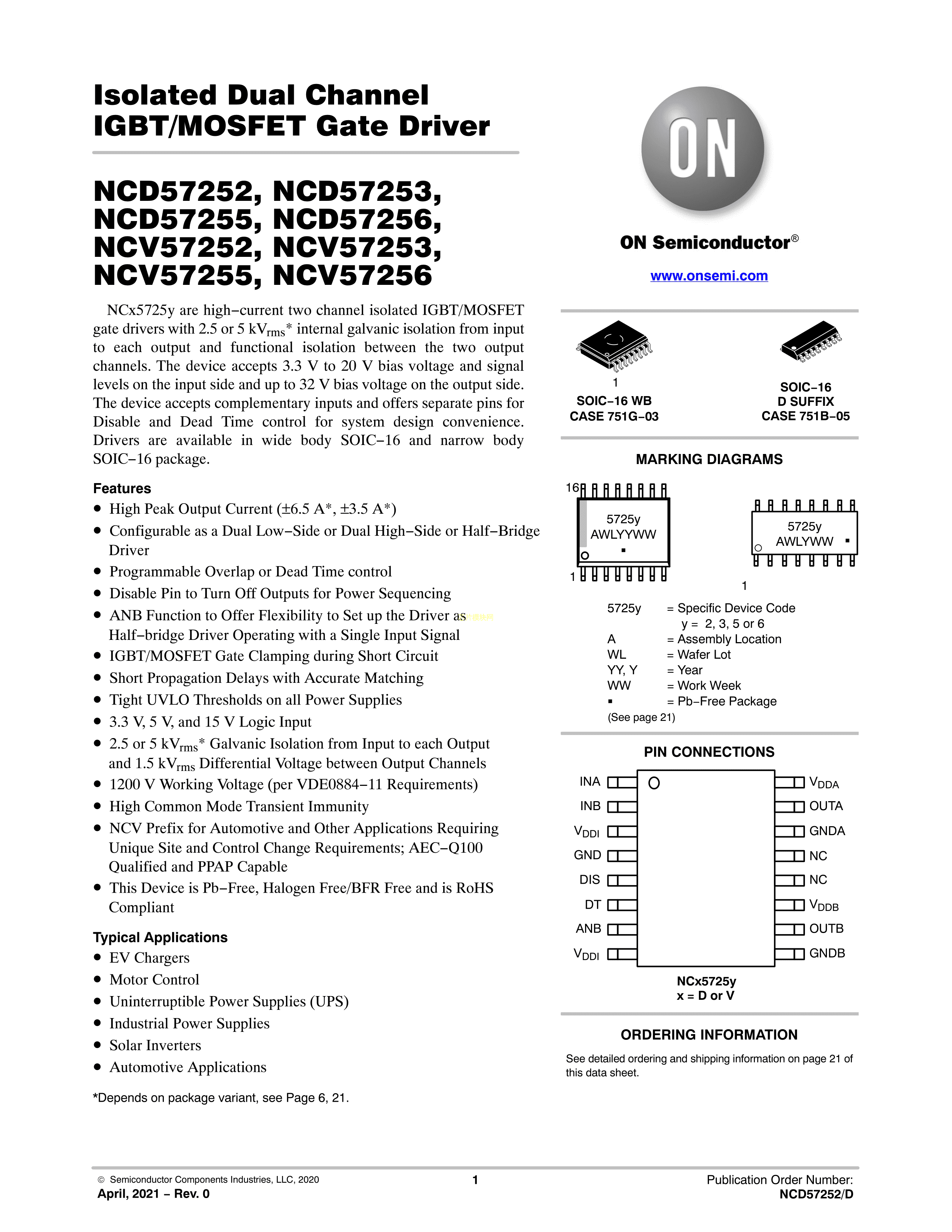 NCD57252DWR2G数据手册SOIC-16封装onsemi(安森美)PDF规格书,中英文下载