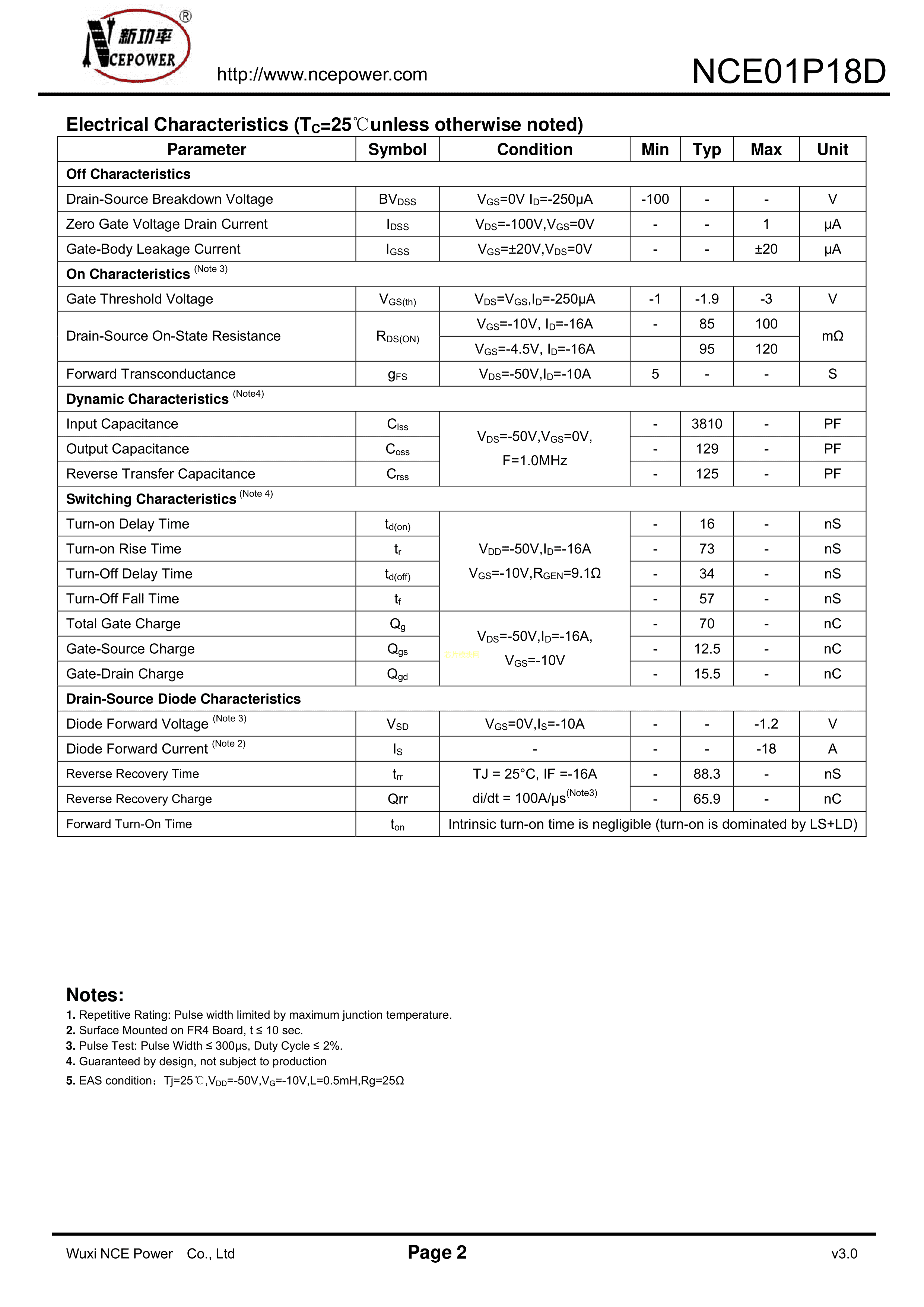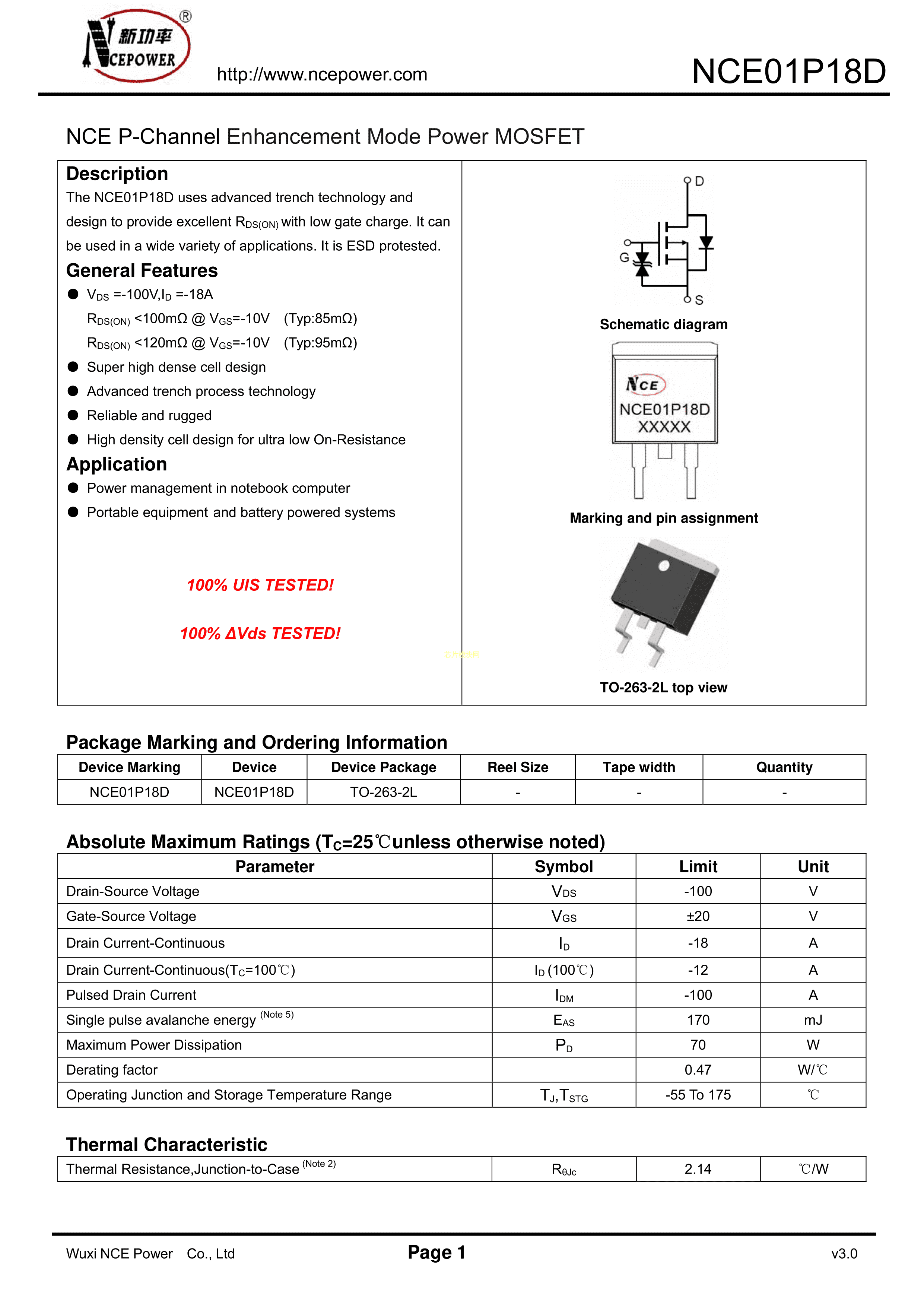 NCE01P18D数据手册TO-263-2L封装NCE(无锡新洁能)PDF规格书,中英文下载