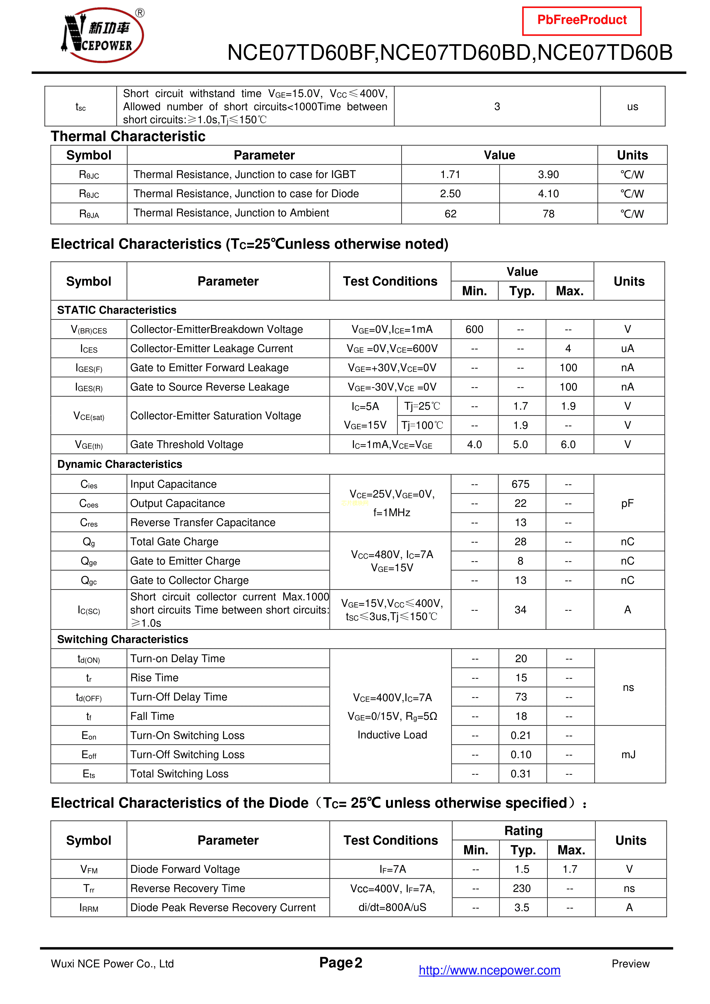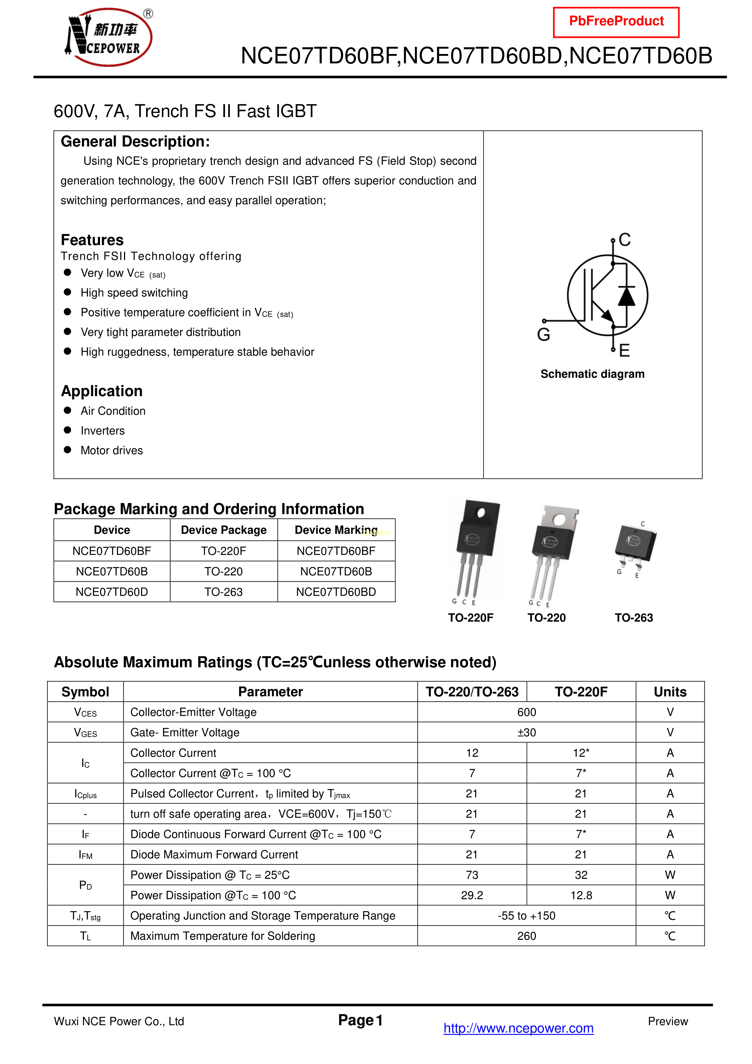 NCE07TD60BD数据手册TO-263封装NCE(无锡新洁能)PDF规格书,中英文下载