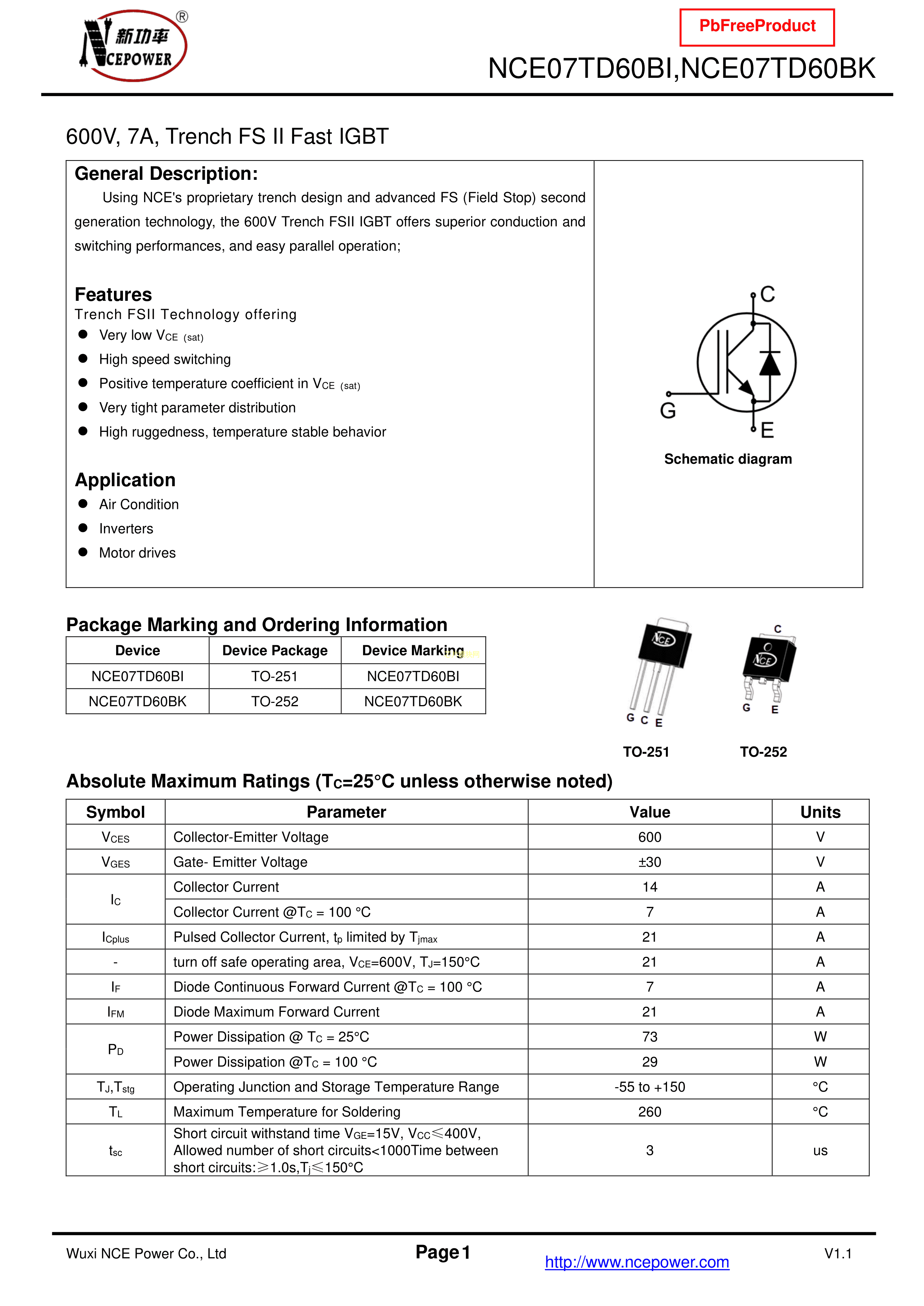 NCE07TD60BK数据手册TO-252封装NCE(无锡新洁能)PDF规格书,中英文下载