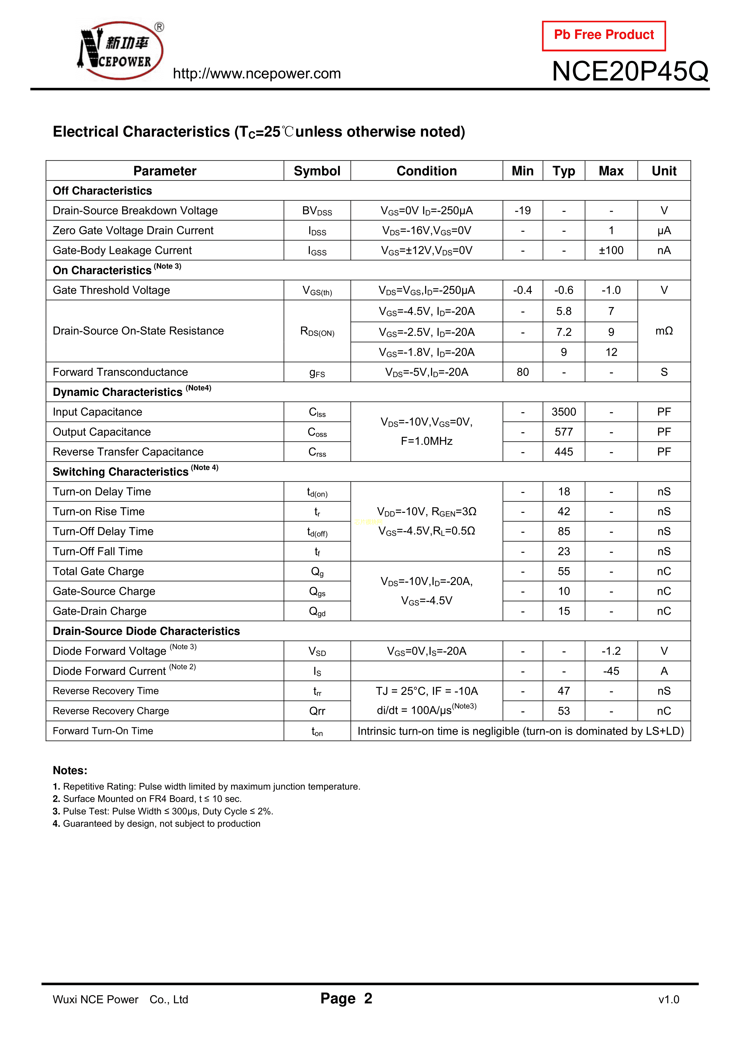 NCE20P45Q数据手册DFN3.3x3.3-8L封装NCE(无锡新洁能)PDF规格书,中英文下载