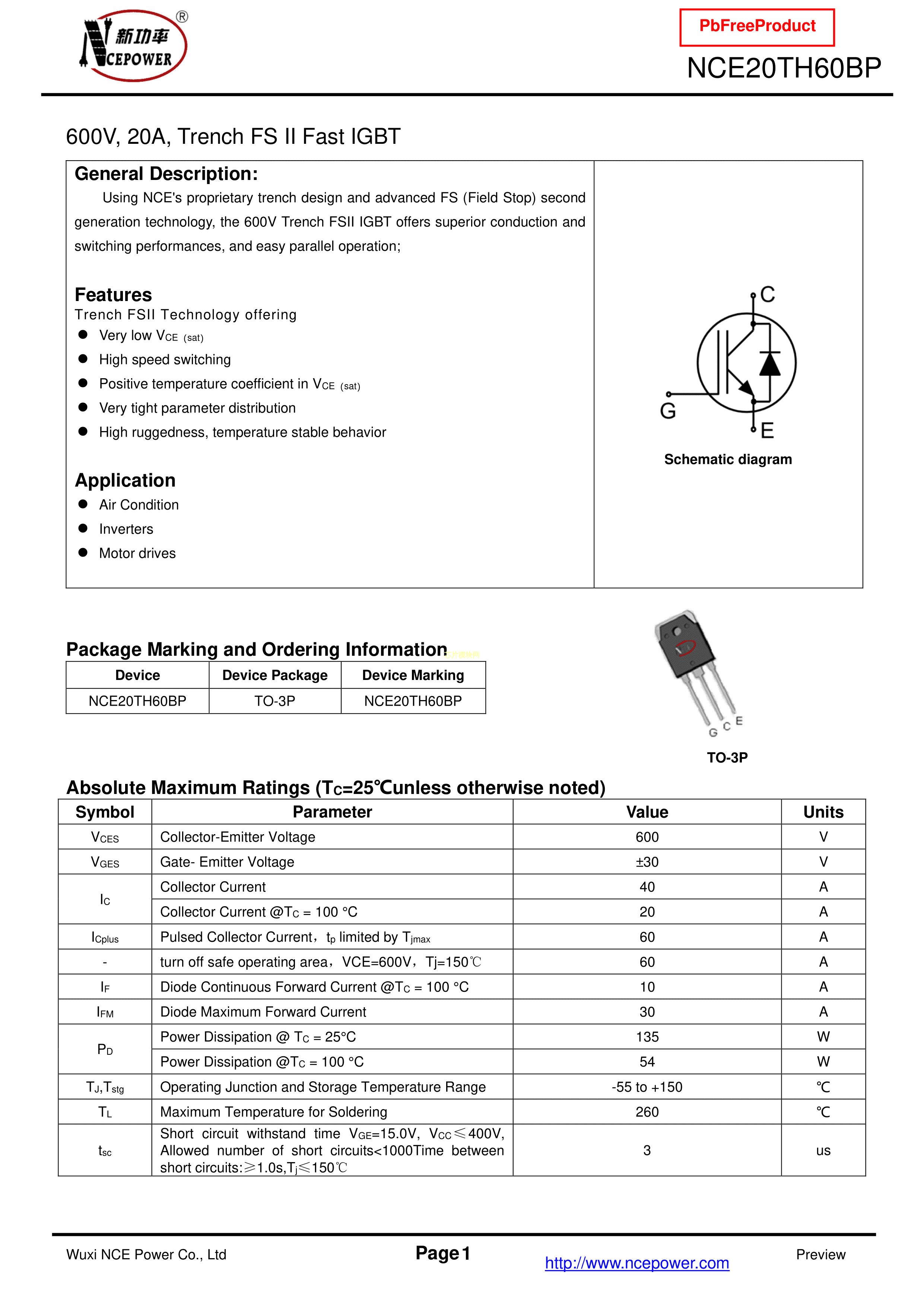 NCE20TH60BP数据手册TO-3P封装NCE(无锡新洁能)PDF规格书,中英文下载