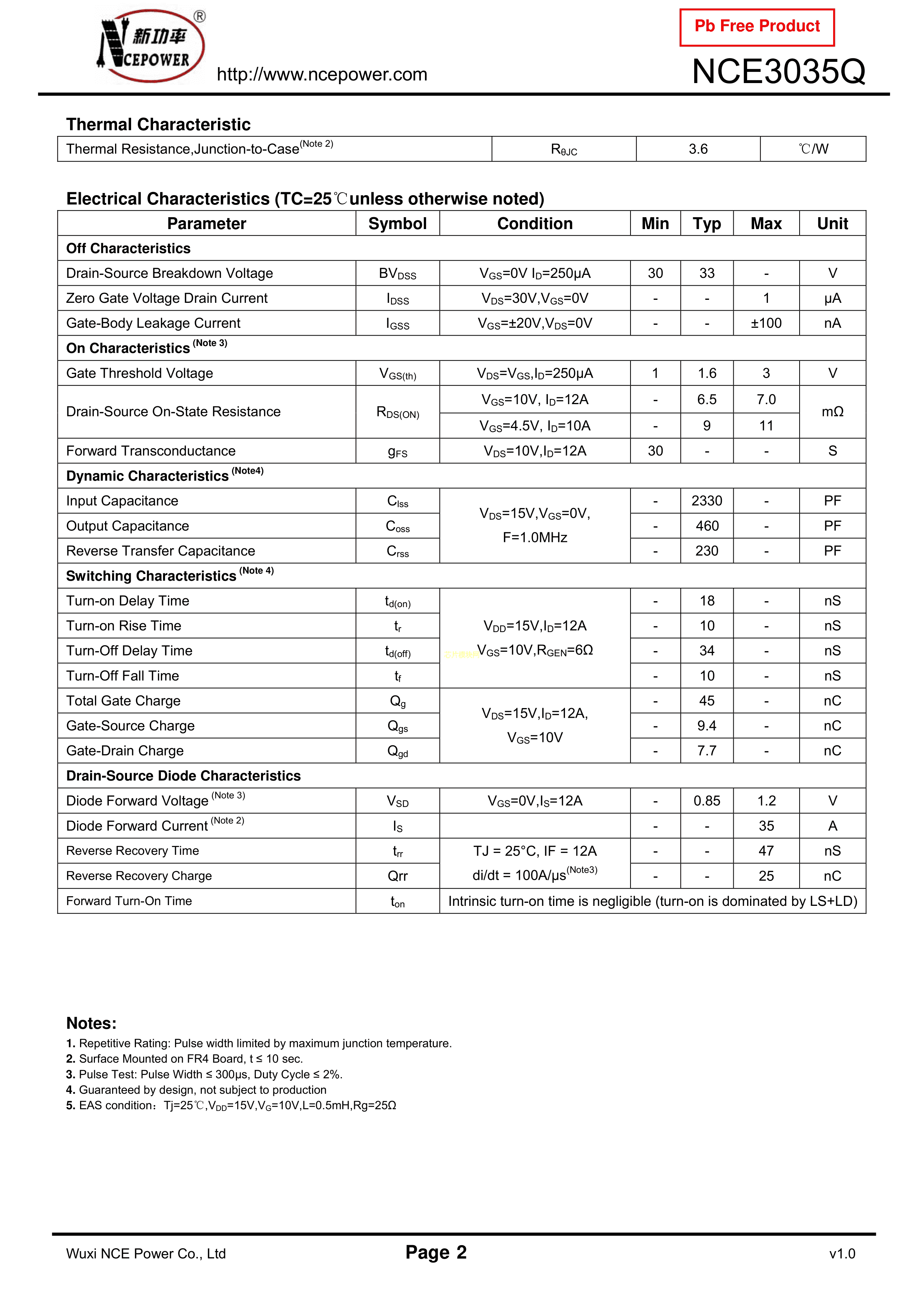 NCE3035Q数据手册DFN(3x3)_EP封装NCE(无锡新洁能)PDF规格书,中英文下载