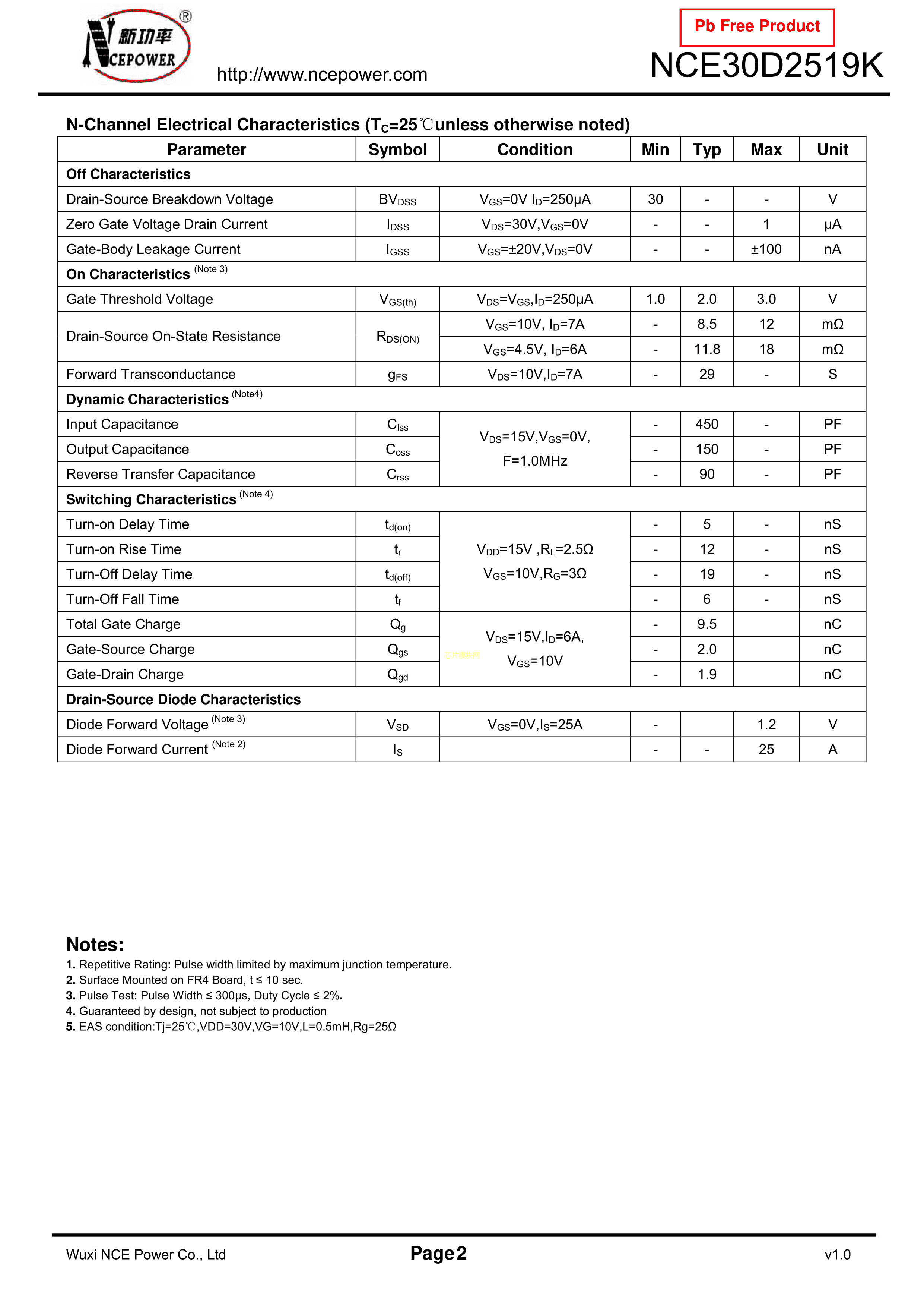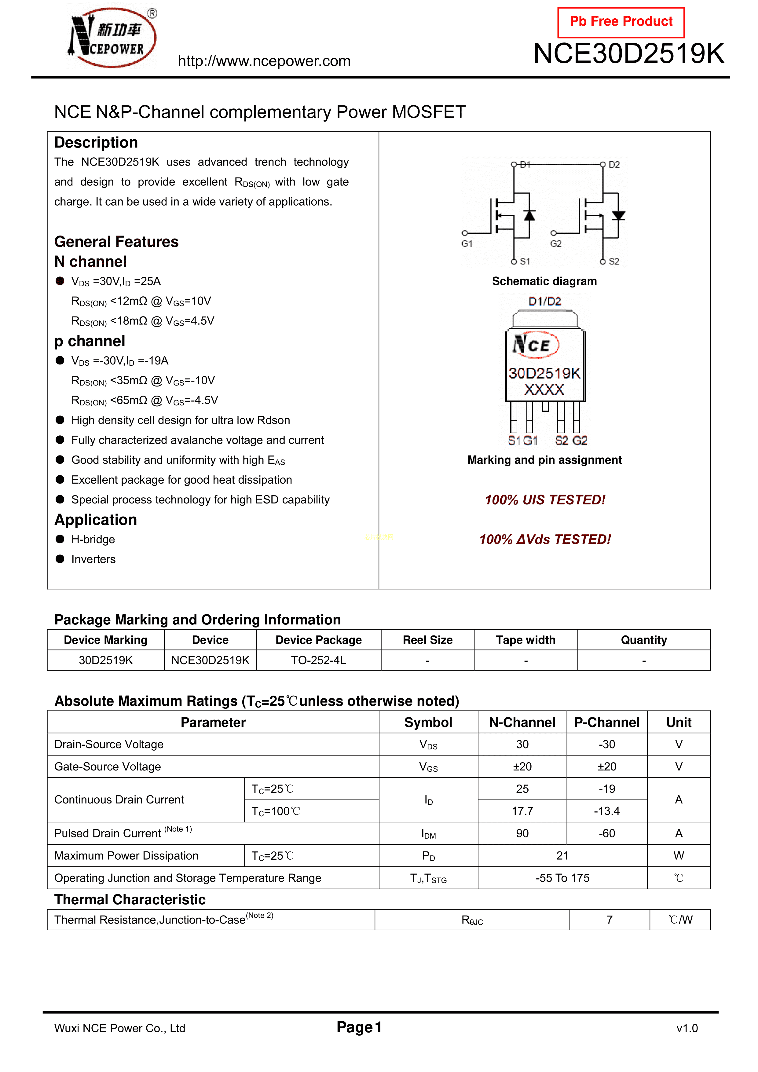 NCE30D2519K数据手册TO-252-4封装NCE(无锡新洁能)PDF规格书,中英文下载