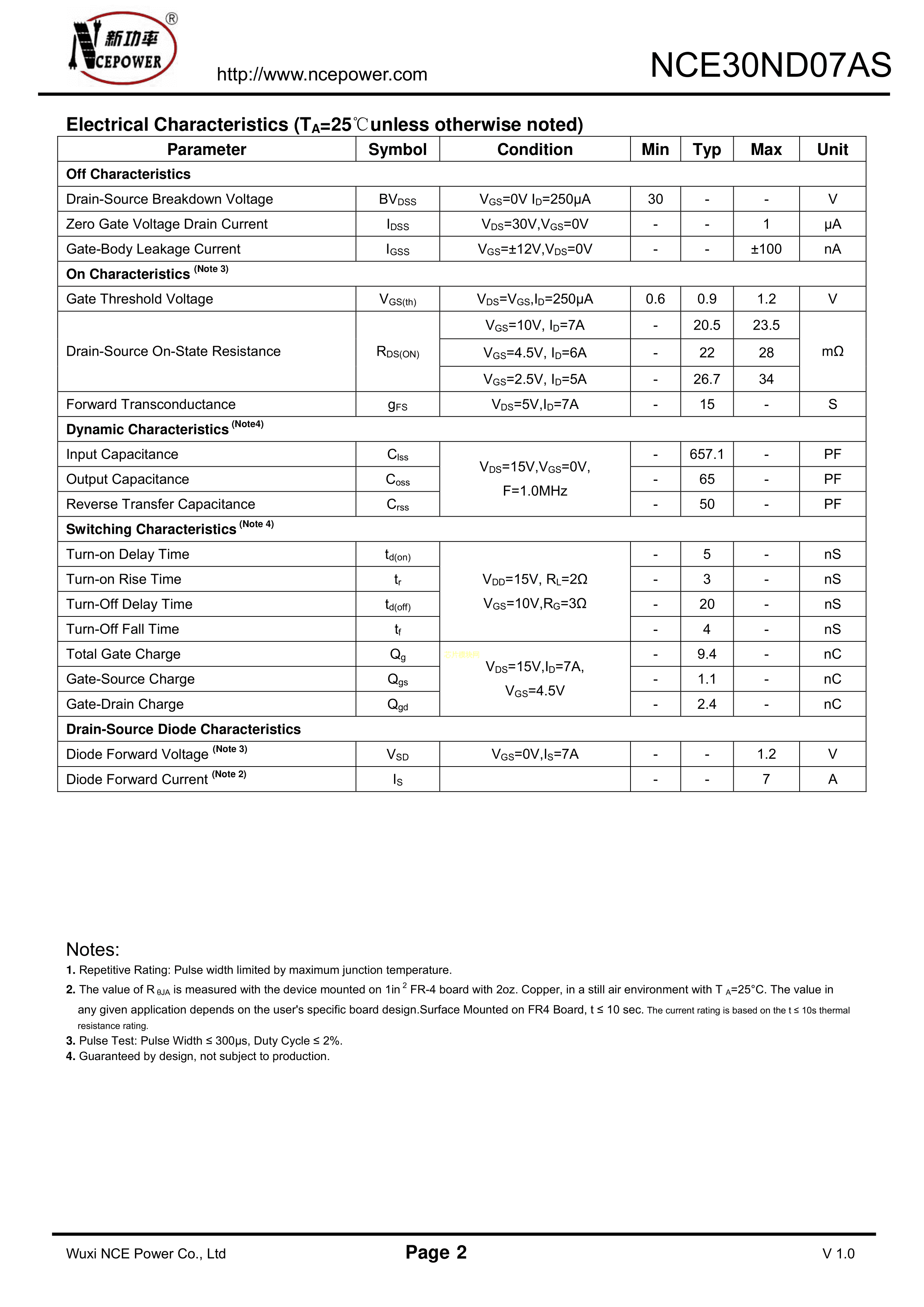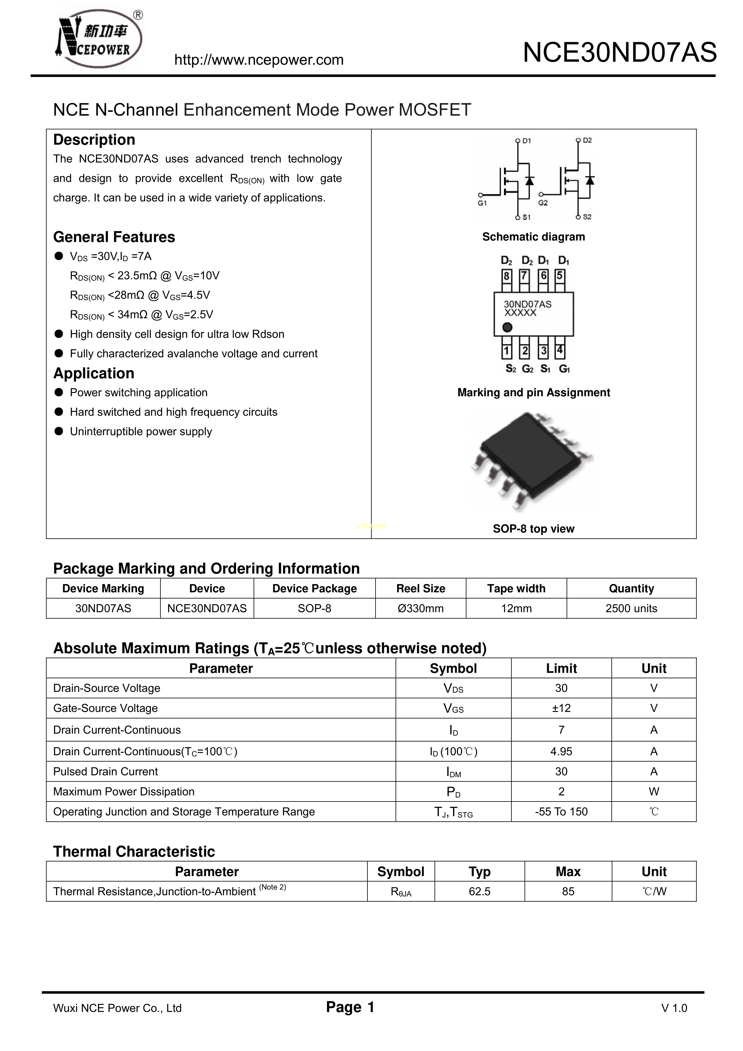 NCE30ND07AS数据手册SOP-8封装NCE(无锡新洁能)PDF规格书,中英文下载