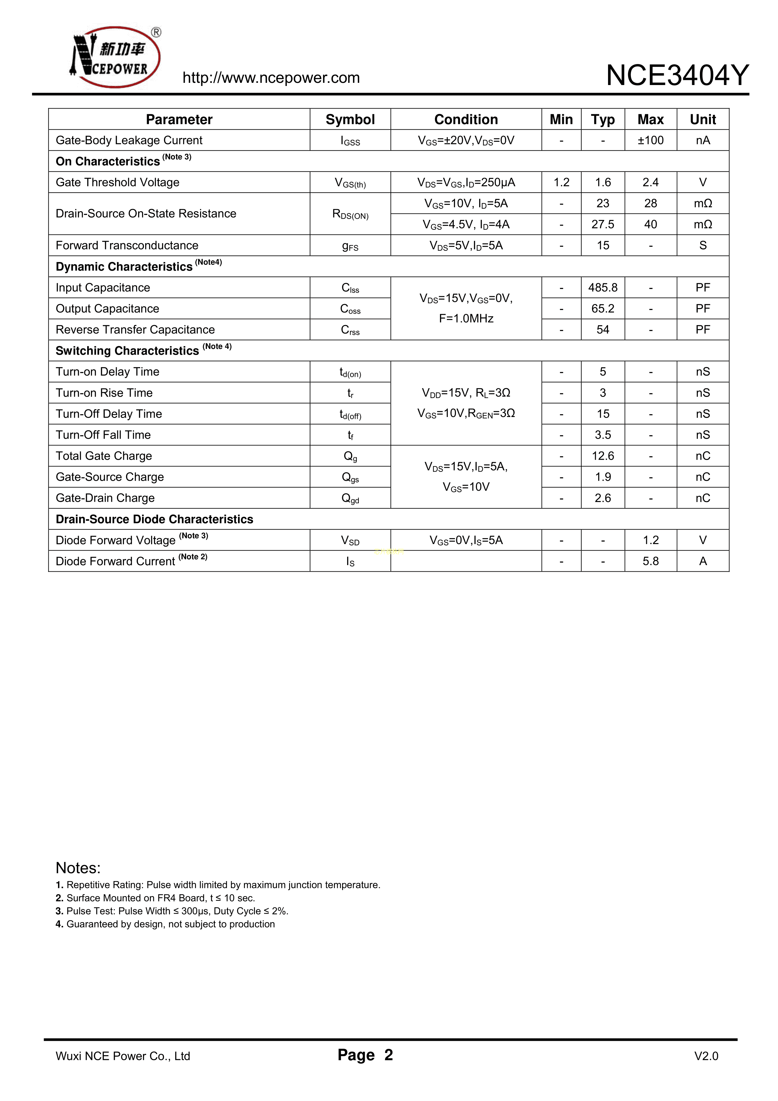NCE3404Y数据手册SOT-23-3L封装NCE(无锡新洁能)PDF规格书,中英文下载