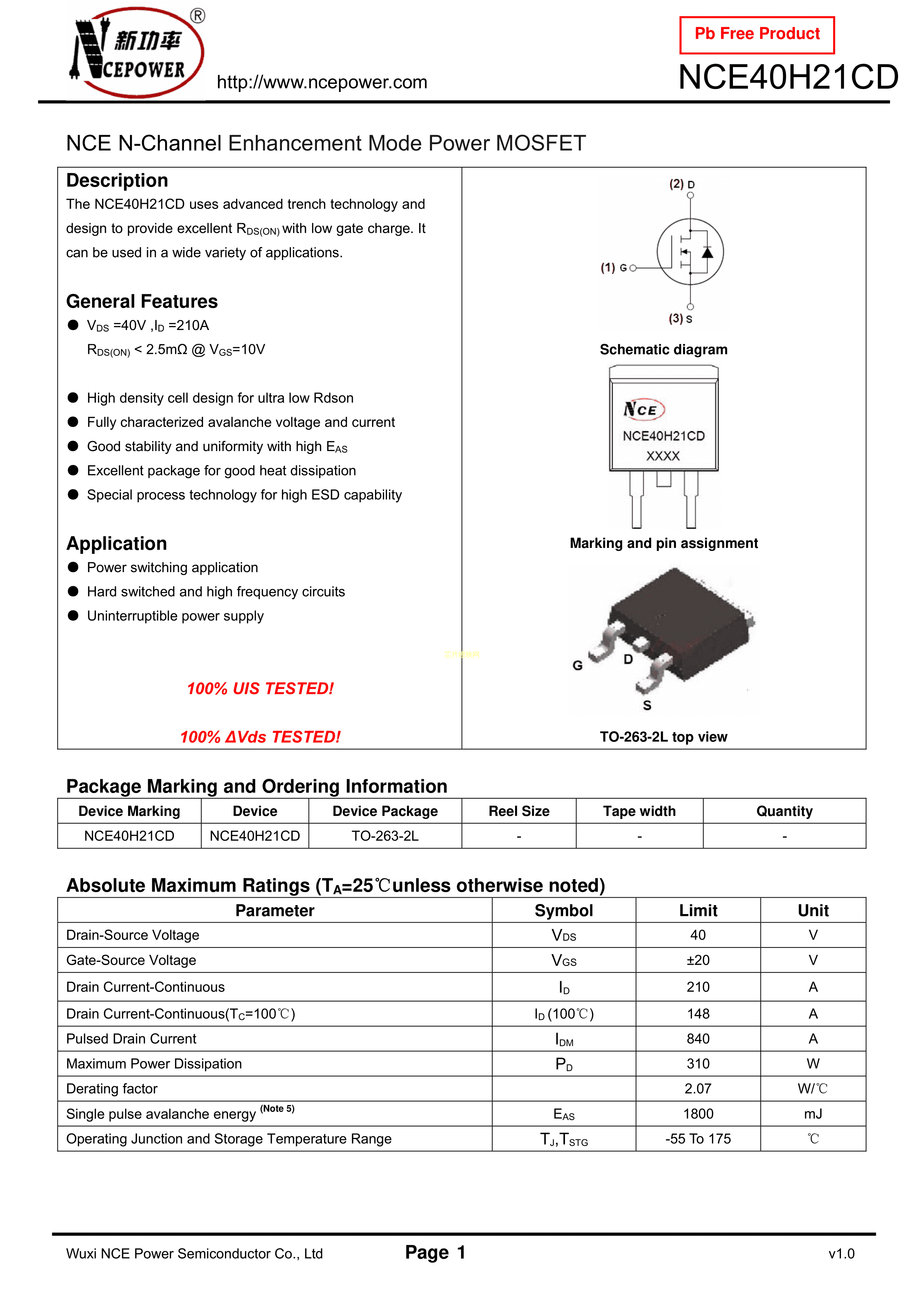 NCE40H21CD数据手册TO-263-2封装NCE(无锡新洁能)PDF规格书,中英文下载