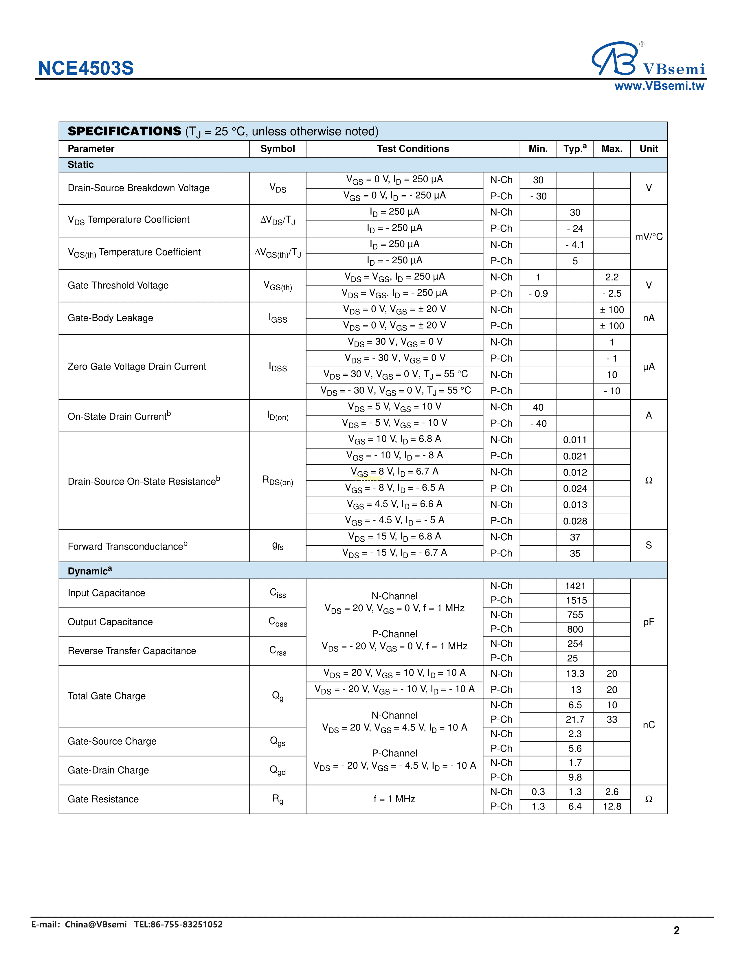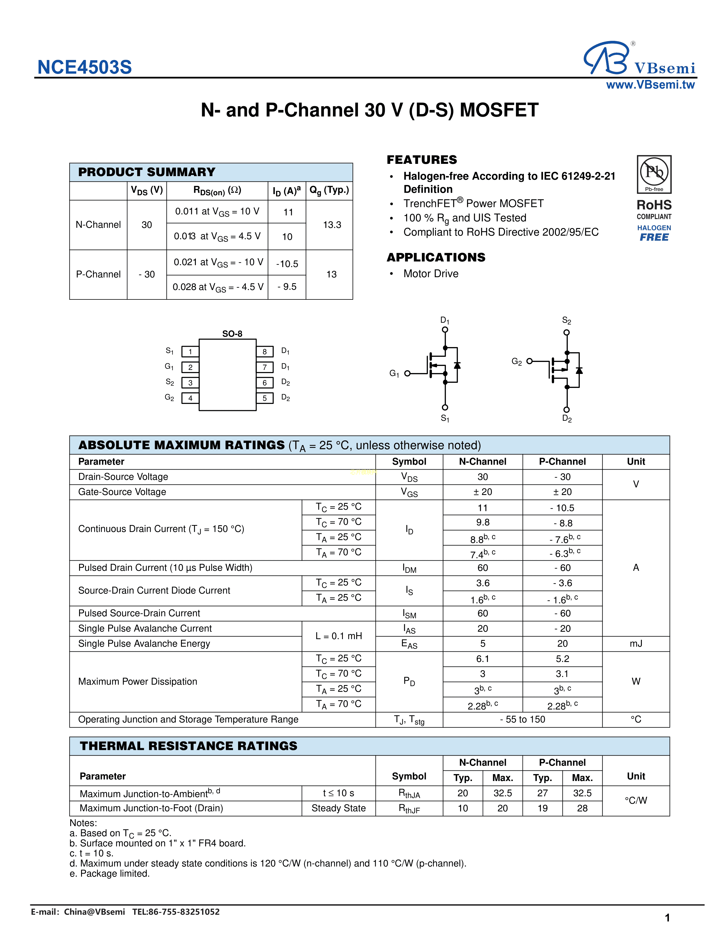 NCE4503S数据手册SO-8封装VBsemi(台湾微碧)PDF规格书,中英文下载