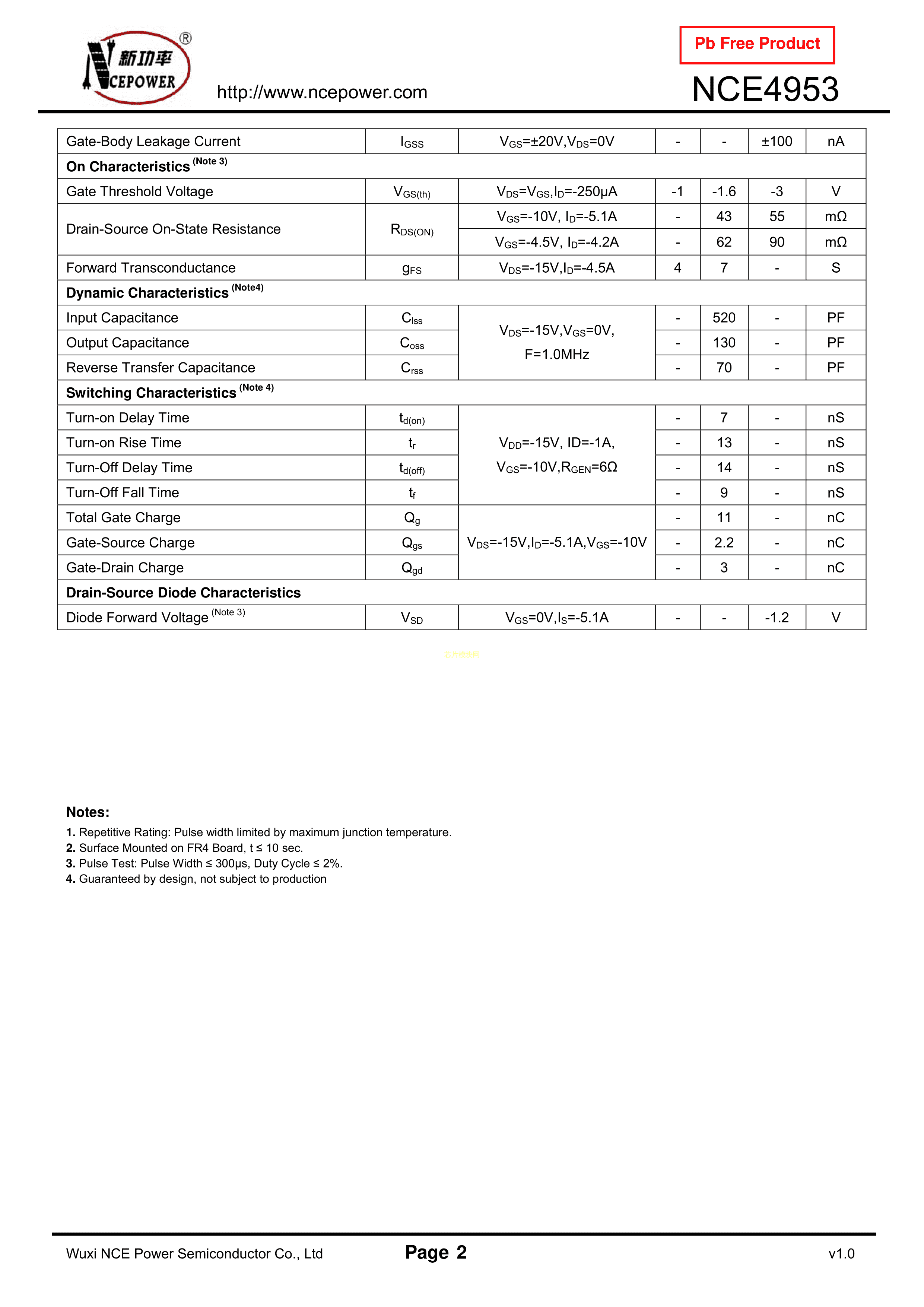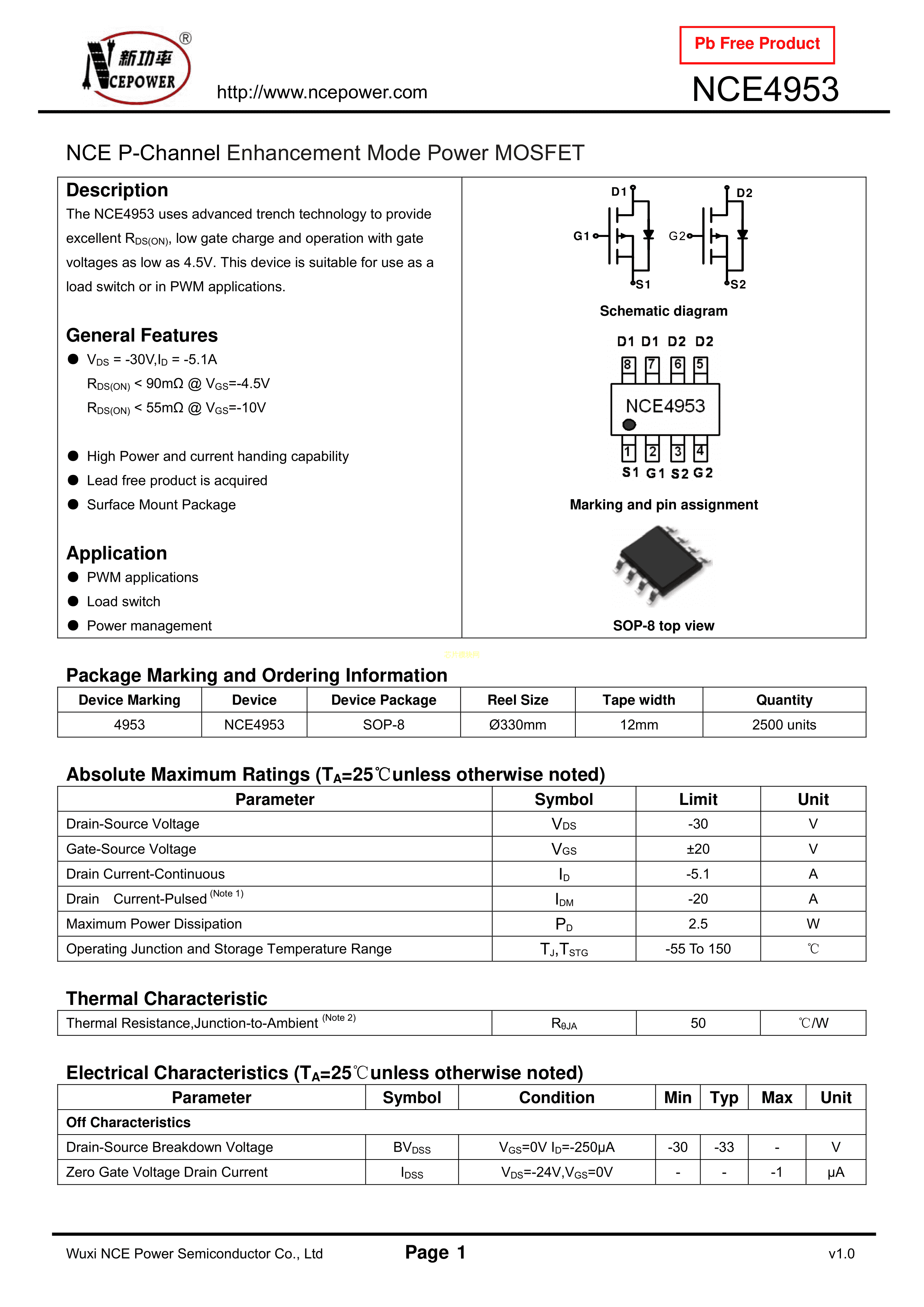 NCE4953数据手册SOIC-8_150mil封装NCE(无锡新洁能)PDF规格书,中英文下载