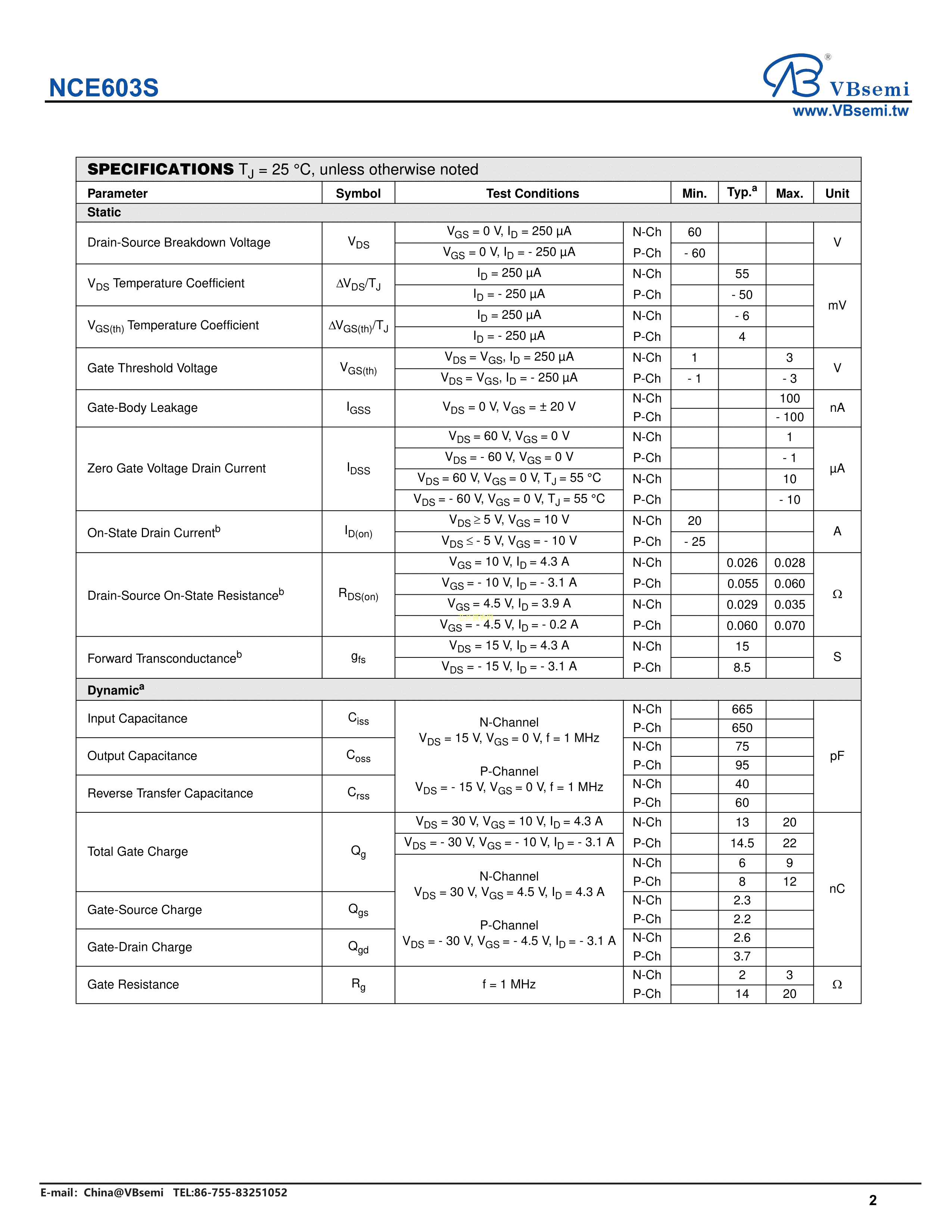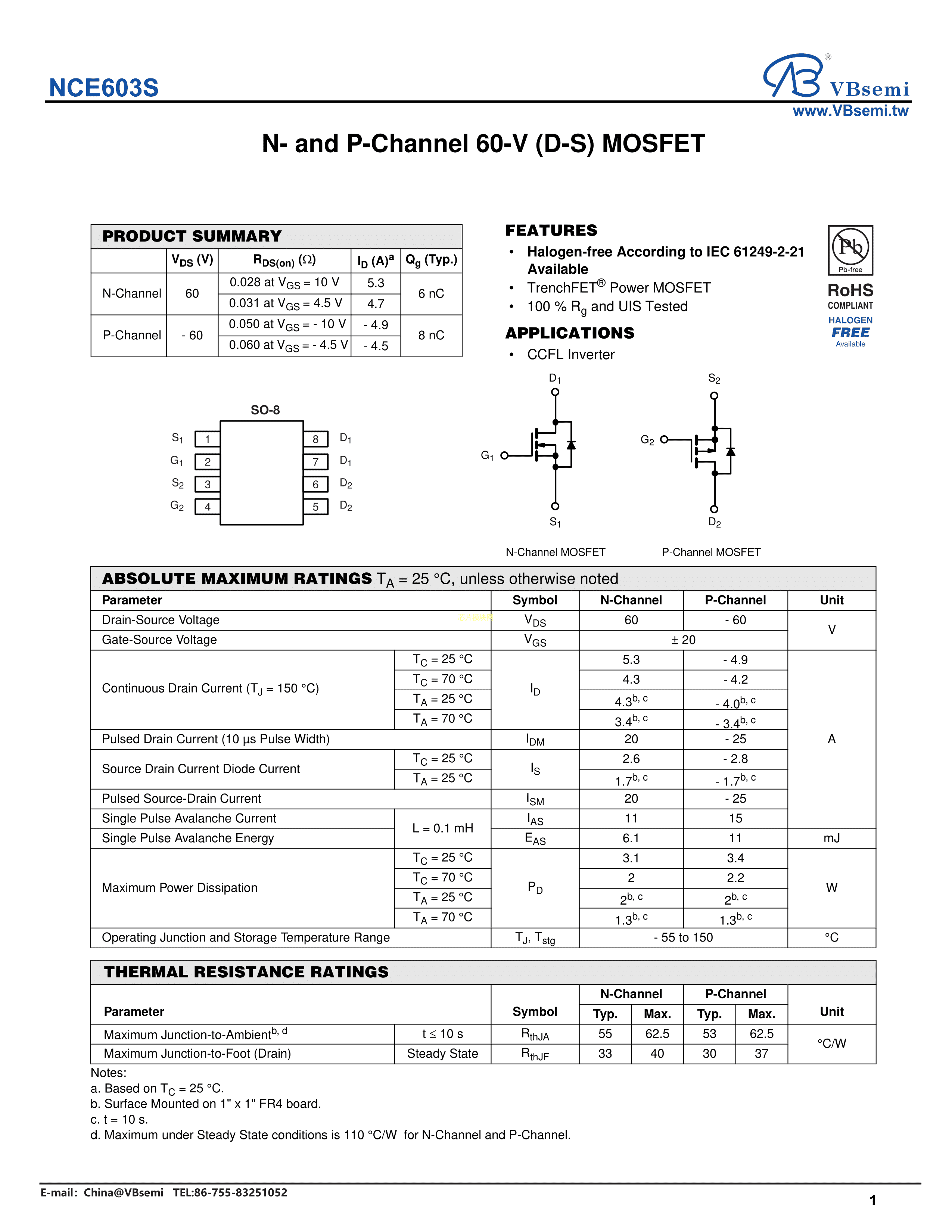 NCE603S数据手册SOP-8封装VBsemi(台湾微碧)PDF规格书,中英文下载
