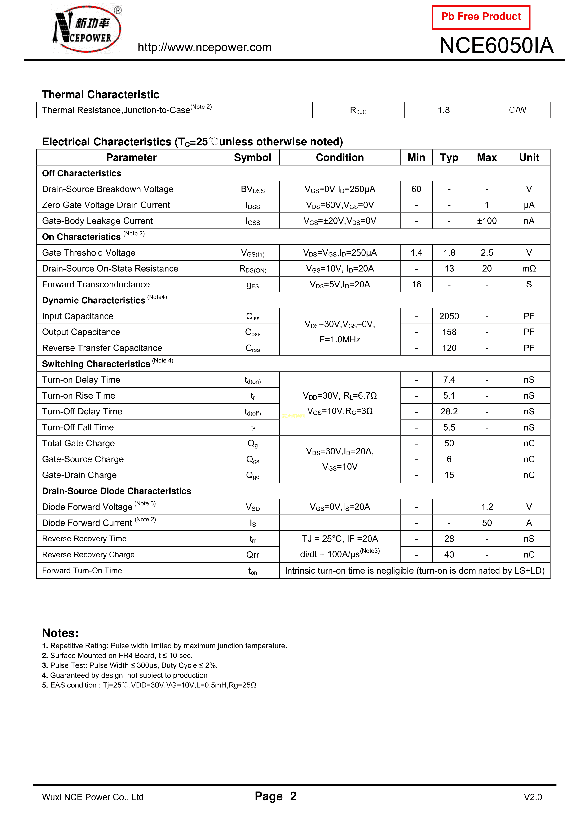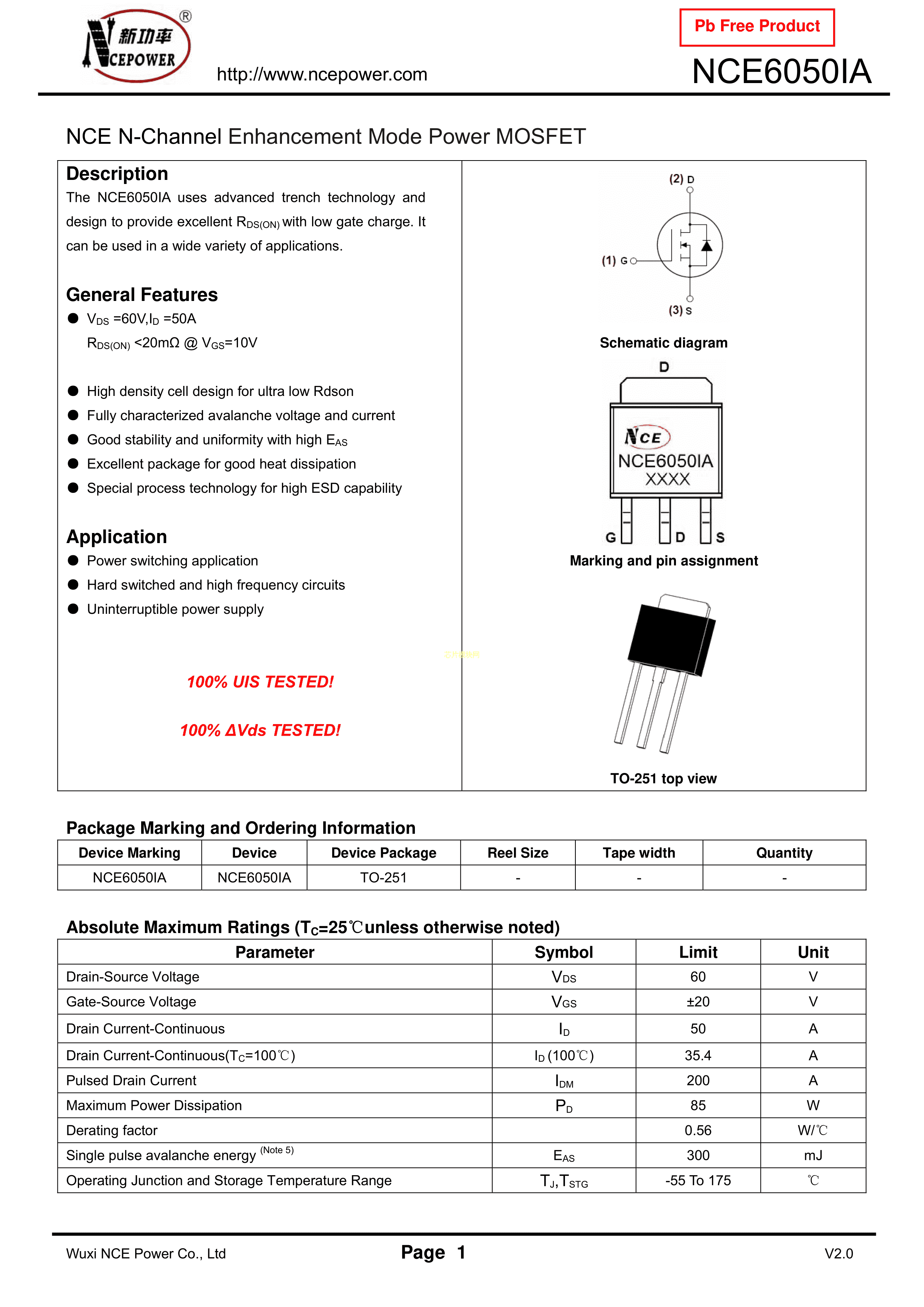 NCE6050IA数据手册TO-251封装NCE(无锡新洁能)PDF规格书,中英文下载