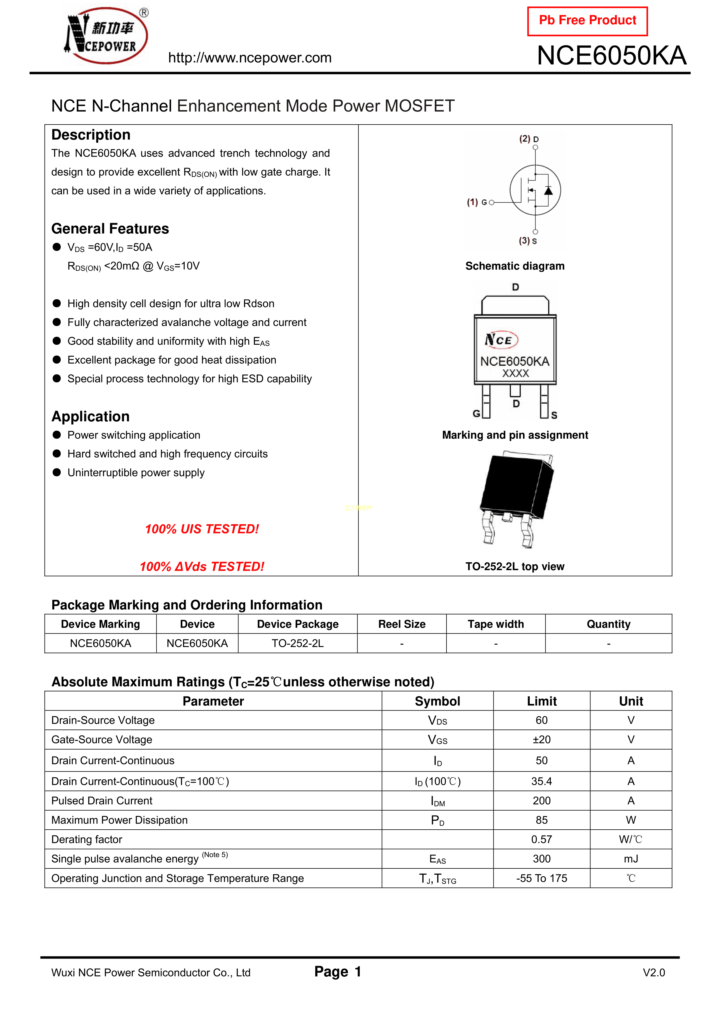 NCE6050KA数据手册TO-252-2(DPAK)封装NCE(无锡新洁能)PDF规格书,中英文下