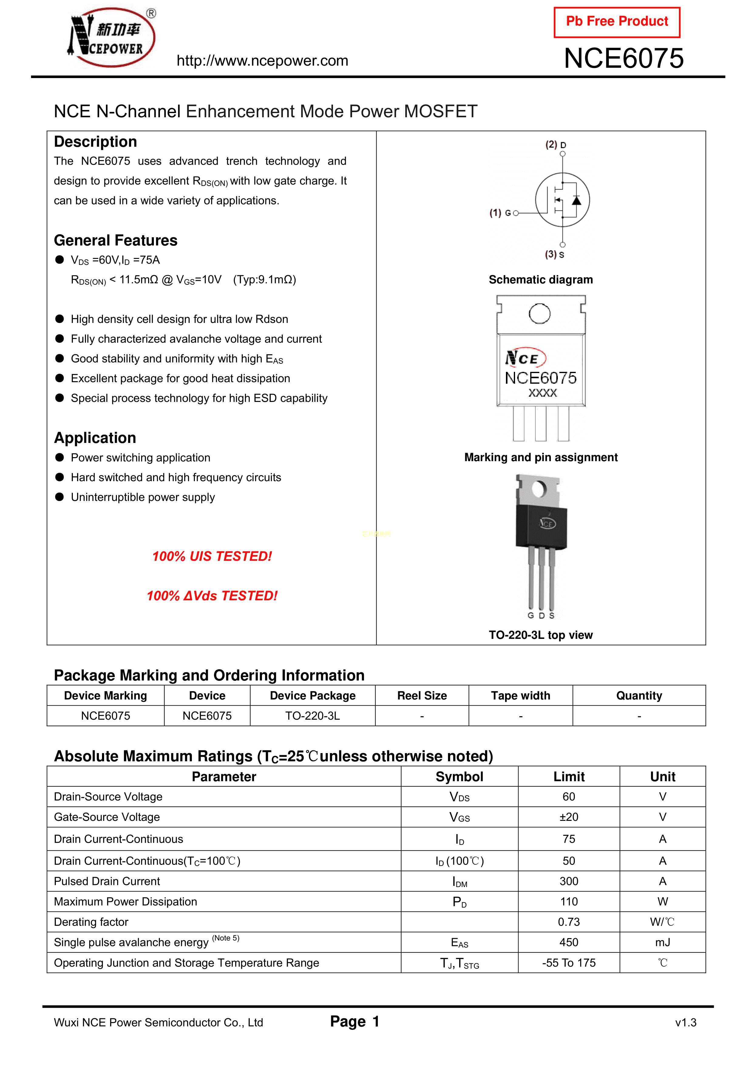 NCE6075数据手册TO-220(TO-220-3)封装NCE(无锡新洁能)PDF规格书,中英文下