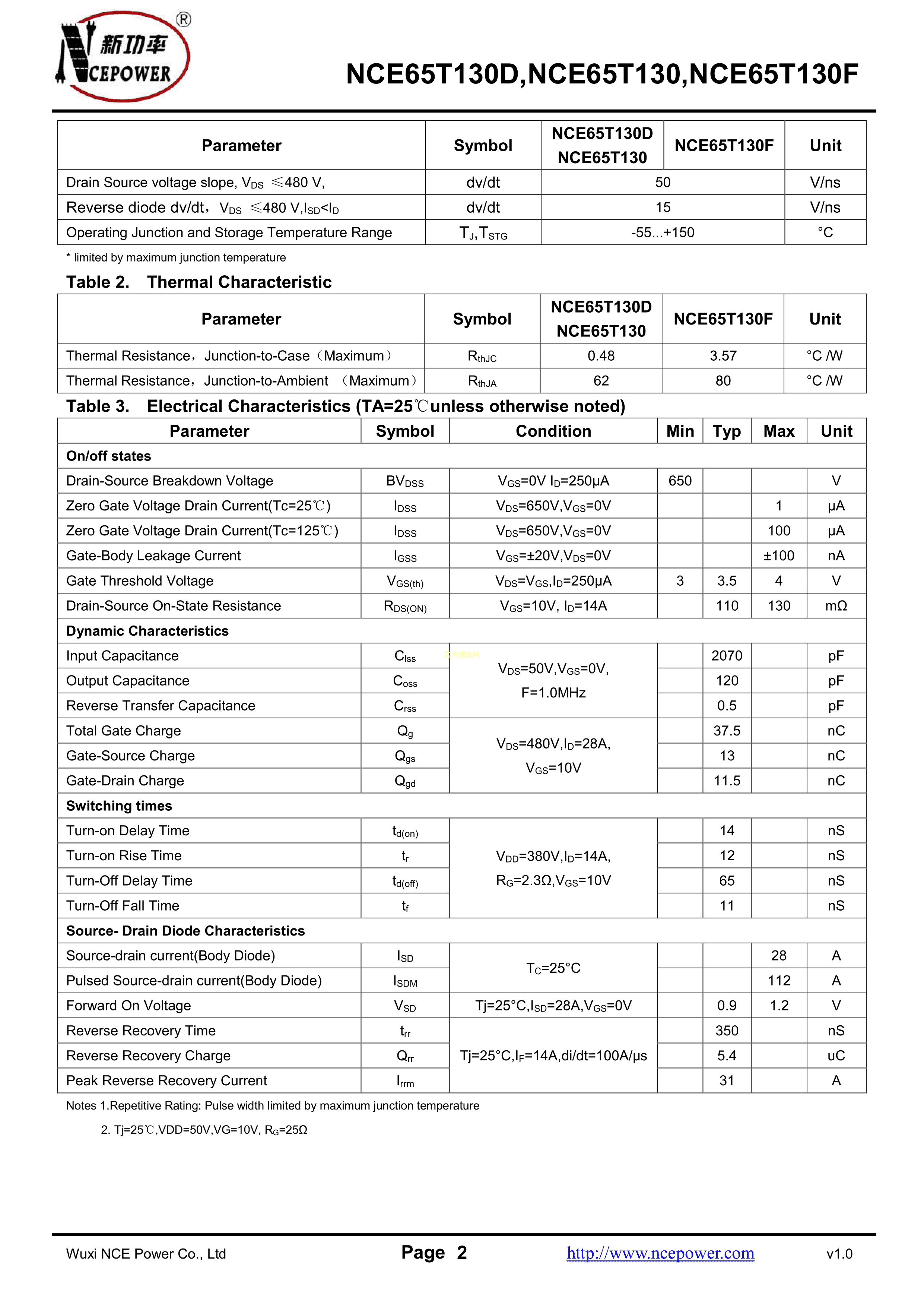 NCE65T130PDF规格书,中英文下载