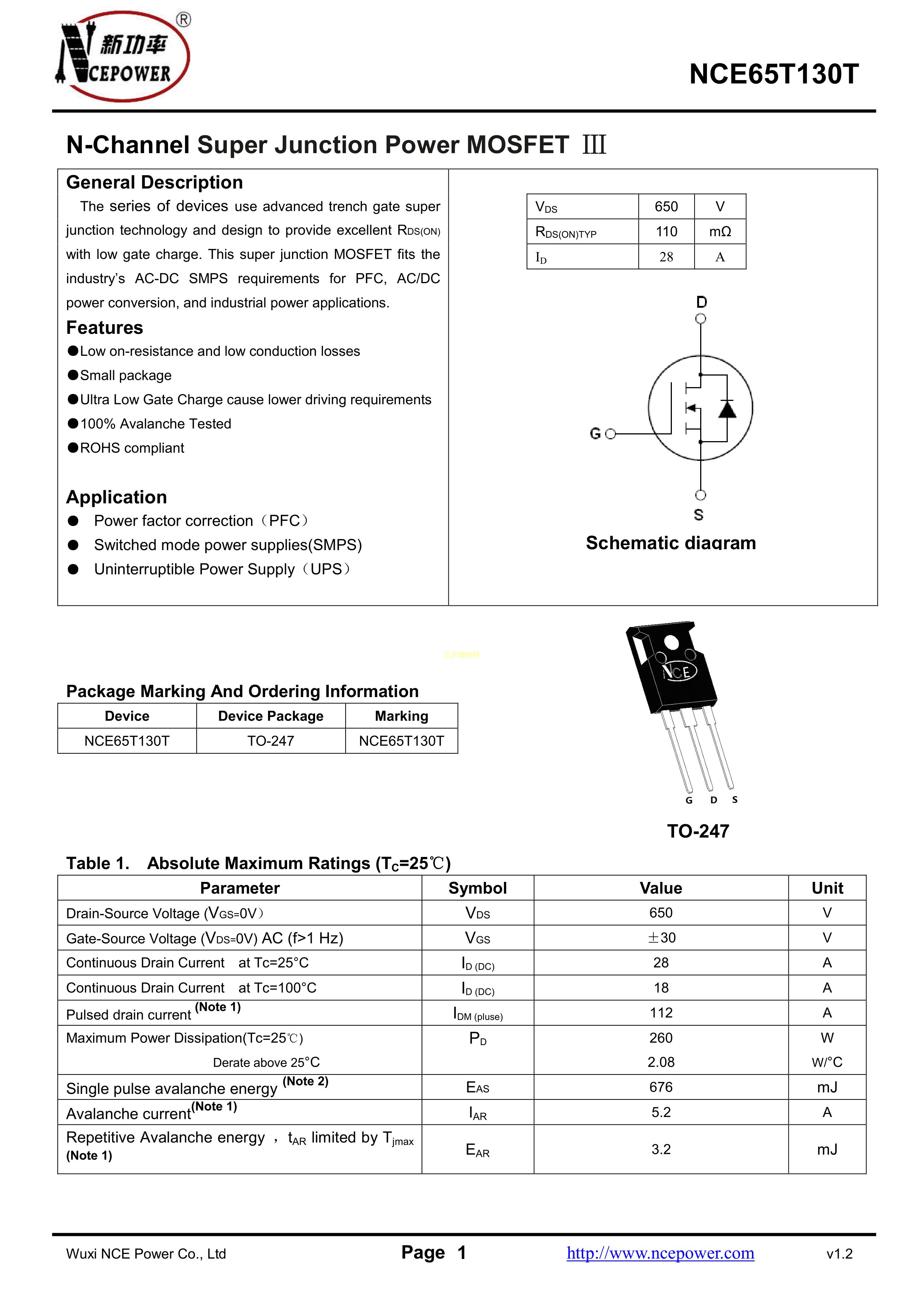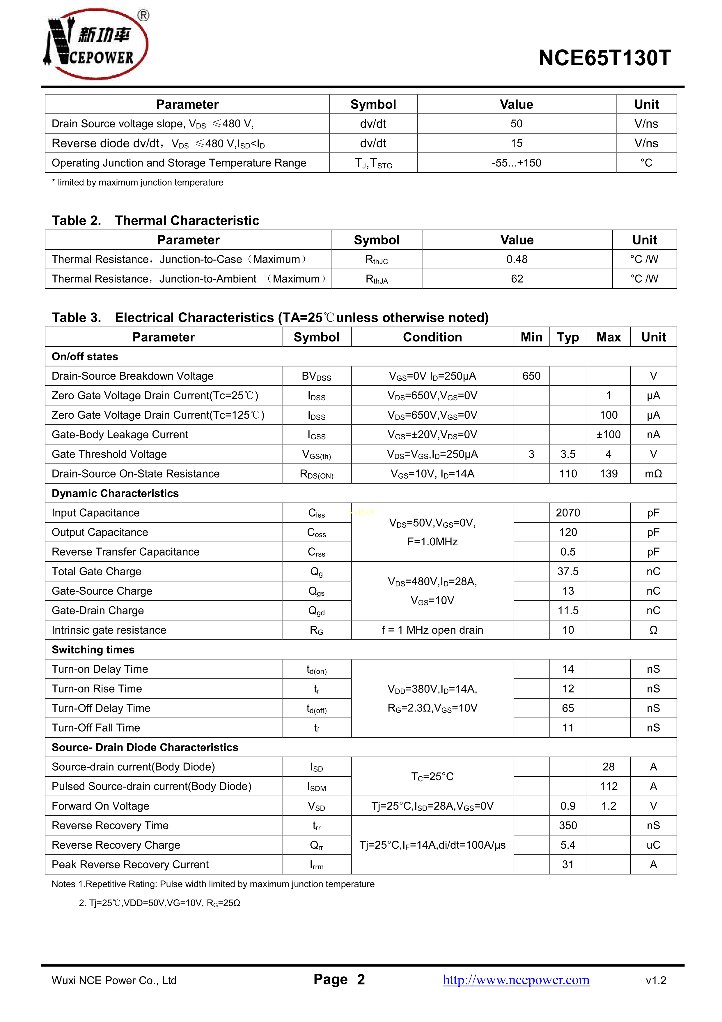 NCE65T130TPDF规格书,中英文下载