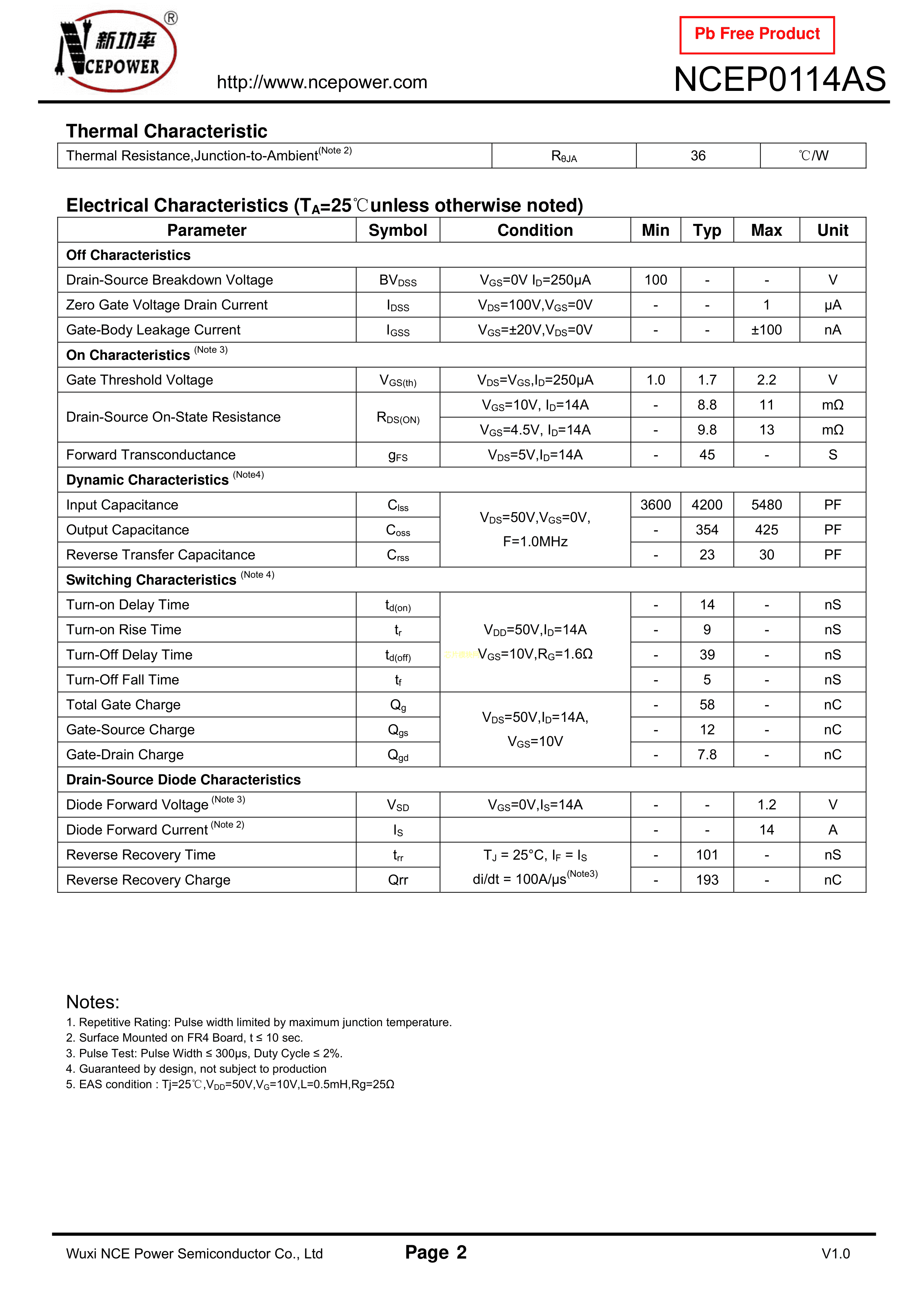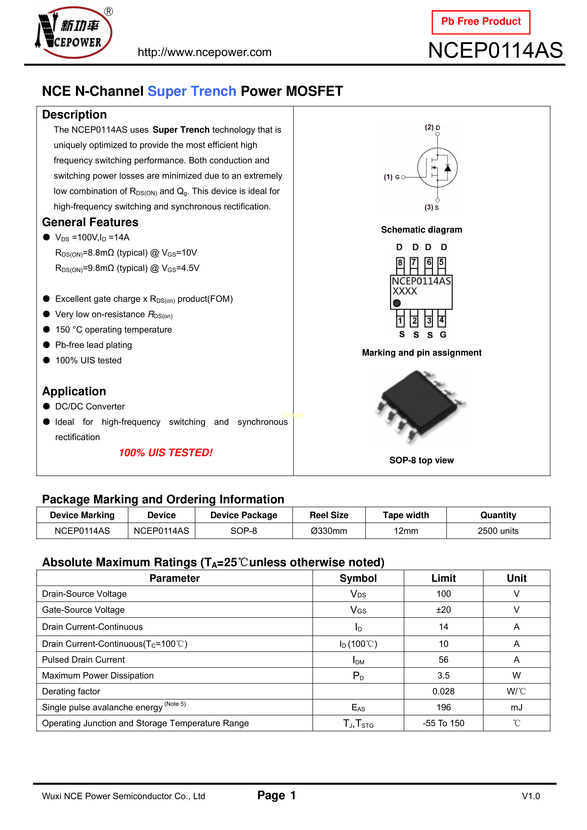 NCEP0114AS数据手册SOIC-8_150mil封装NCE(无锡新洁能)PDF规格书,中英文下