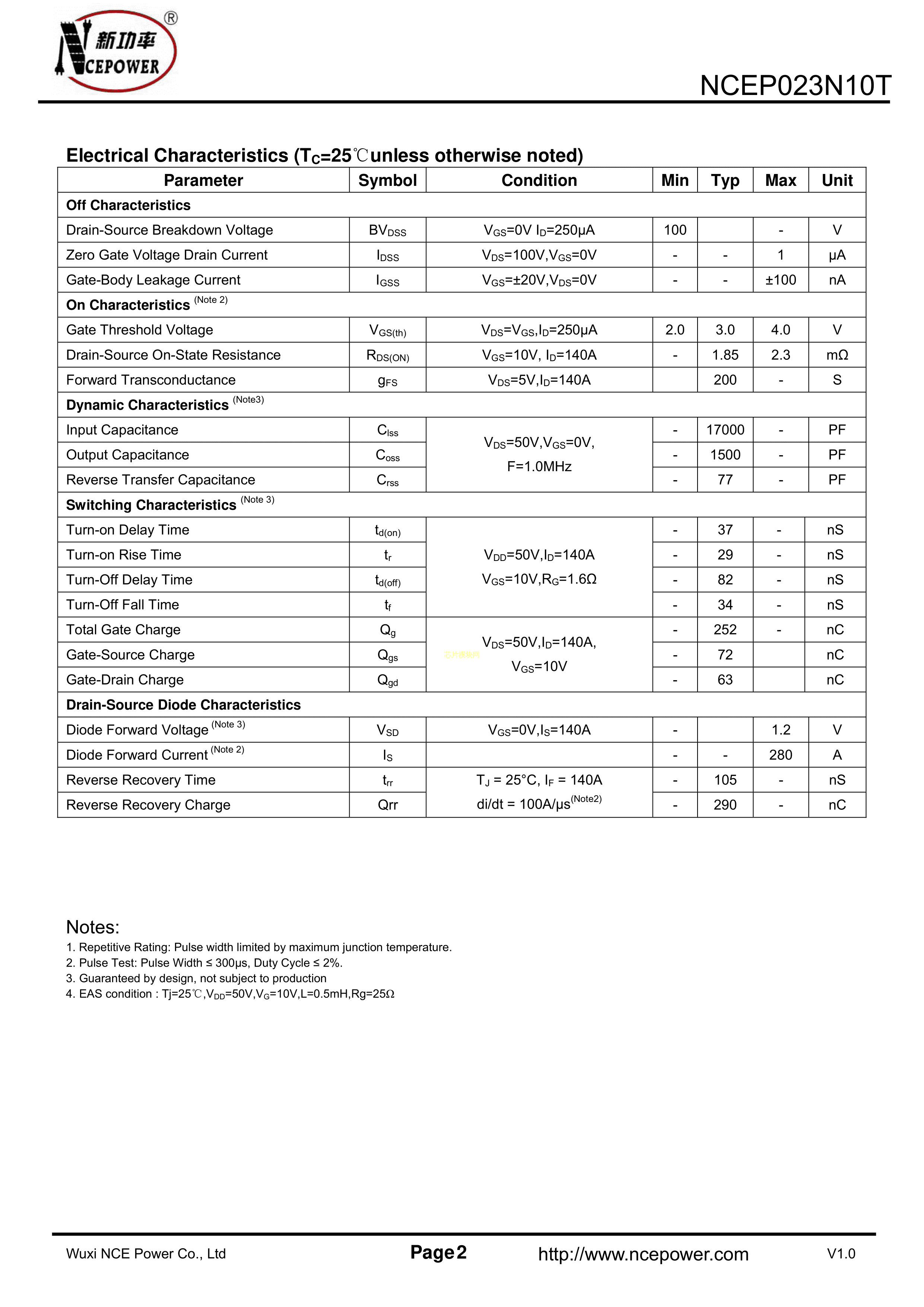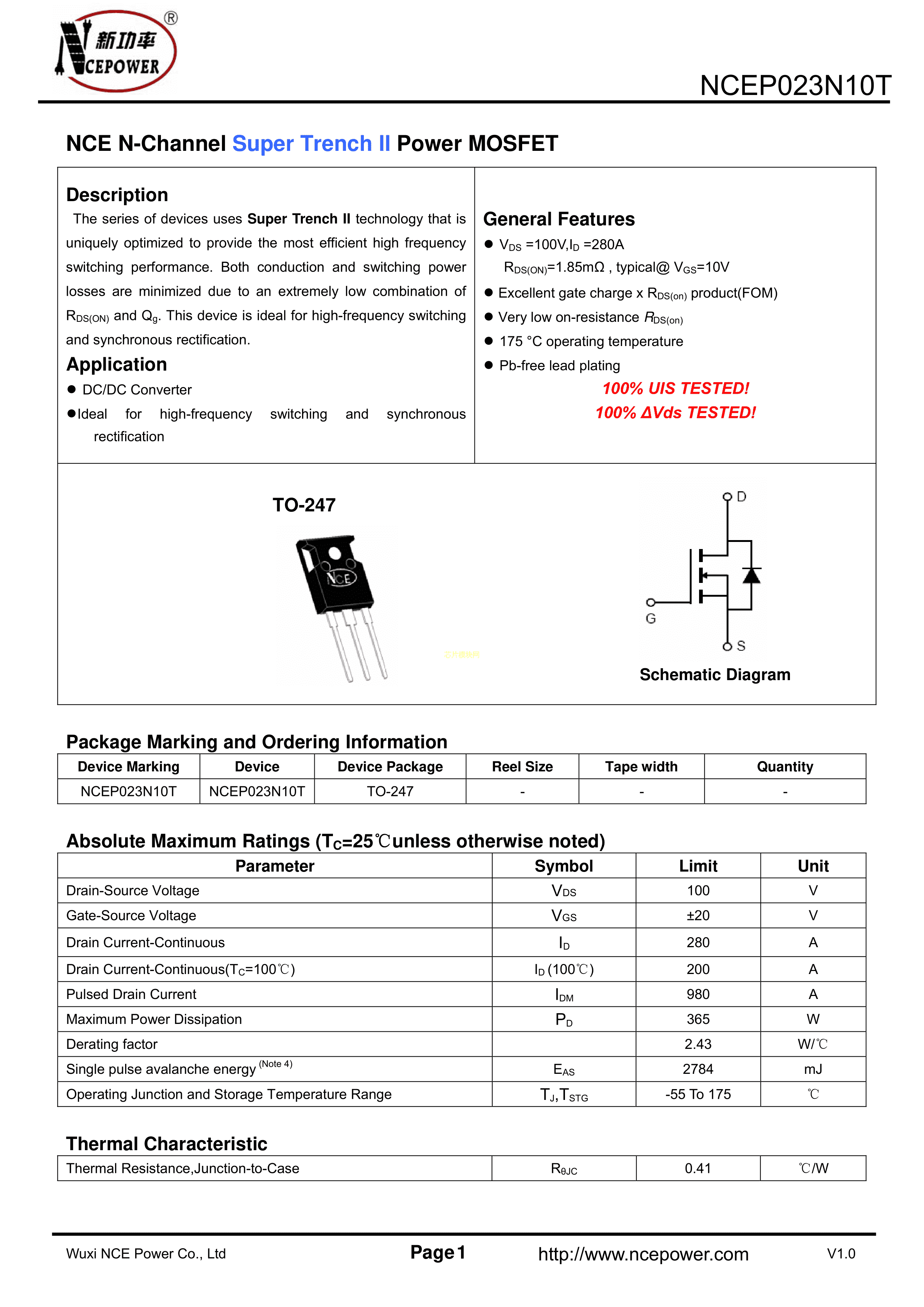 NCEP023N10T数据手册TO-247封装NCE(无锡新洁能)PDF规格书,中英文下载