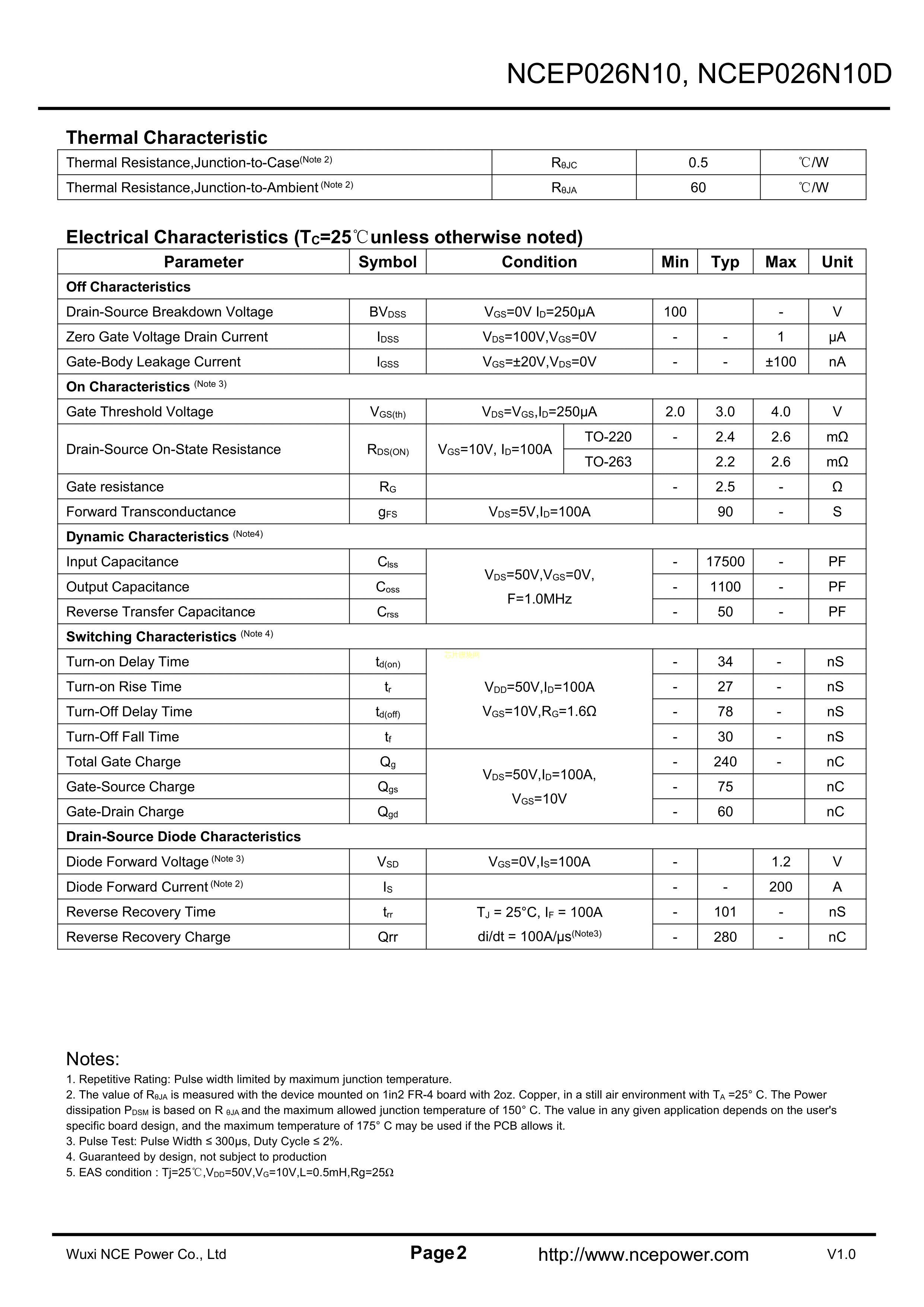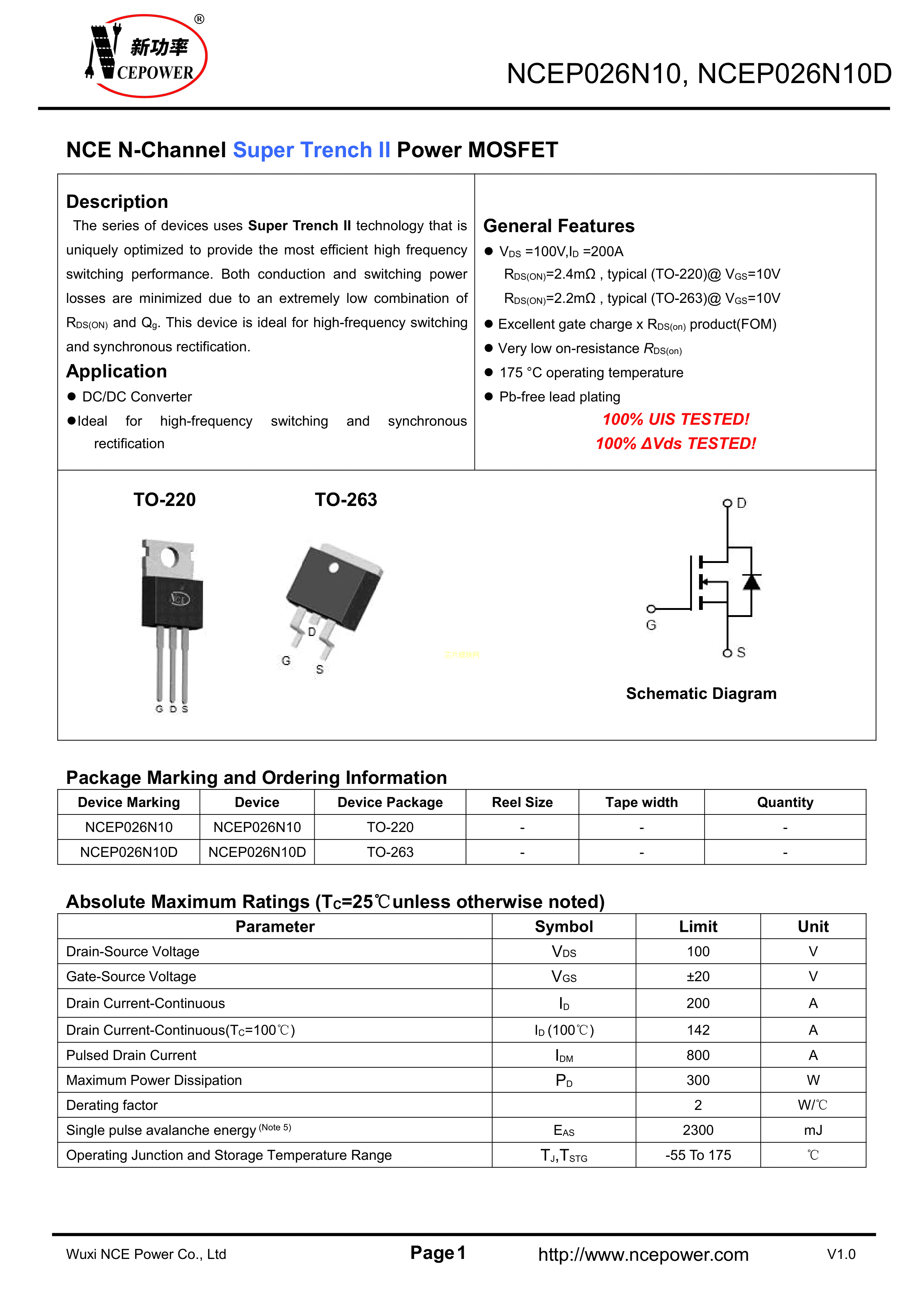 NCEP026N10数据手册TO-220封装NCE(无锡新洁能)PDF规格书,中英文下载