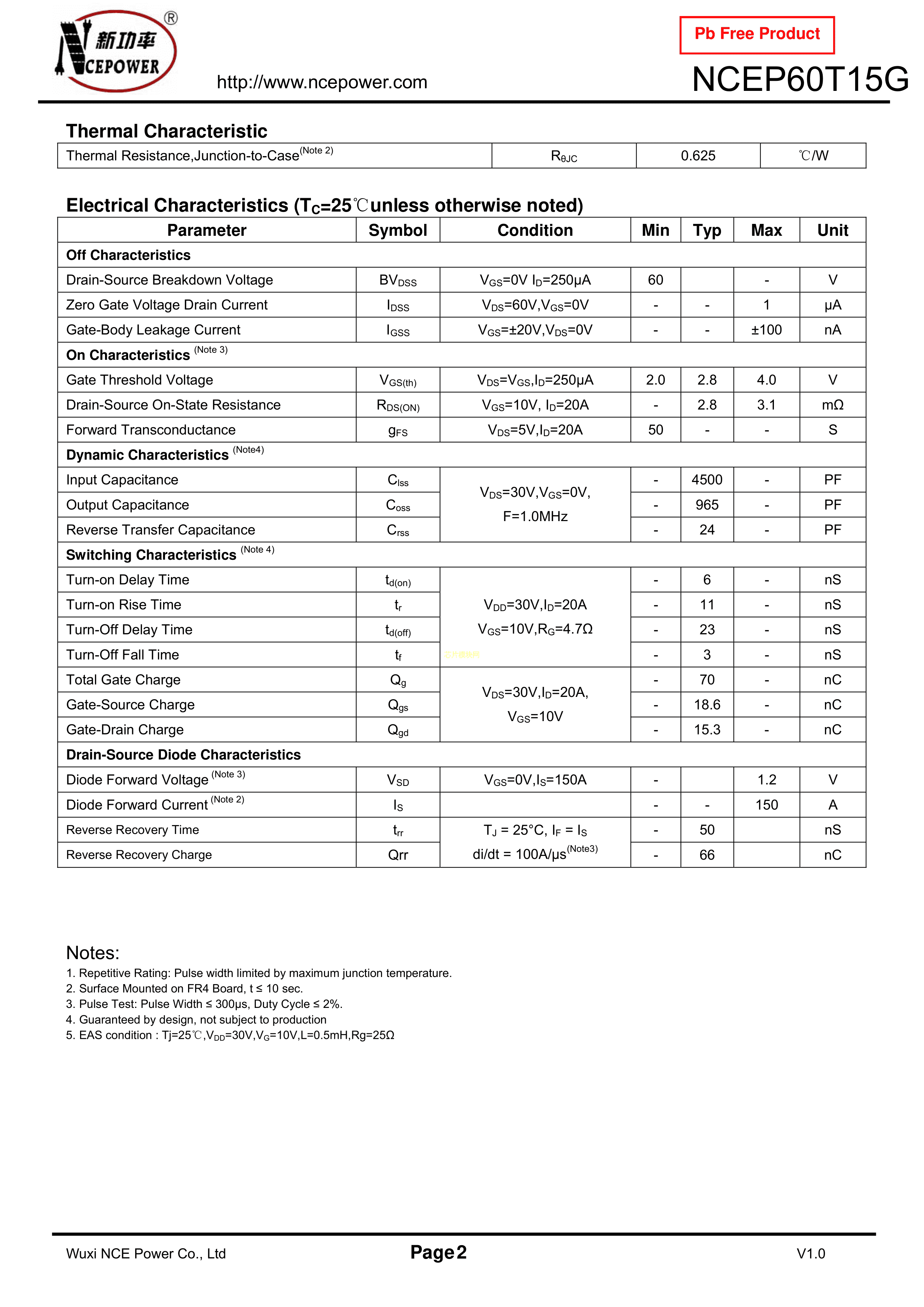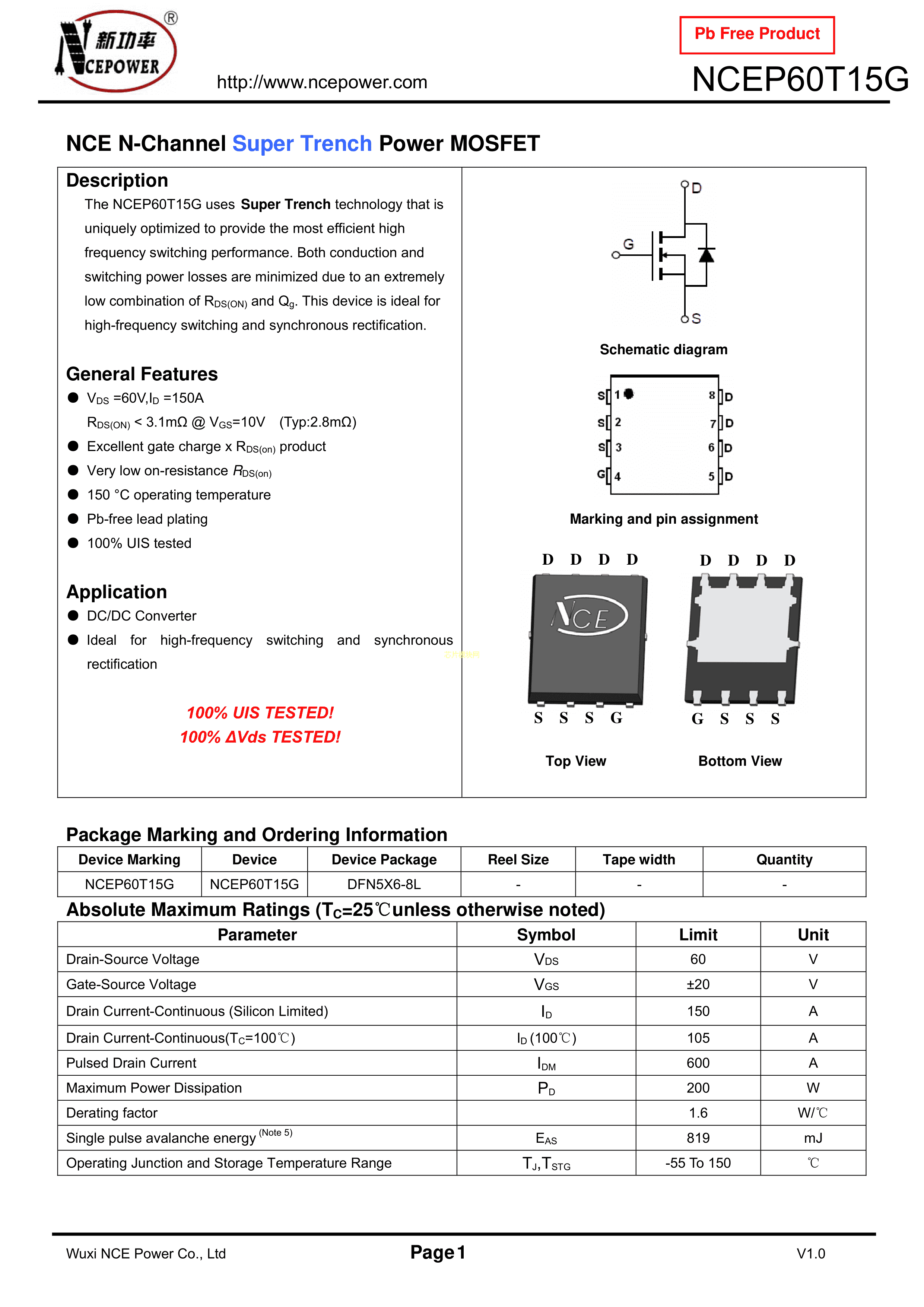NCEP60T15G数据手册DFN5x6-8L封装NCE(无锡新洁能)PDF规格书,中英文下载