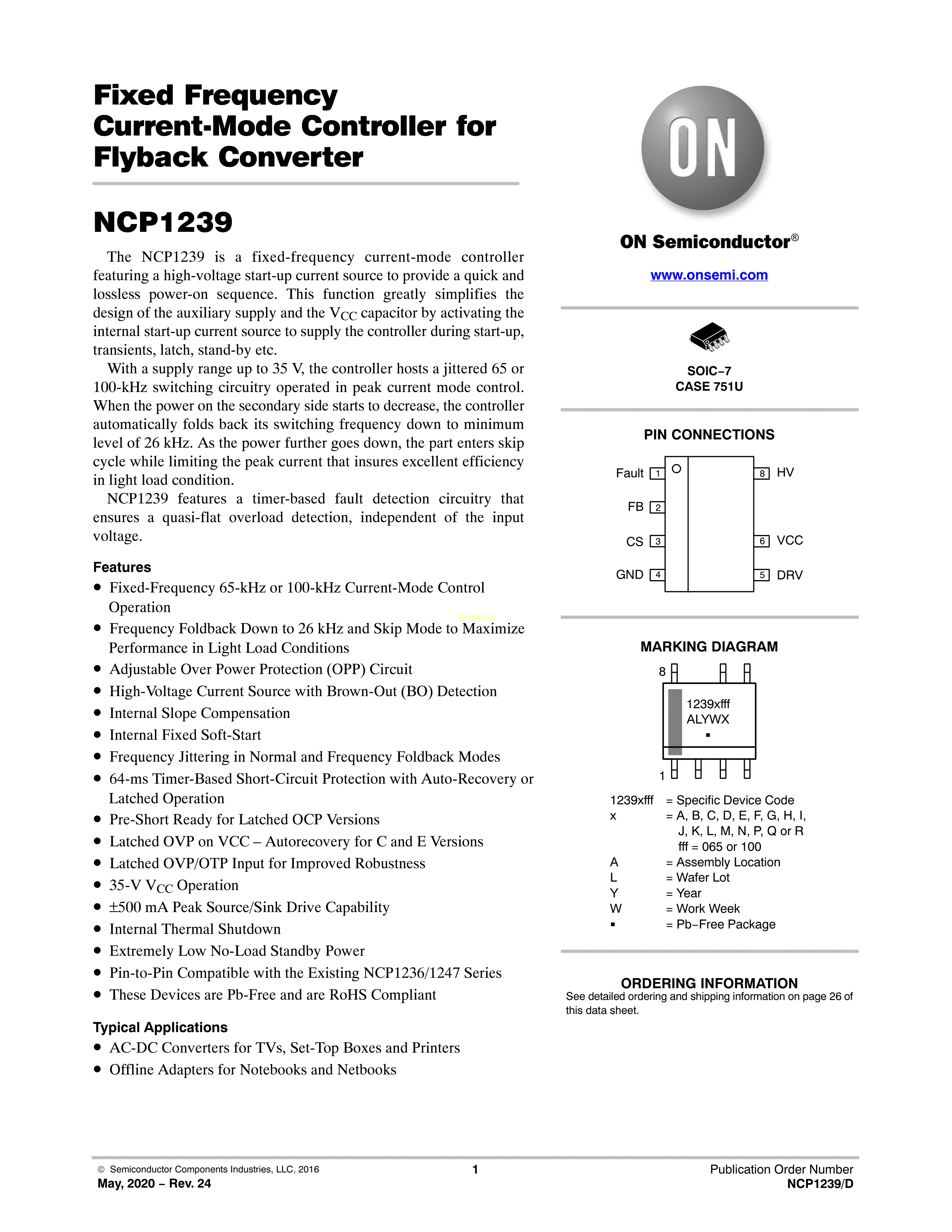 NCP1239BD65R2G数据手册SOIC-7封装onsemi(安森美)PDF规格书,中英文下载