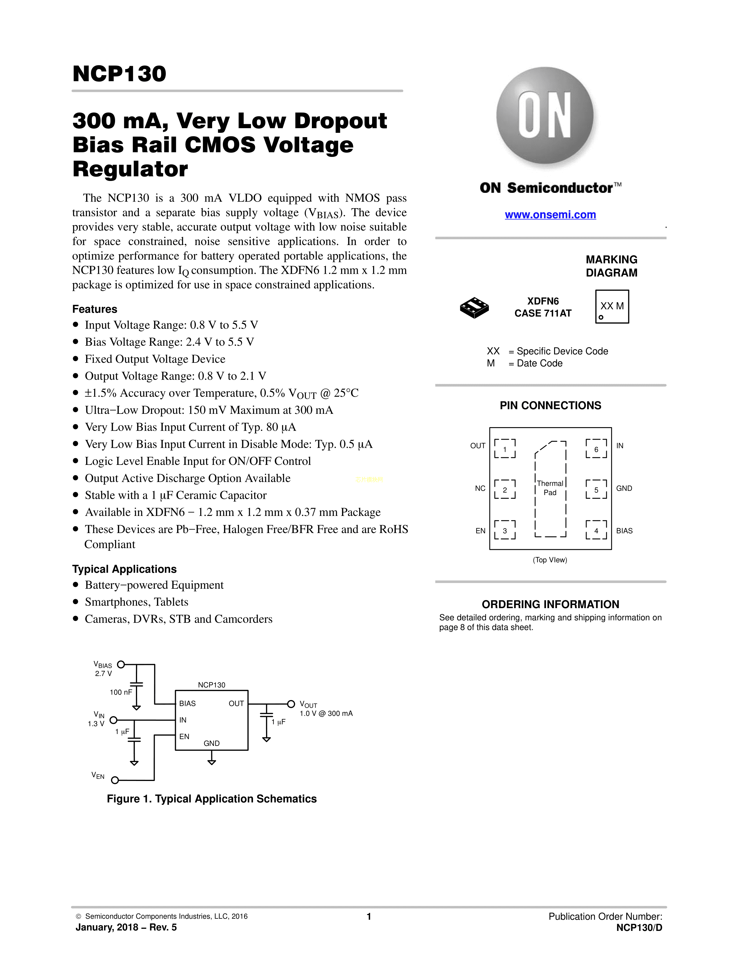 NCP130AMX080TCG数据手册XDFN-6封装onsemi(安森美)PDF规格书,中英文下载