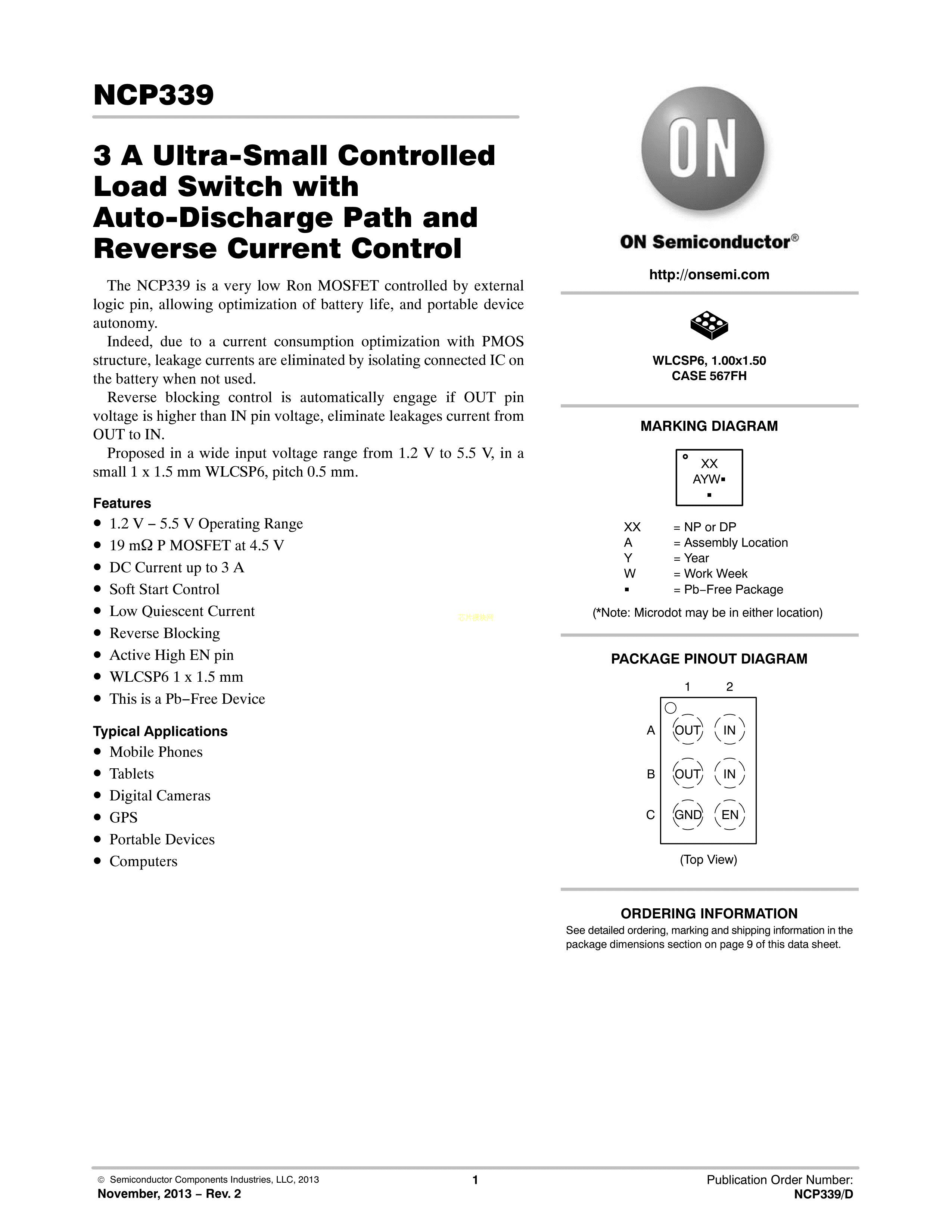 NCP339BFCT2G数据手册WLCSP6封装onsemi(安森美)PDF规格书,中英文下载