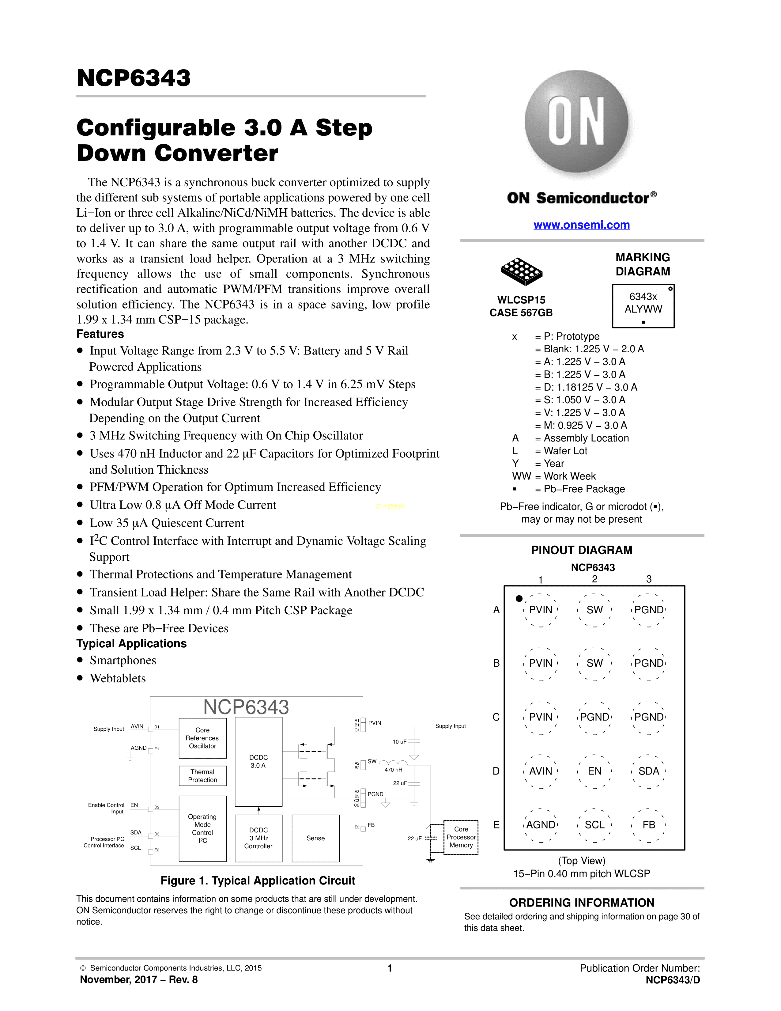 NCP6343BFCCT1G数据手册WLCSP-15封装onsemi(安森美)PDF规格书,中英文下载