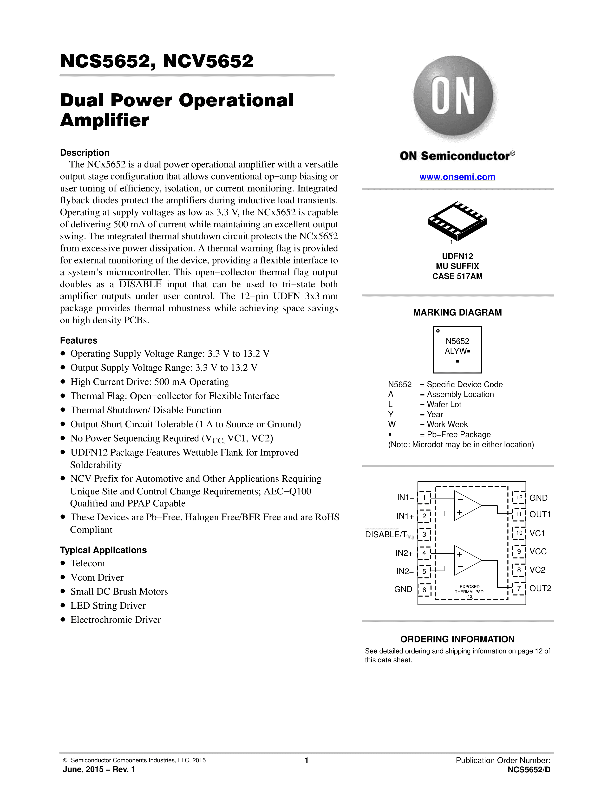 NCS5652MUTWG数据手册UDFN-12封装onsemi(安森美)PDF规格书,中英文下载