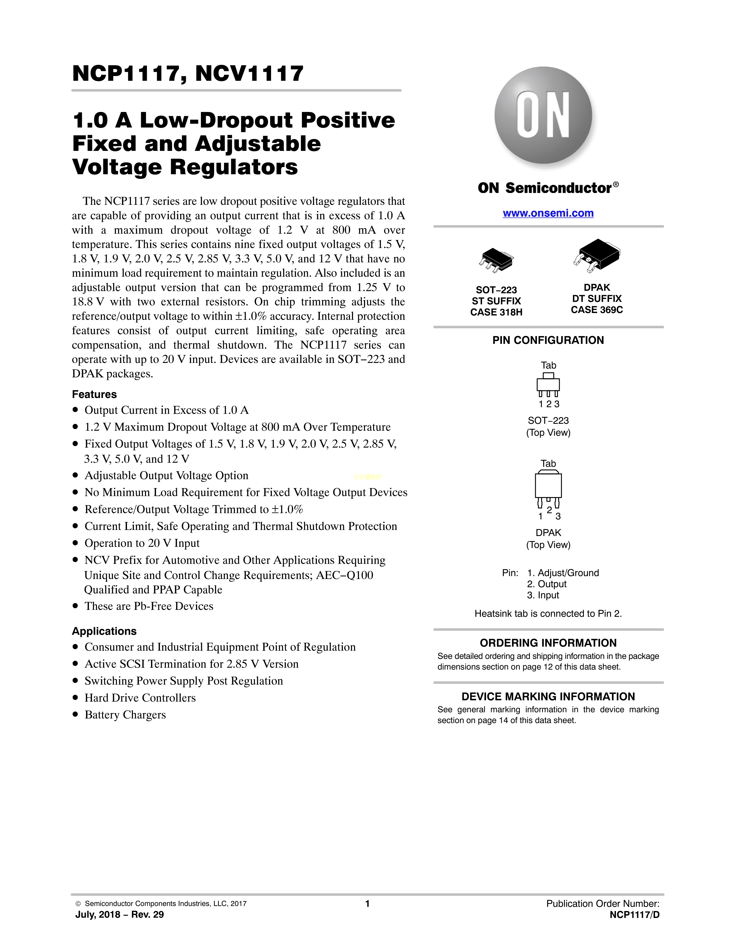 NCV1117DT33T4G数据手册DPAK封装onsemi(安森美)PDF规格书,中英文下载