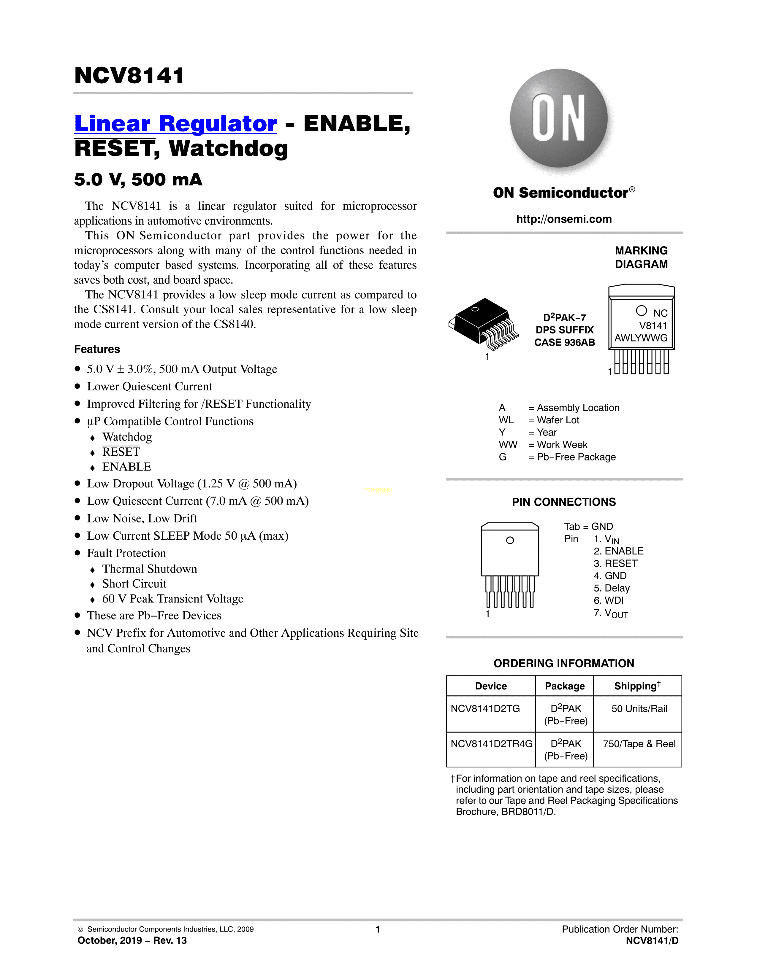 NCV8141D2TR4G数据手册D2PAK封装onsemi(安森美)PDF规格书,中英文下载