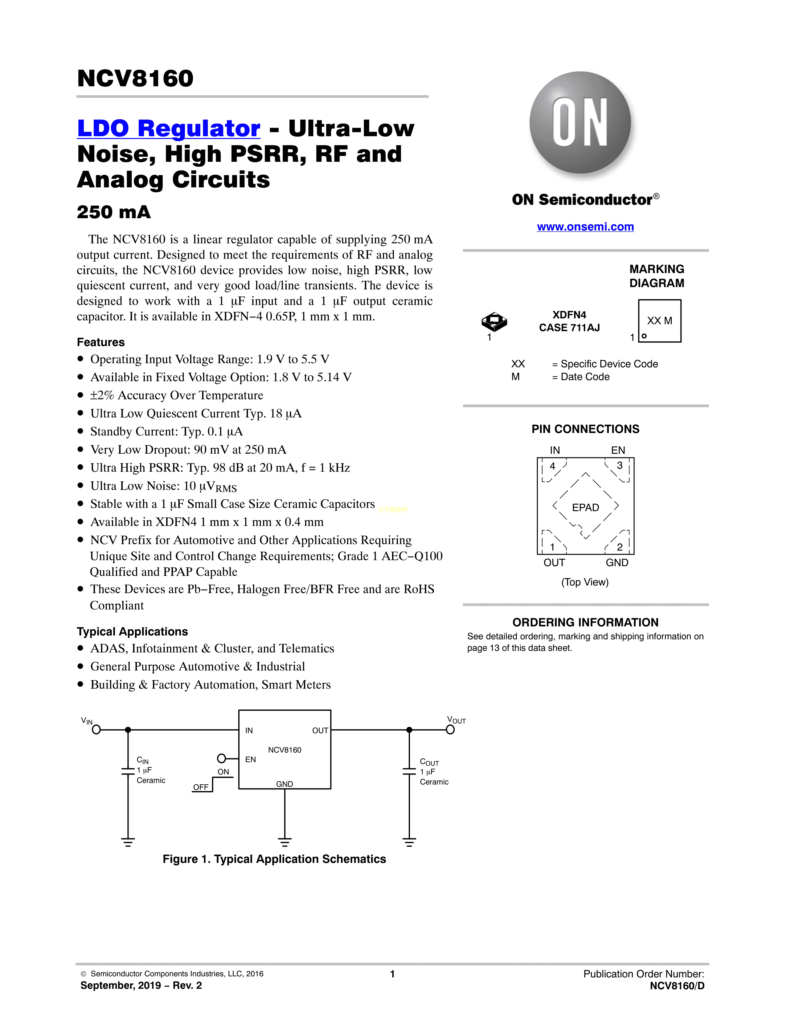 NCV8160BMX250TBG数据手册XDFN-4封装onsemi(安森美)PDF规格书,中英文下