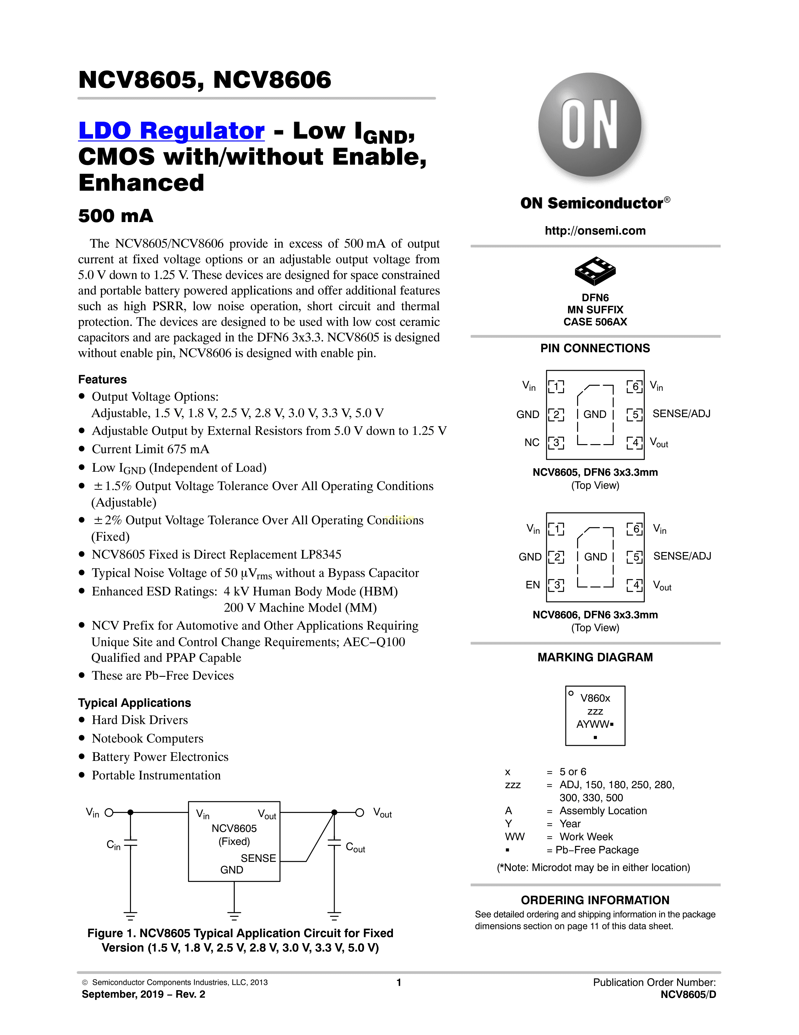 NCV8605MN25T2G数据手册DFN-6封装onsemi(安森美)PDF规格书,中英文下载