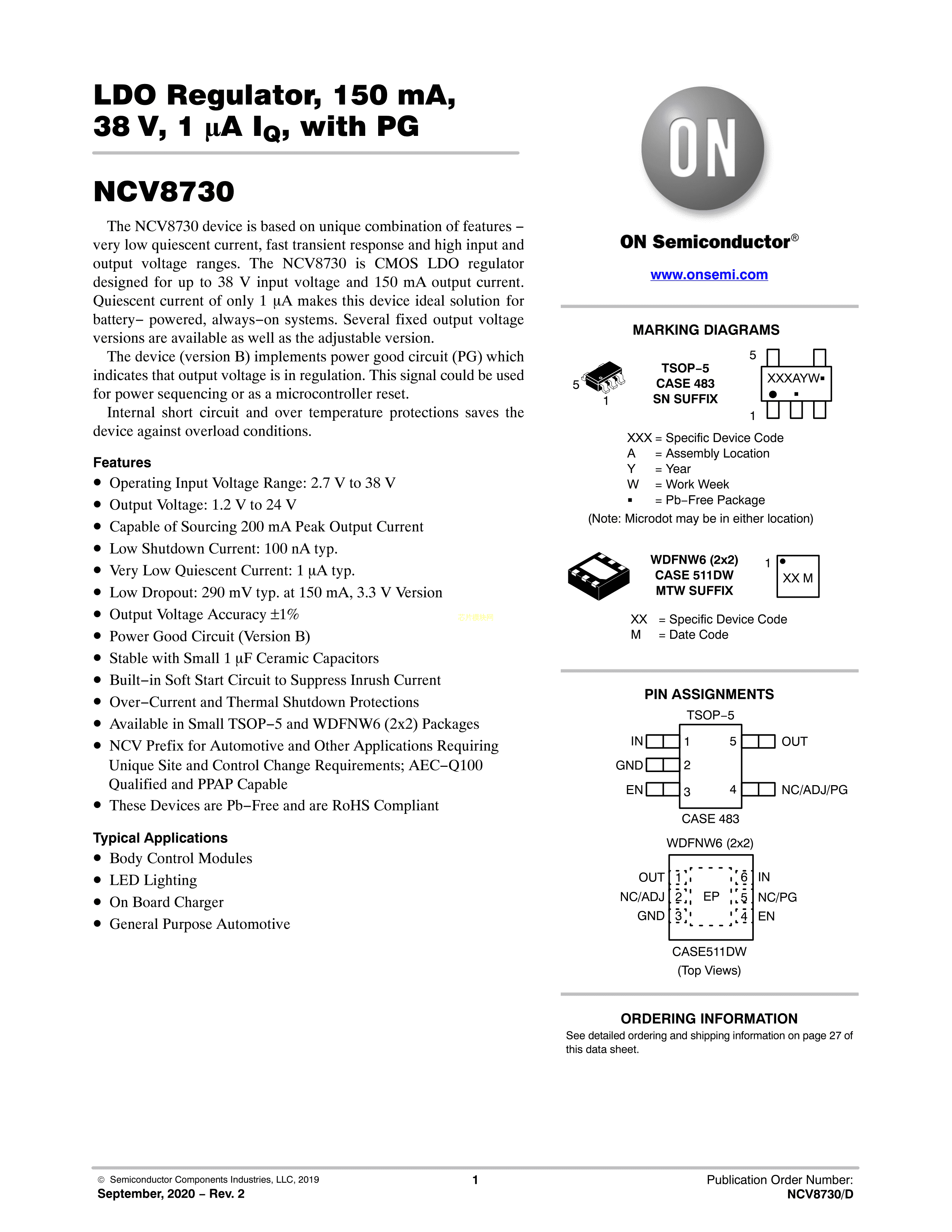 NCV8730BMTWADJTBG数据手册WDFNW-6 (2x2)封装onsemi(安森美)PDF