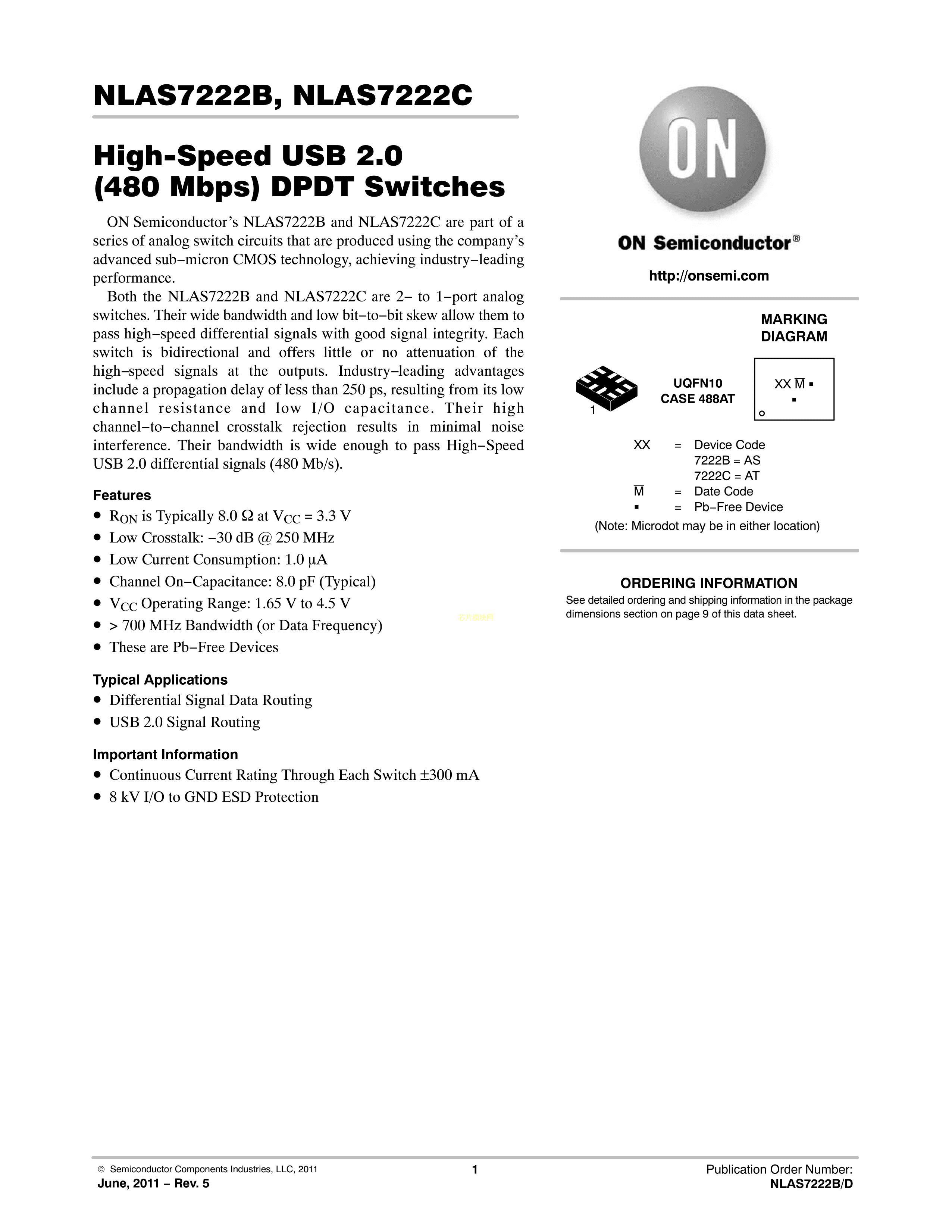 NLAS7222BMUTAG数据手册UQFN-10封装onsemi(安森美)PDF规格书,中英文下载